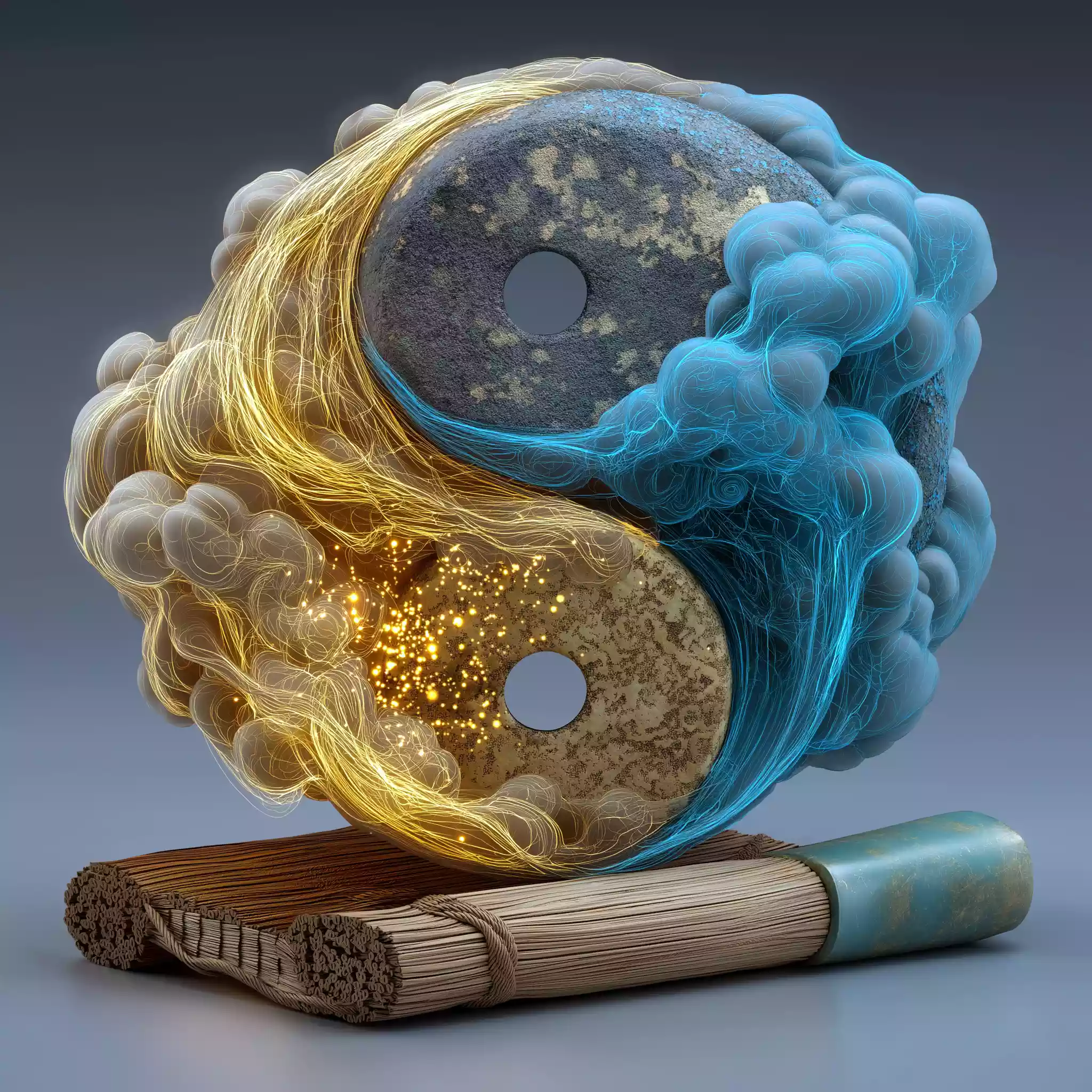 描述:画面中心淡灰色太极雏形缓缓旋转,周围淡金色 “礼” 字(儒家)与淡蓝色 “道” 字(道家)粒子流交融平衡。下方并列淡棕色竹简与淡绿色通透玉石,背景流动白白云气,隐现 “和” 字光影随粒子流明暗。顶光凸显太极旋转与粒子融合,诠释儒道交融。
