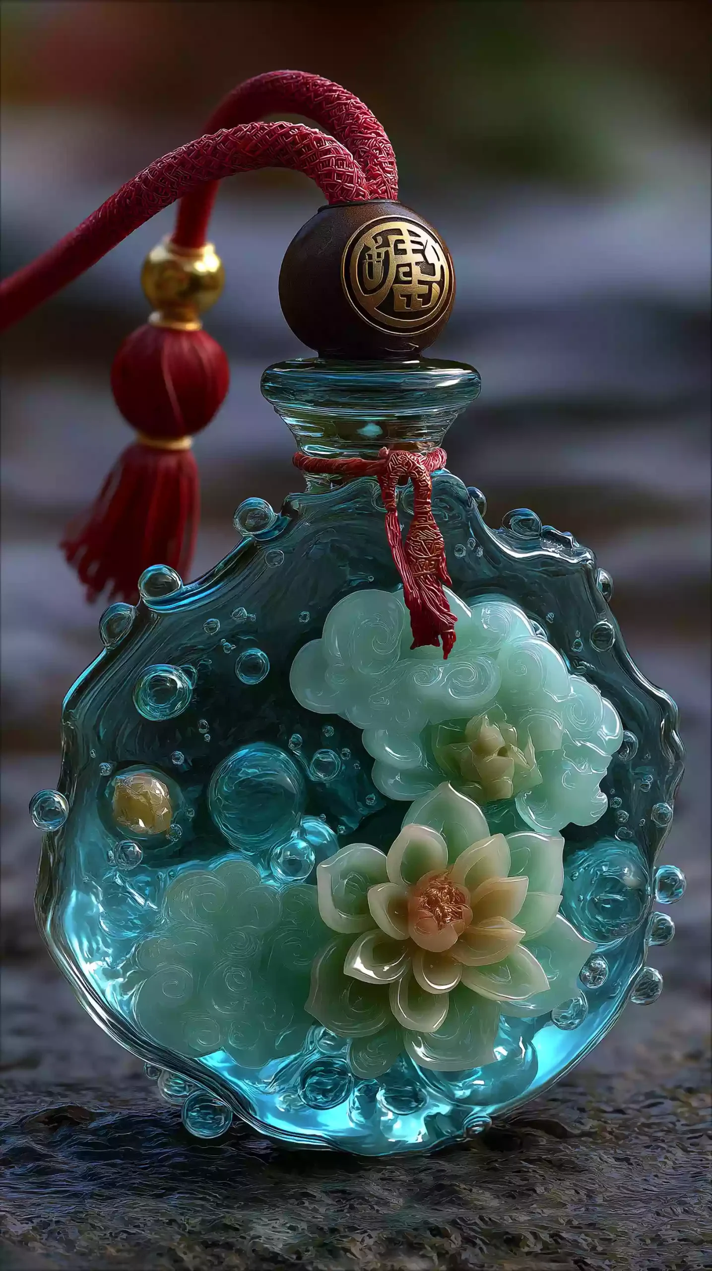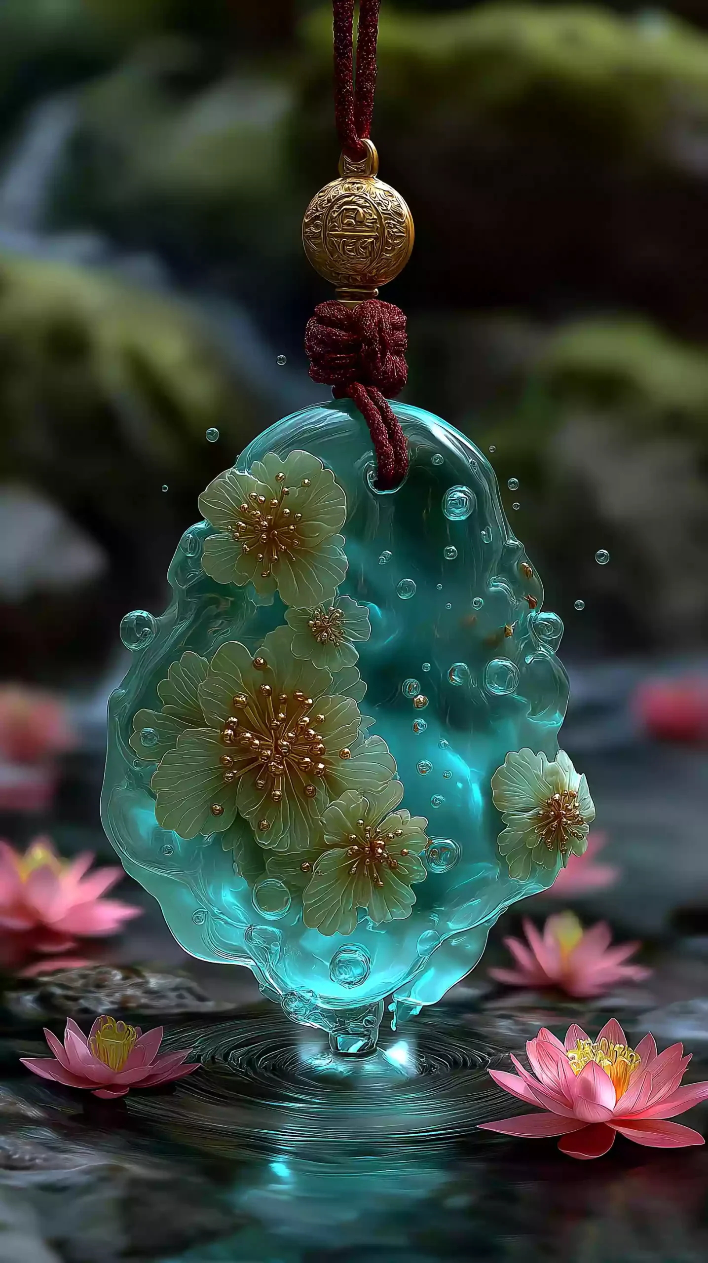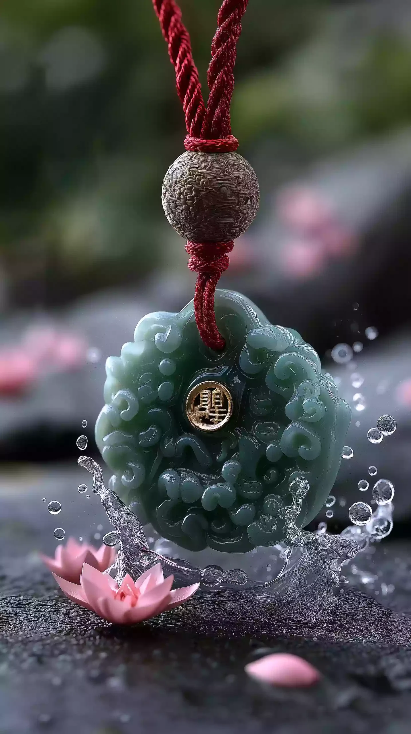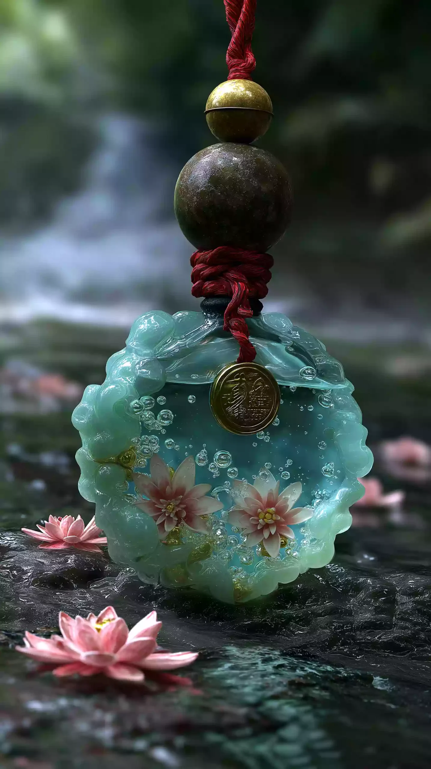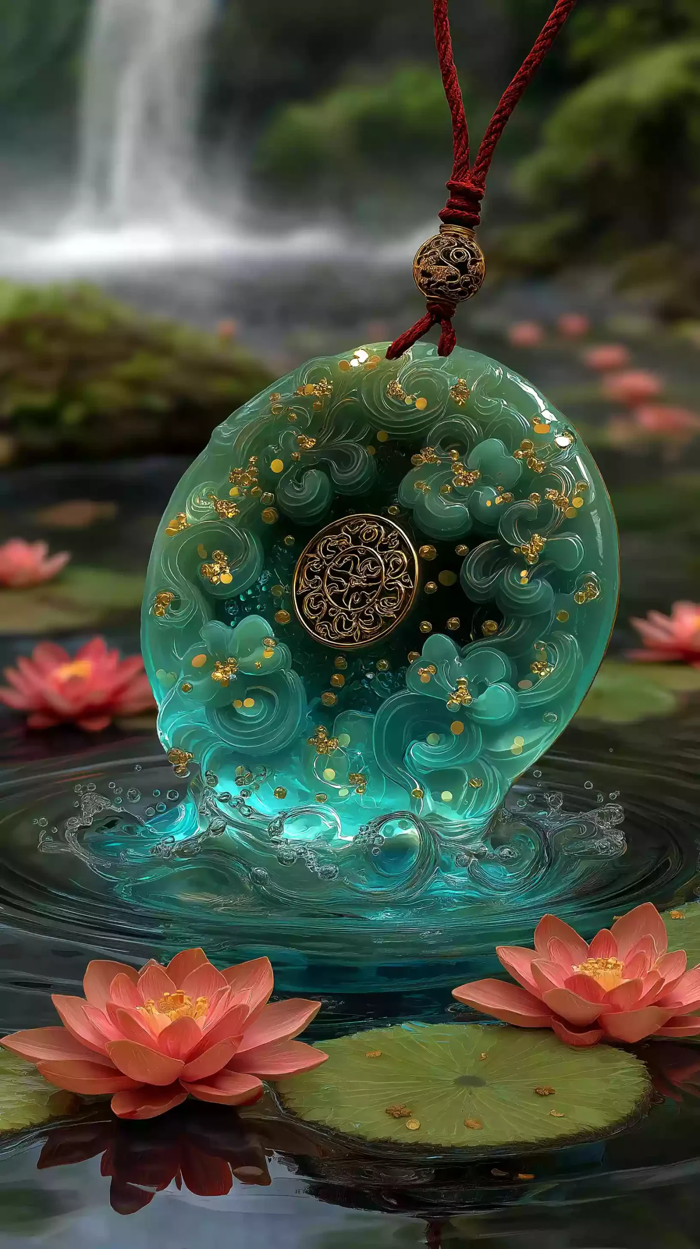 描述:淡蓝江水(暗流)中,绿玉佩(云纹)系红丝绳(魏晋佩饰),周浮泡沫粒子,旁飘荷花瓣。水下隐 “孝” 字,背景江岸白雾,柔焦显孝女悲情。