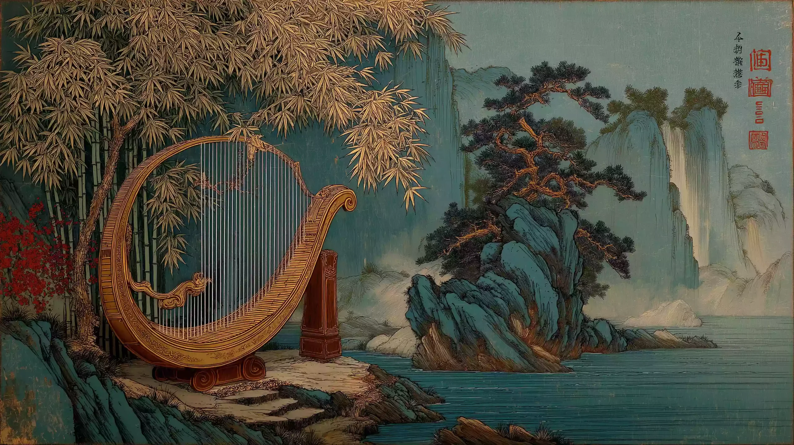 描述:淡灰色竹席上,半透明七弦琴剪影浮绿竹叶粒子。旁有竹简、陶砚,背景隐现山崖与流动白雾,冷色调显放达守礼的隐士风骨。