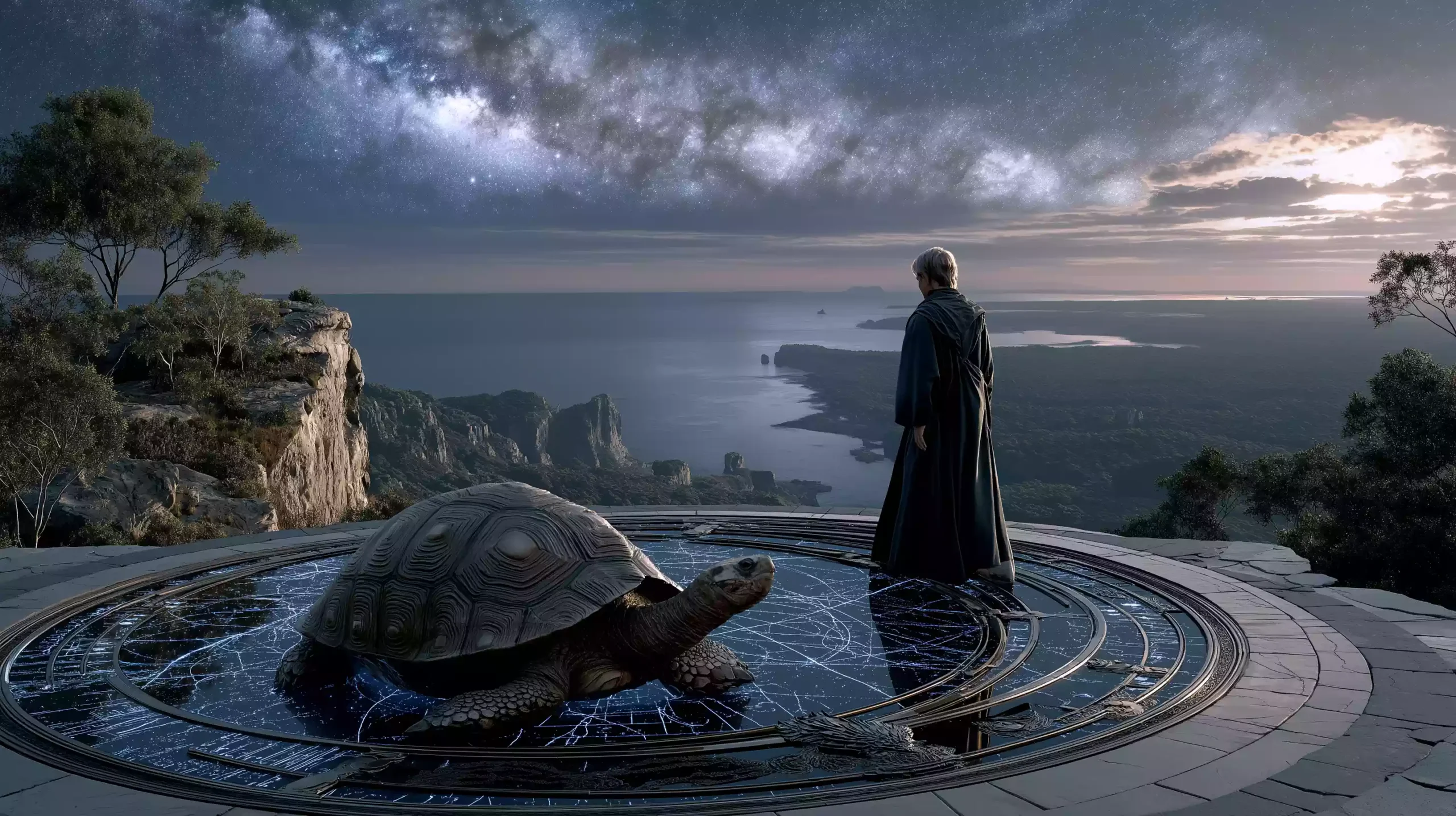画面:悬崖祭台上,星官身着长袍仰首望天,立于刻满星轨的石星盘前。星盘中心龟甲裂纹与星轨重合,银河星光如丝流下,聚焦龟甲使其泛蓝光,演绎天地智慧交汇的神秘场景。