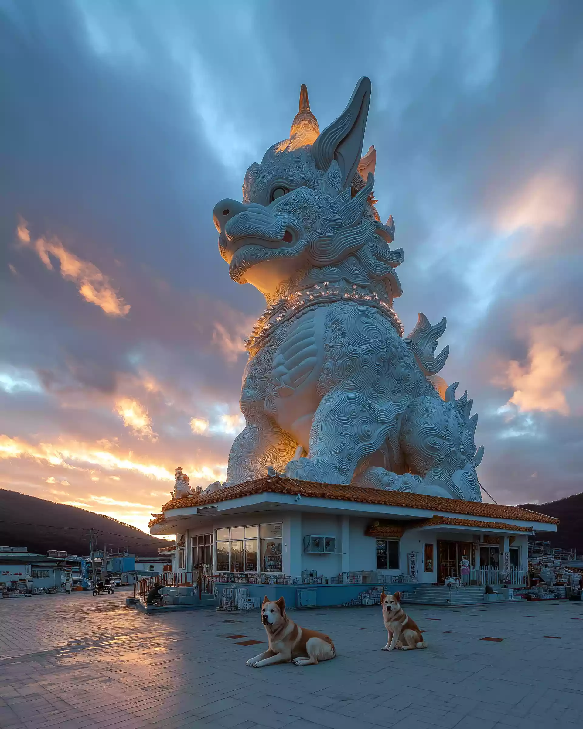 描述:苗寨入口巨大图腾柱,刻龙鳞独角神犬盘瓠,目光如炬俯瞰村寨。夕阳投下长影,基座伏着几只守护的真狗,凸显其作为始祖与守护神的神圣地位。