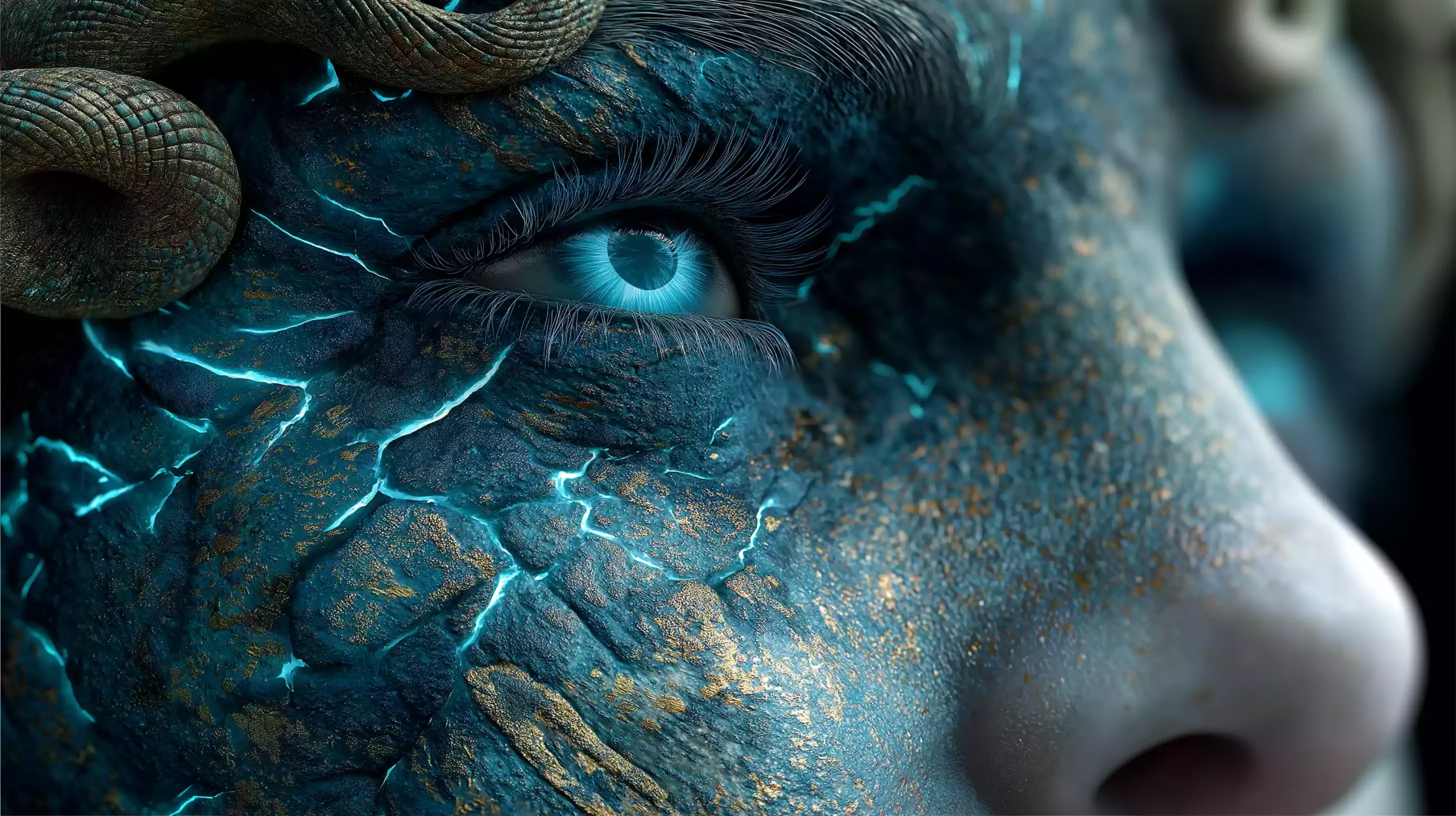 描述:《美杜莎》,古希腊青铜时代蛇发女妖的青灰色蛇发光影如火焰翻腾,蛇瞳为石化射线状水晶纹理,女人面纹覆蛇鳞几何图案,背景是被石化的战士雕像残骸光影,结晶光效烘托 “恐怖与悲剧” 的生物特质。