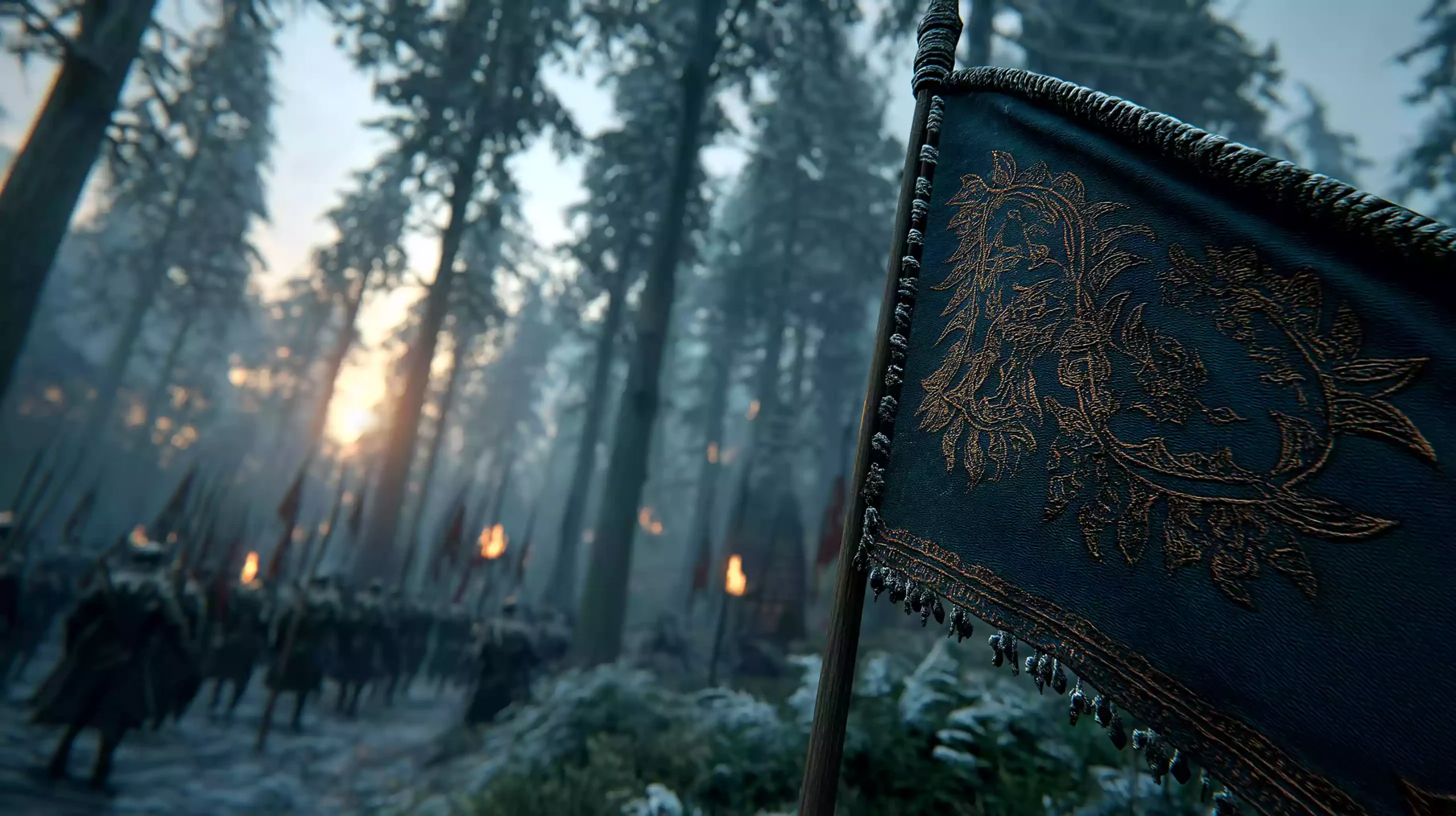 画面:晨雾森林中,黑牛皮战旗(青铜钉、暗金龙纹)被长矛插地,旗面破损带血。雾中无数同款旗帜与军队剪影静默行军,冰冷晨光穿透雾气照亮旗上寒霜,肃杀又神秘。