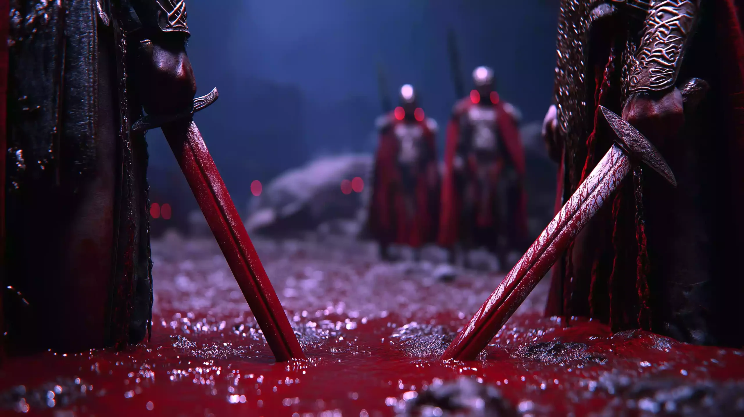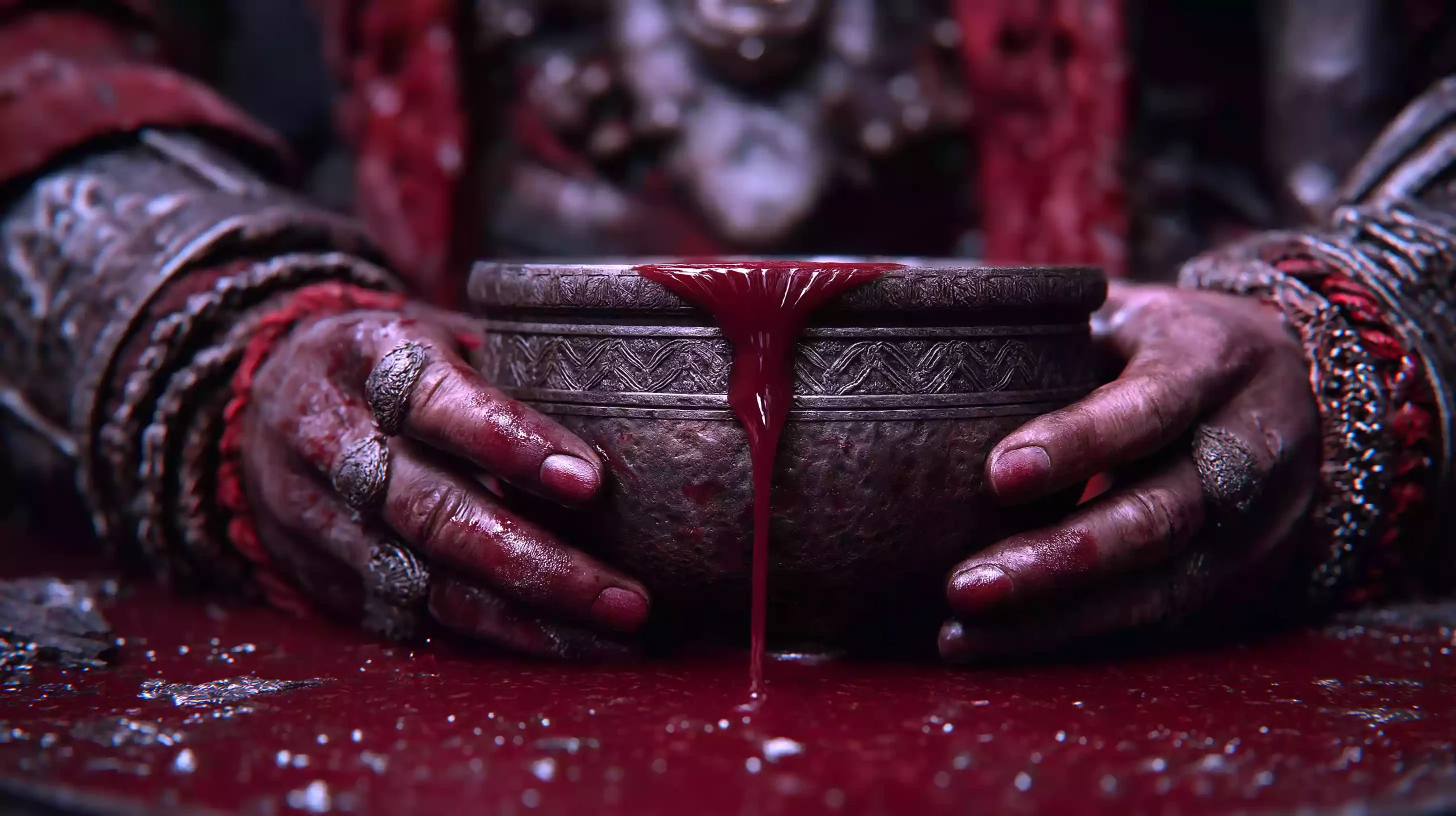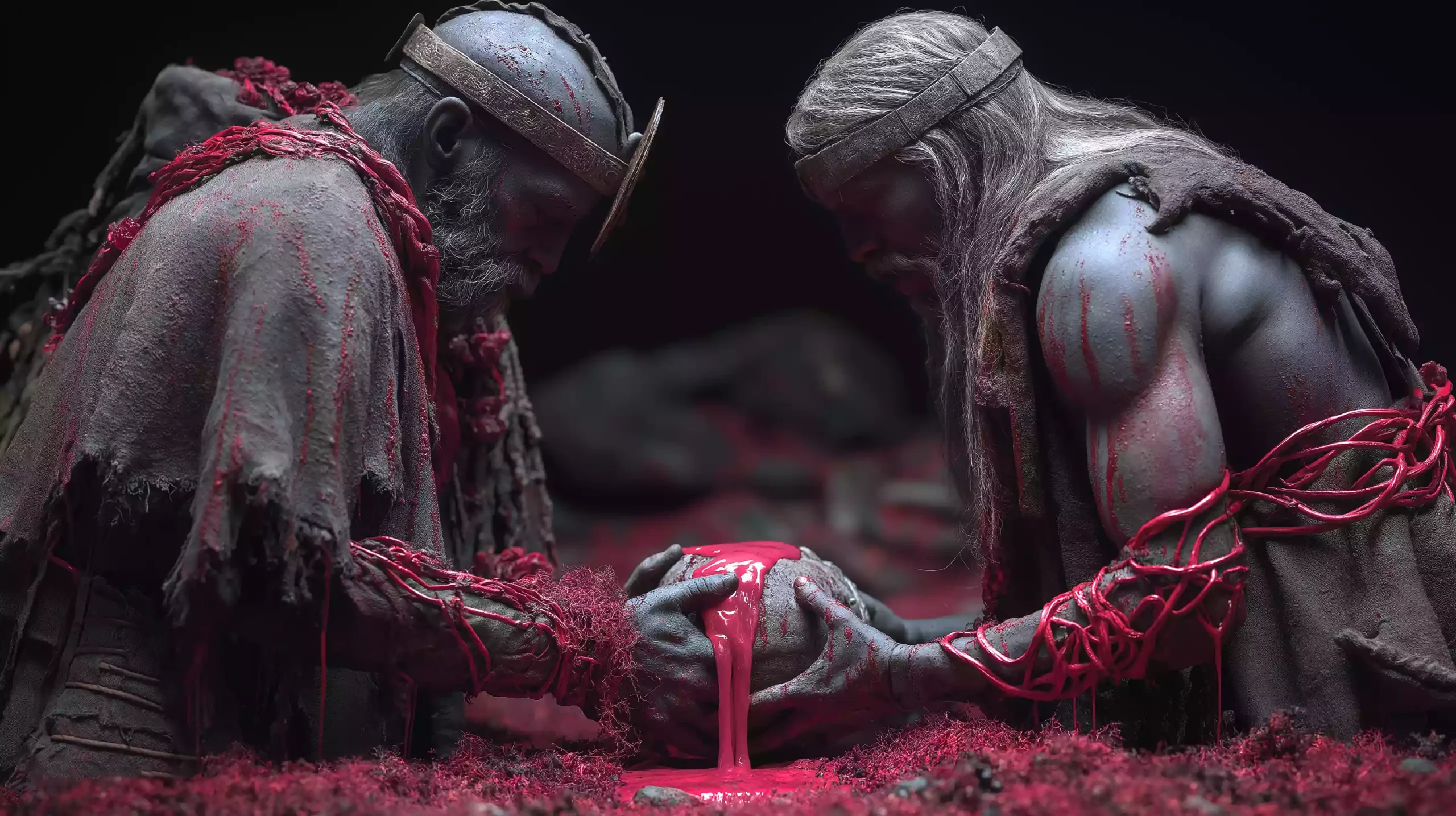 描述:低角度拍摄两部落首领面对面,交臂握牛角杯行血盟礼。血酒混合液倾洒大地,瞬间被吸收,长出发光红蔓藤缠绕脚踝,象征大地见证的不可破盟约,场面庄重有力。
