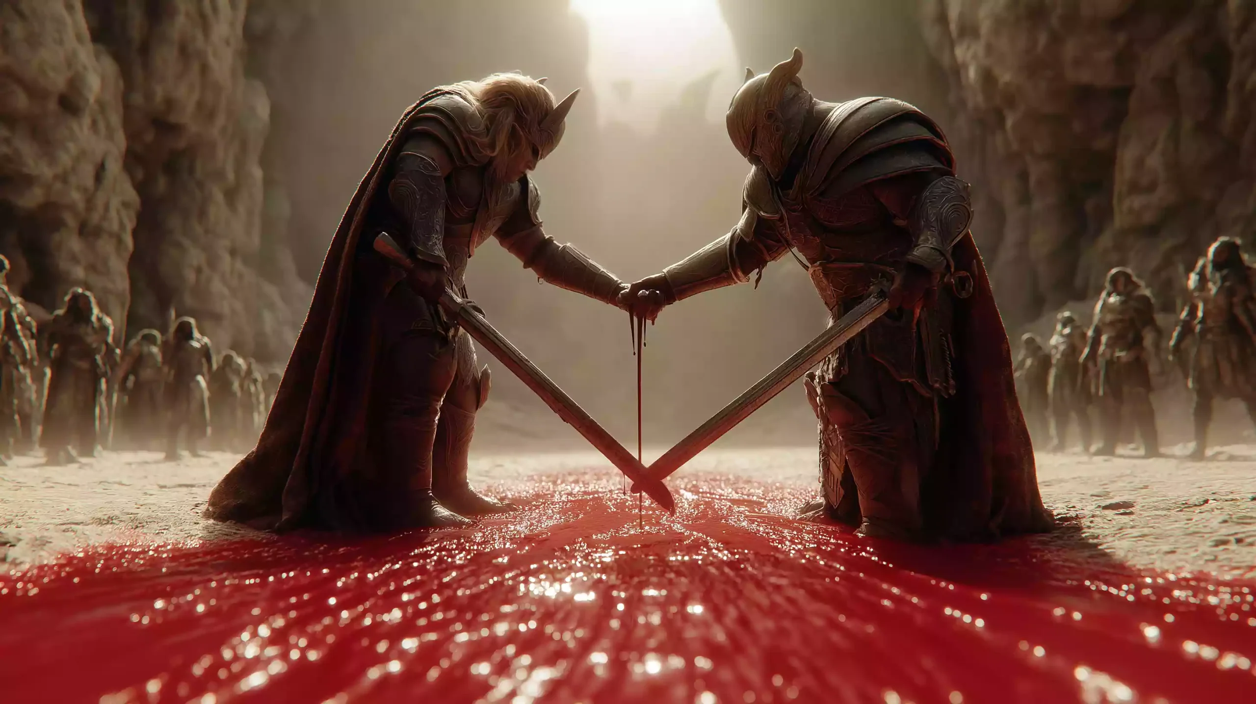 描述:低角度拍摄两部落首领面对面,交臂握牛角杯行血盟礼。血酒混合液倾洒大地,瞬间被吸收,长出发光红蔓藤缠绕脚踝,象征大地见证的不可破盟约,场面庄重有力。