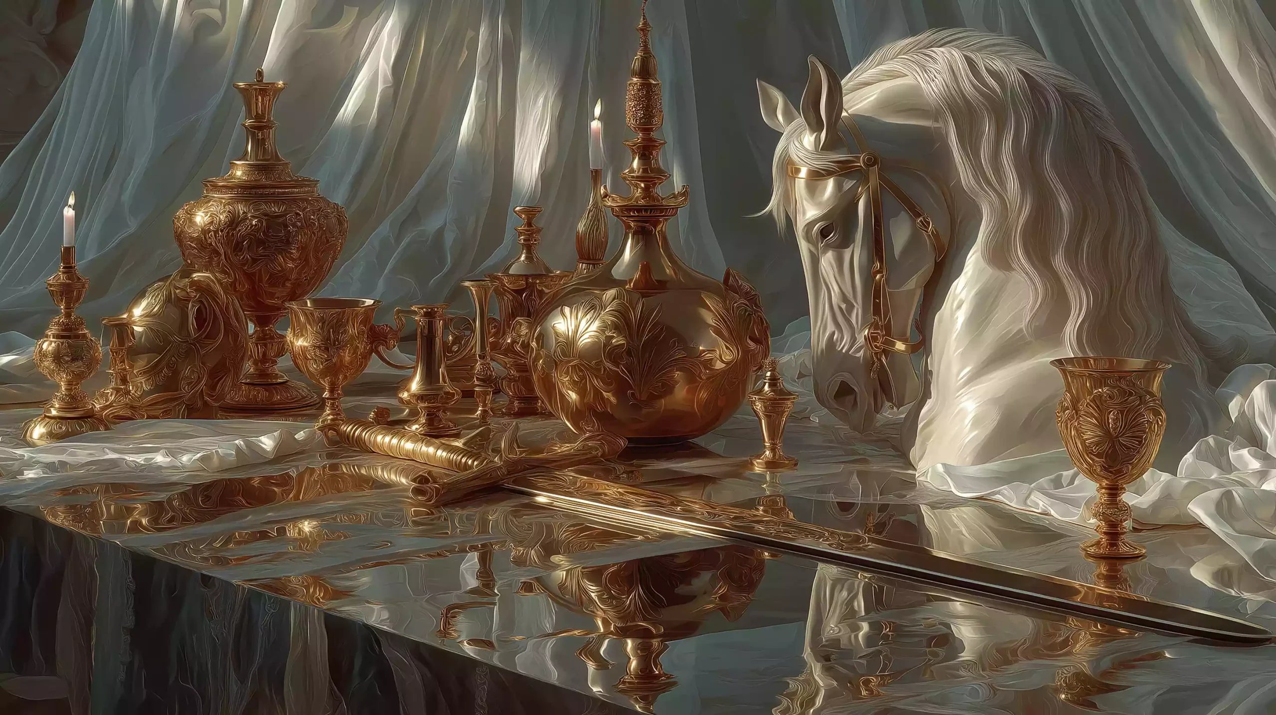 描述:《达摩克利斯之剑》,古希腊青铜时代权力警示寓言的寒光利剑光影用单根马鬃悬挂于宴会桌上方,桌面金银酒杯光影映出剑刃倒影,背景中君主抽象光影举杯微笑,阴影光效诠释 “权力的危险与警示”。