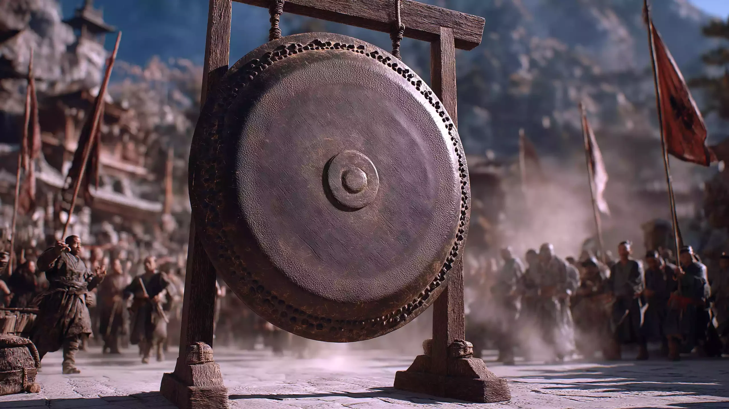描述:村寨广场木架悬巨铜鼓,鼓手挥臂敲击,鼓声化为金色声波扩散,吹动旗帜与衣角。人们从四方奔来汇聚,画面动感十足,尽显部族凝聚力。