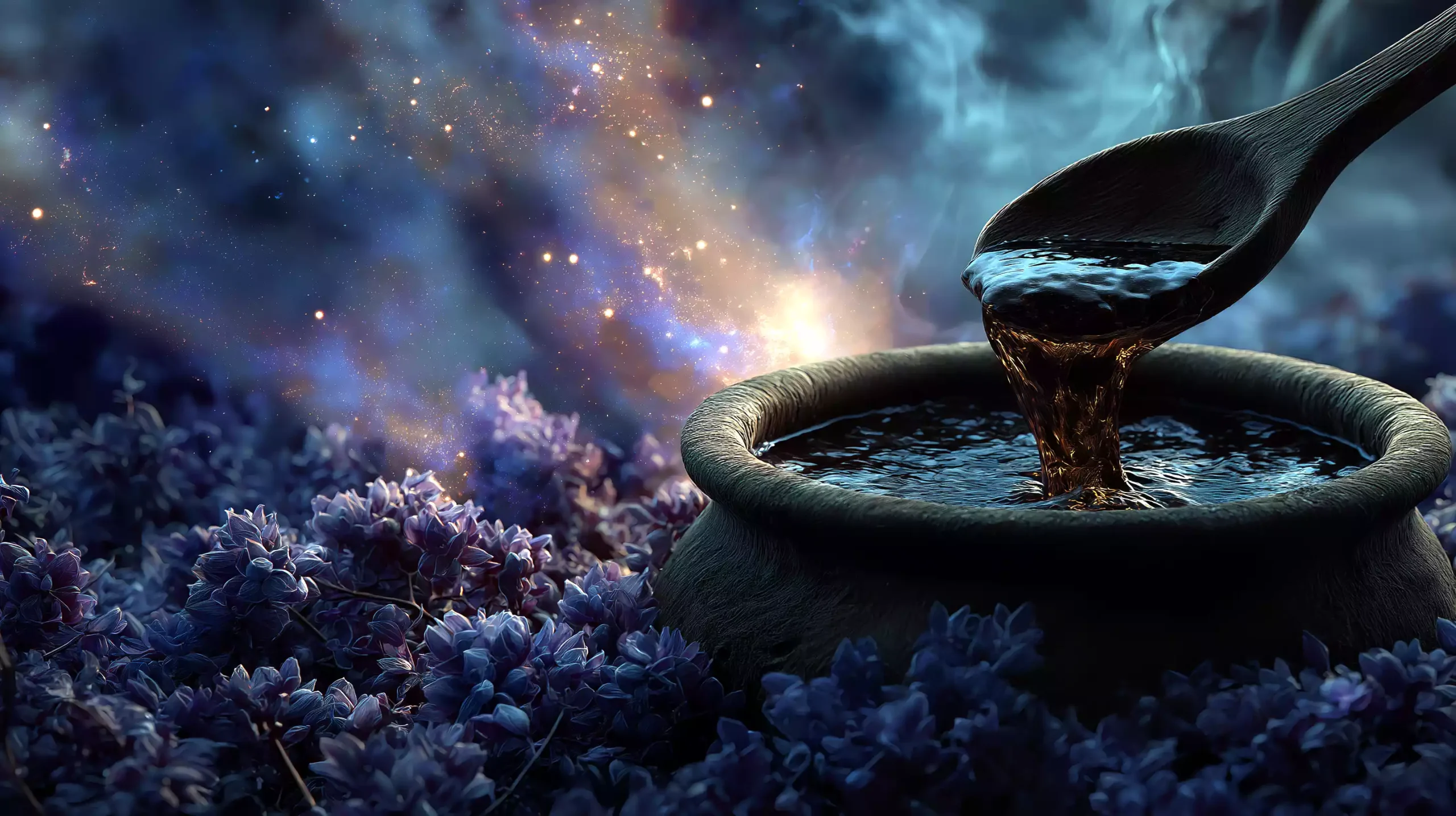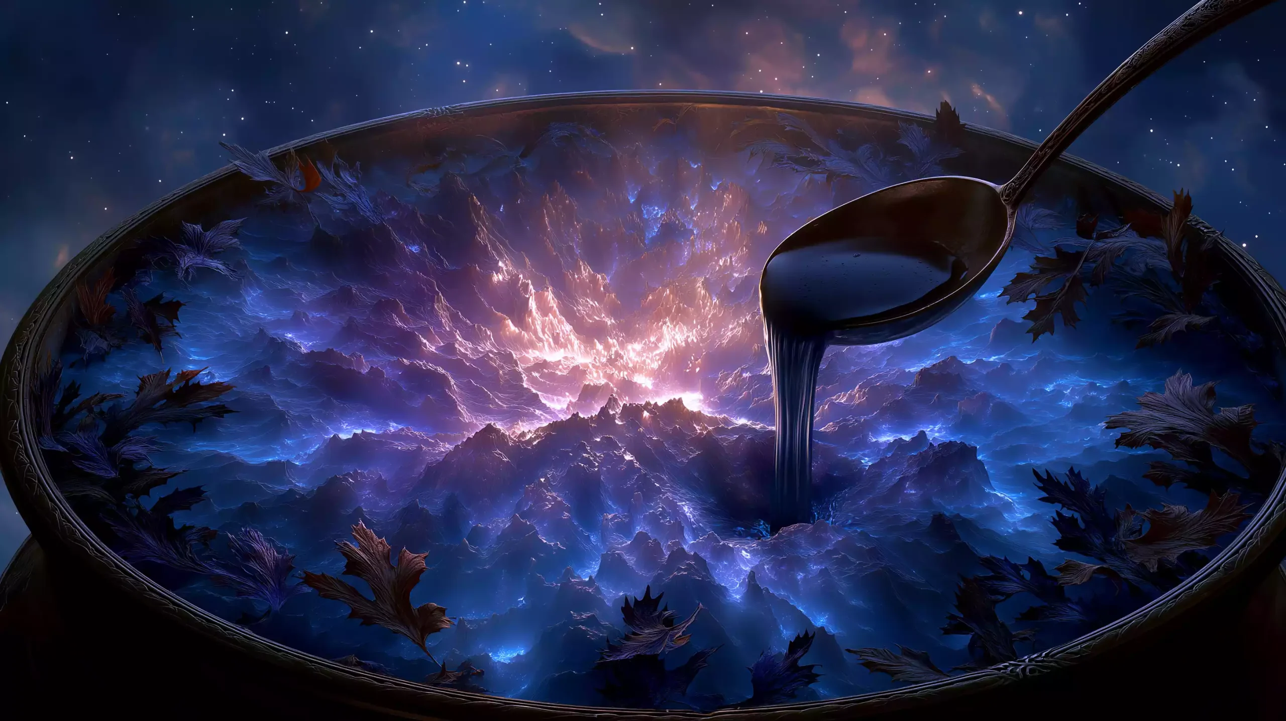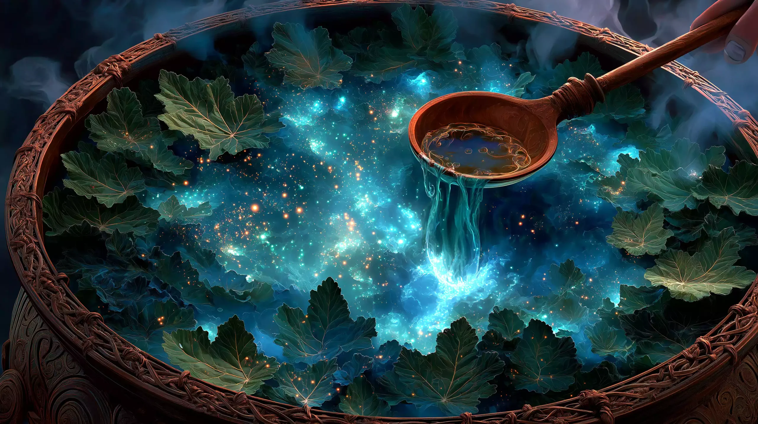 描述:凯尔特巨神达格达搅动星云物质坩埚,木勺滴落编程、医疗、农业等液态技能胶囊;青年用橡树叶承接服用,凯尔特结能量场环绕,演绎跨领域技能融合创新。