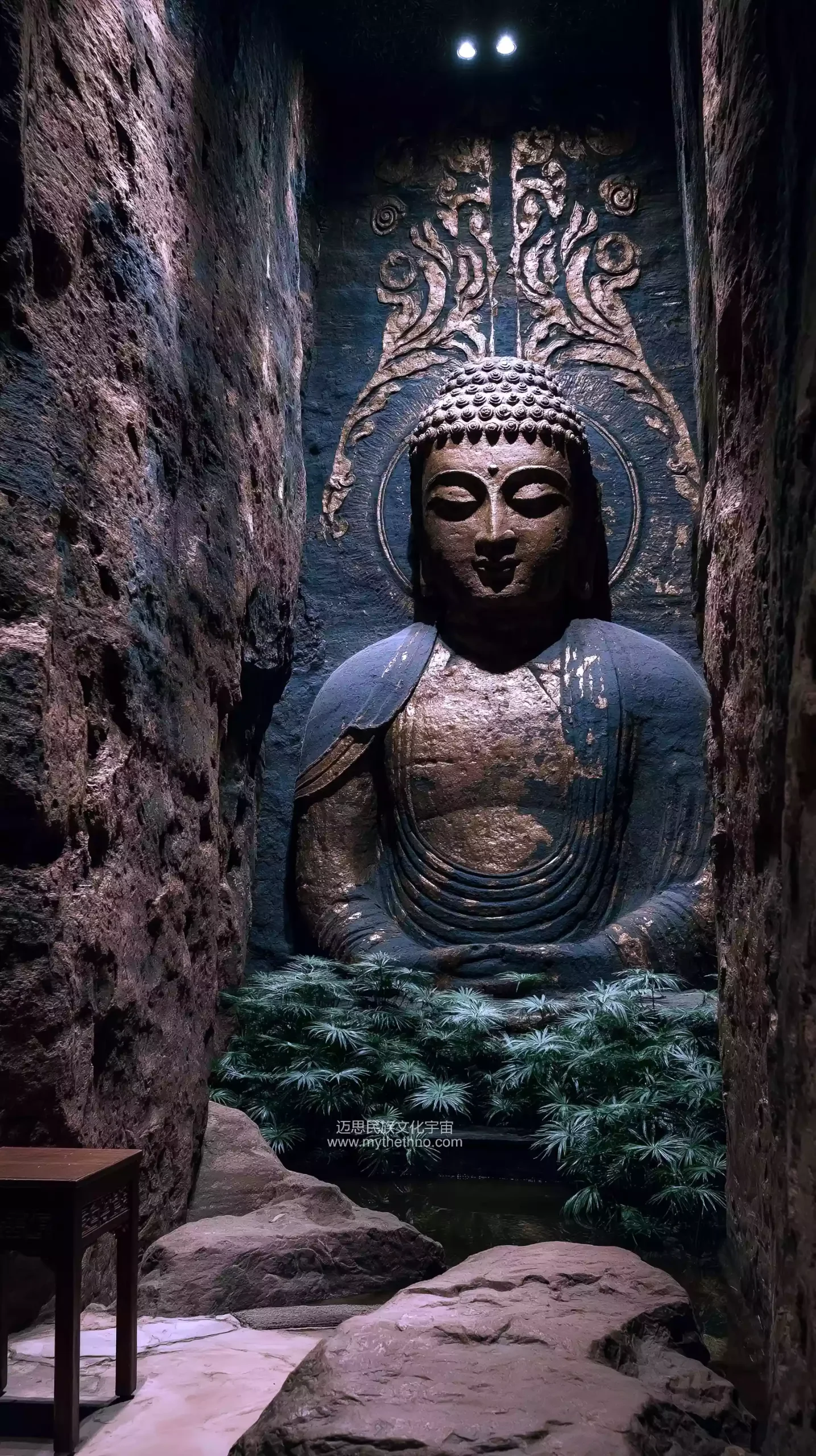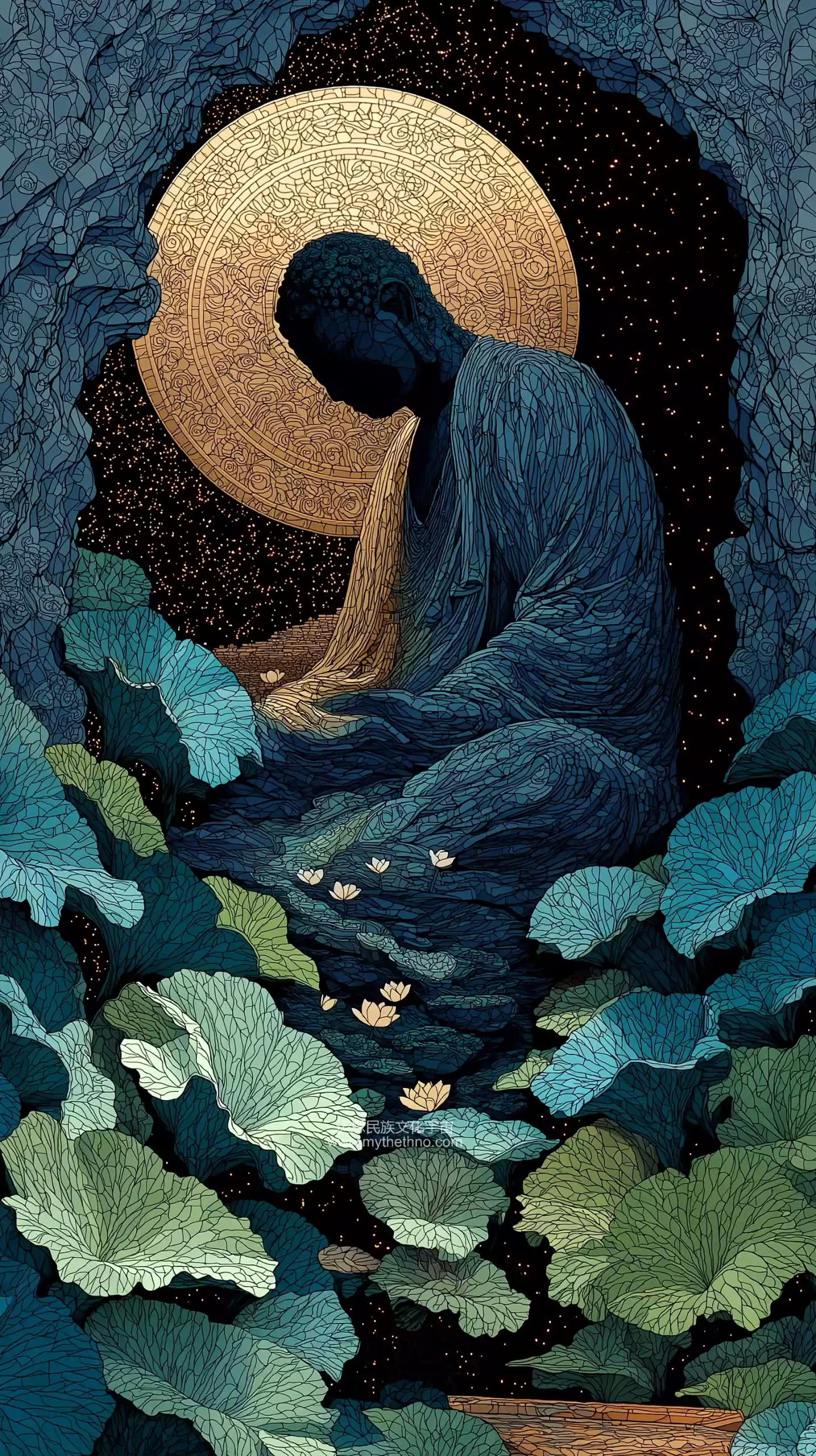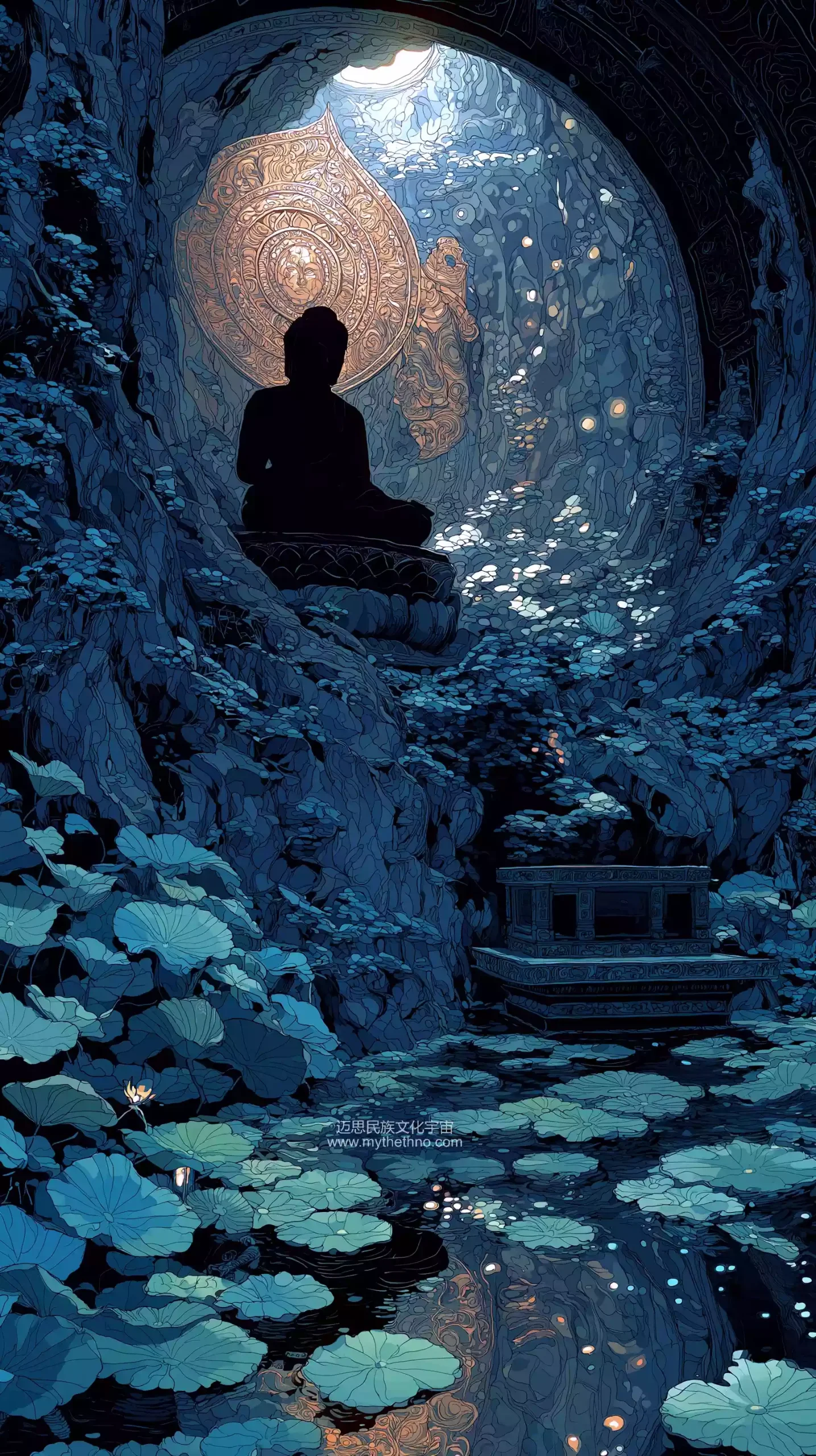 描述:《云冈石窟・释迦诞生》,贴合魏晋云冈石窟佛教艺术(释迦诞生是核心题材)。画面以深灰石窟岩为底(带凿痕),中心淡金佛影(坐姿衣褶,无面,绕白诞生圣光);佛下岩上浮绿莲花粒子,左有淡白经幡剪影,右放淡棕香案(上有 3 支白香烛轮廓);背景隐黑石窟穹顶,淡金光斑穿缝落佛影,光中浮白诞生光纹,侧光显石窟庄严。