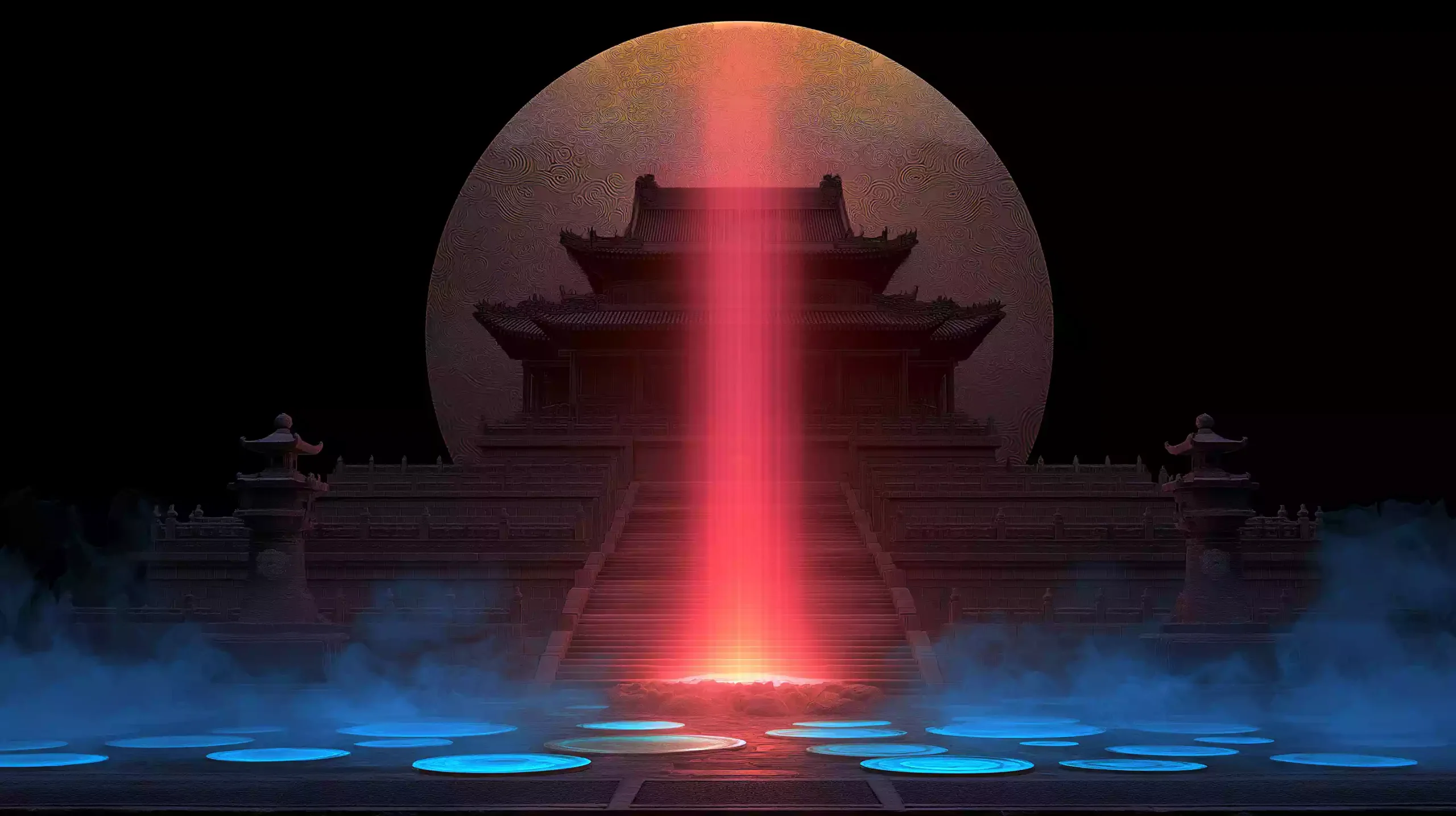 画面:背景淡金色明堂殿堂轮廓(圆顶方基座),中央淡红色光柱象征 “礼”,周围青铜编磬弧形剪影,其间淡蓝色声波纹理象征 “乐”。下方淡棕石阶散落通透绿玉璧,周围白雾流动代表礼乐氛围,逆光使光柱穿透雾气形成丁达尔效应,氛围庄严和谐。