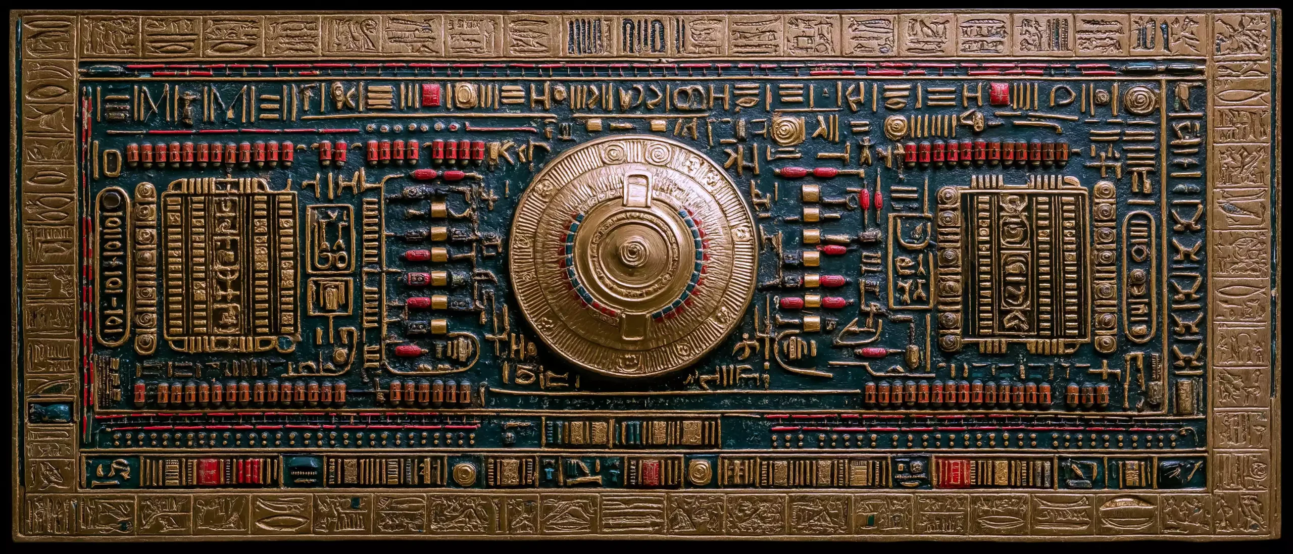 描述:《亡灵书服务器》,以古埃及(公元前 3100 年 – 公元前 332 年)亡灵信仰为核心,悬浮的纸莎草展开电路纹路 —— 纸莎草是《亡灵书》载体,电路象征现代服务器。象形文按钮控制木乃伊数据流,圣甲虫群(灵魂引导者)搬运心脏秤数据包,背景冥河化作闪烁的光纤。画面将《亡灵书》的来世指引与数据存储结合,重构古埃及 “灵魂不灭” 的科技化表达。