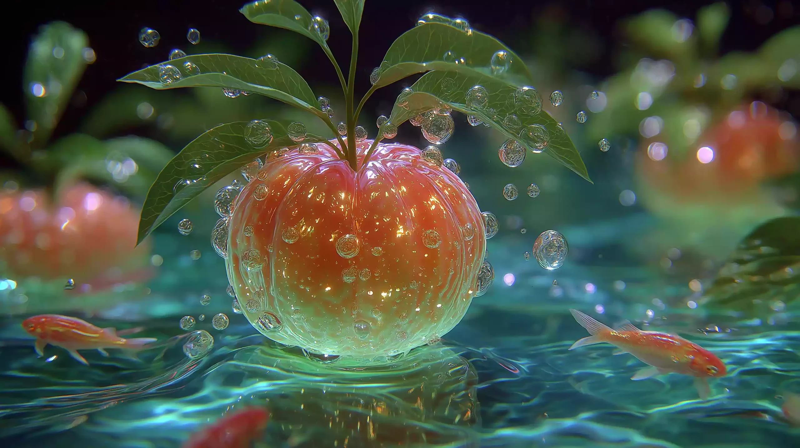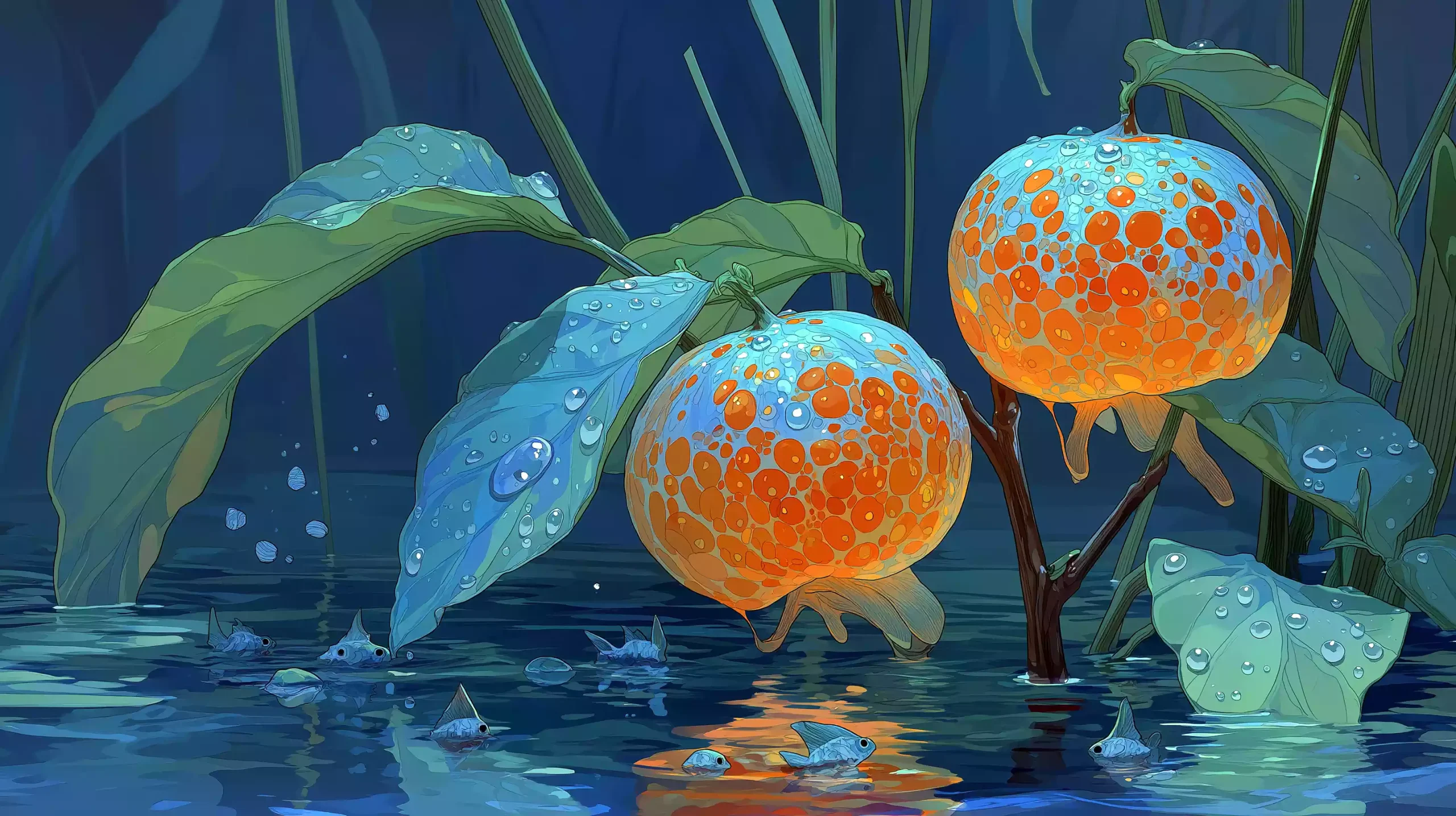 描述:《仙草之失》,公元前 3000 年 – 公元前 8 世纪两河流域苏美尔《吉尔伽美什史诗》的叙事框架中,水晶植物的发光果实(象征永生仙草)悬浮水面,下方银色鱼群虚影掠过,鱼尾扫得果实倾斜,滴落发光液滴。水面涟漪揉碎楔形文字的倒影,岸边芦苇丛(苏美尔湿地标志)随风摇曳,叶片沾微光。画面精准捕捉 “仙草被蛇偷走” 的瞬间动态,光影柔和却满含遗憾,呼应该时代史诗中永生不可得的宿命感。