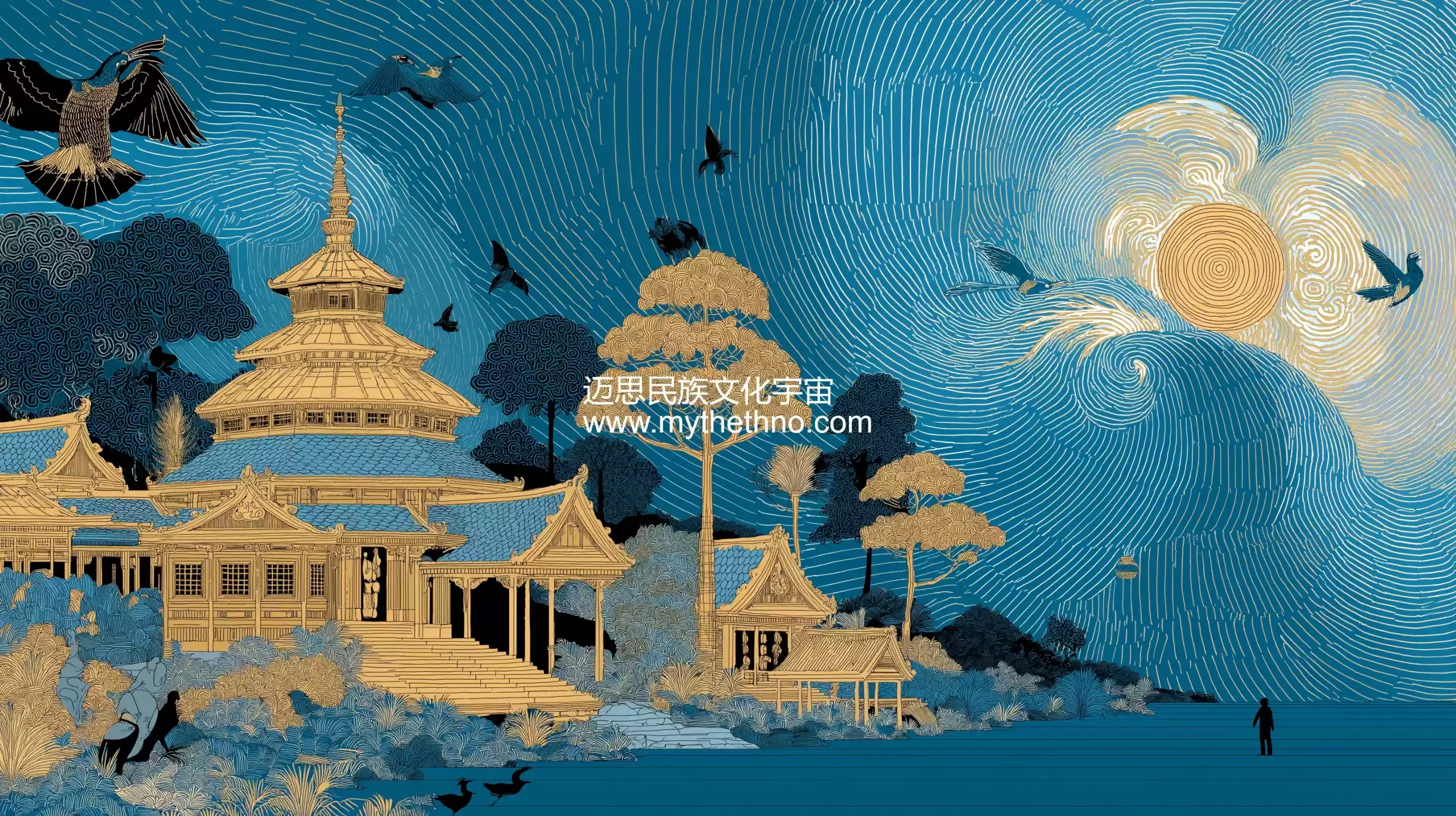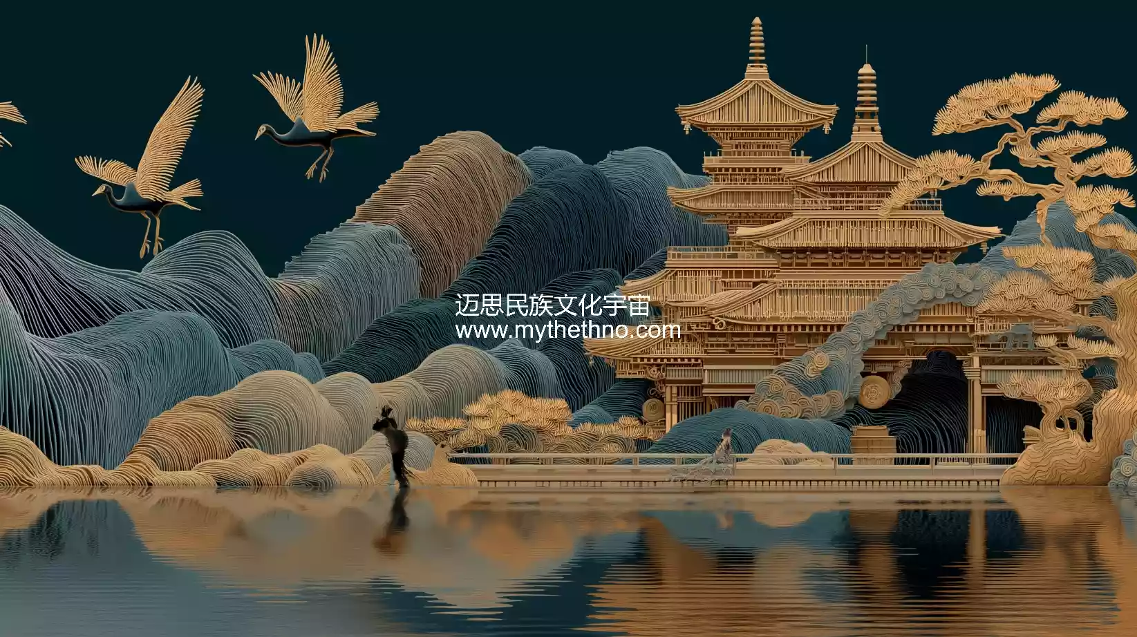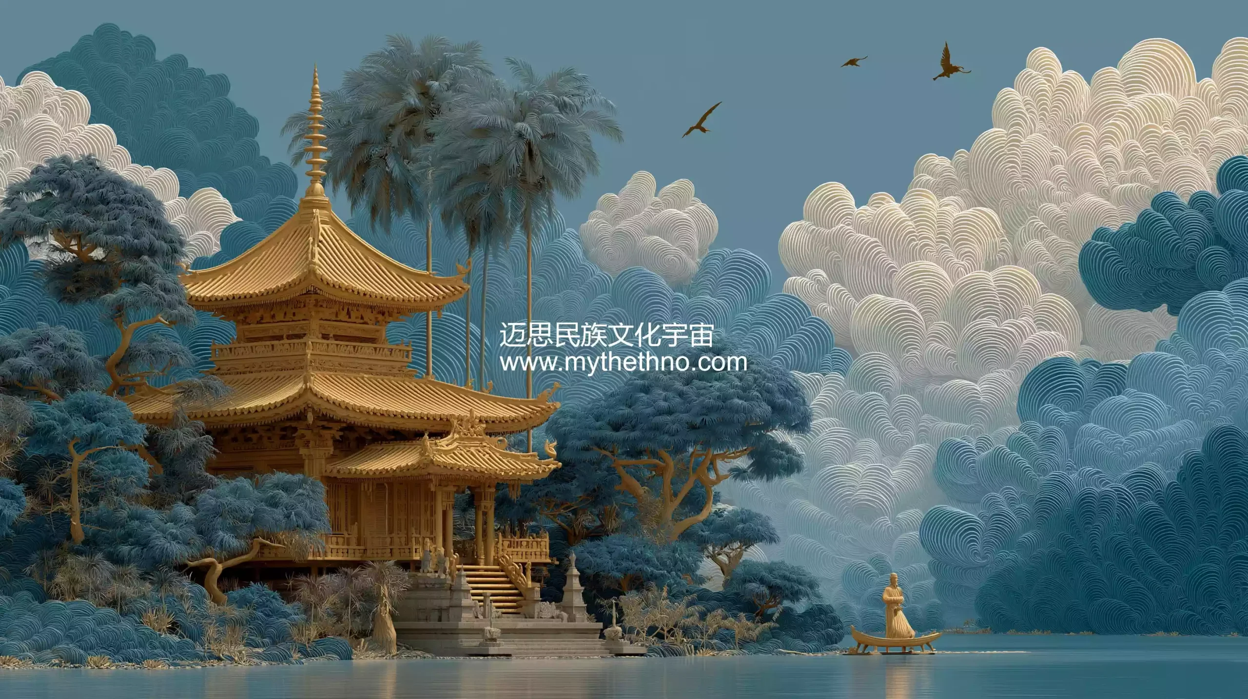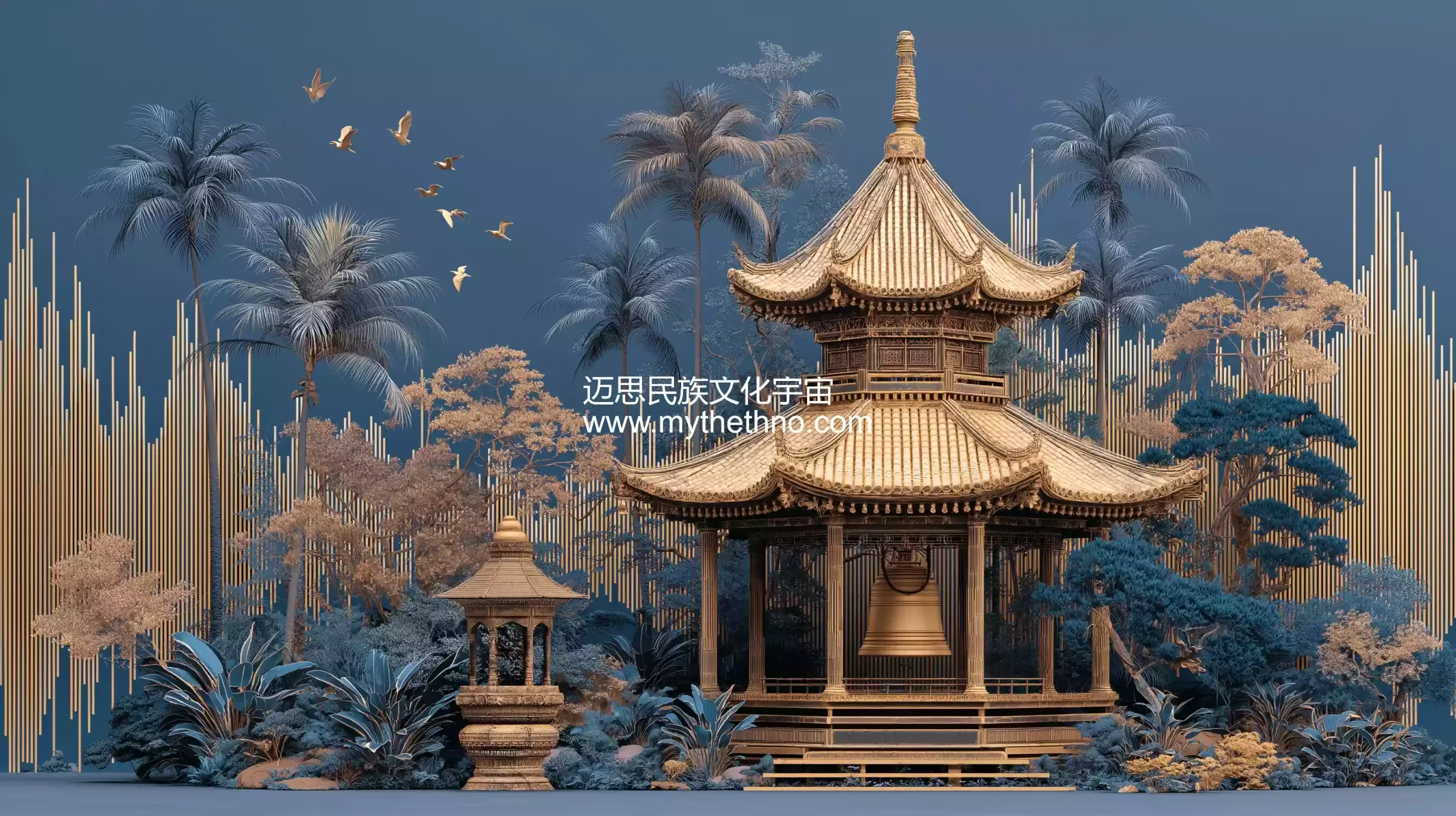 描述:佛寺金塔与干栏竹楼双重曝光重叠,钟声化为金色声波扩散,惊起孔雀群飞。前景古井水映照现代傣族少女剪影,古典金与现代蓝灰色调交融,诠释傣族文化在古今时空对话中始终延续的生命力与传承脉络。