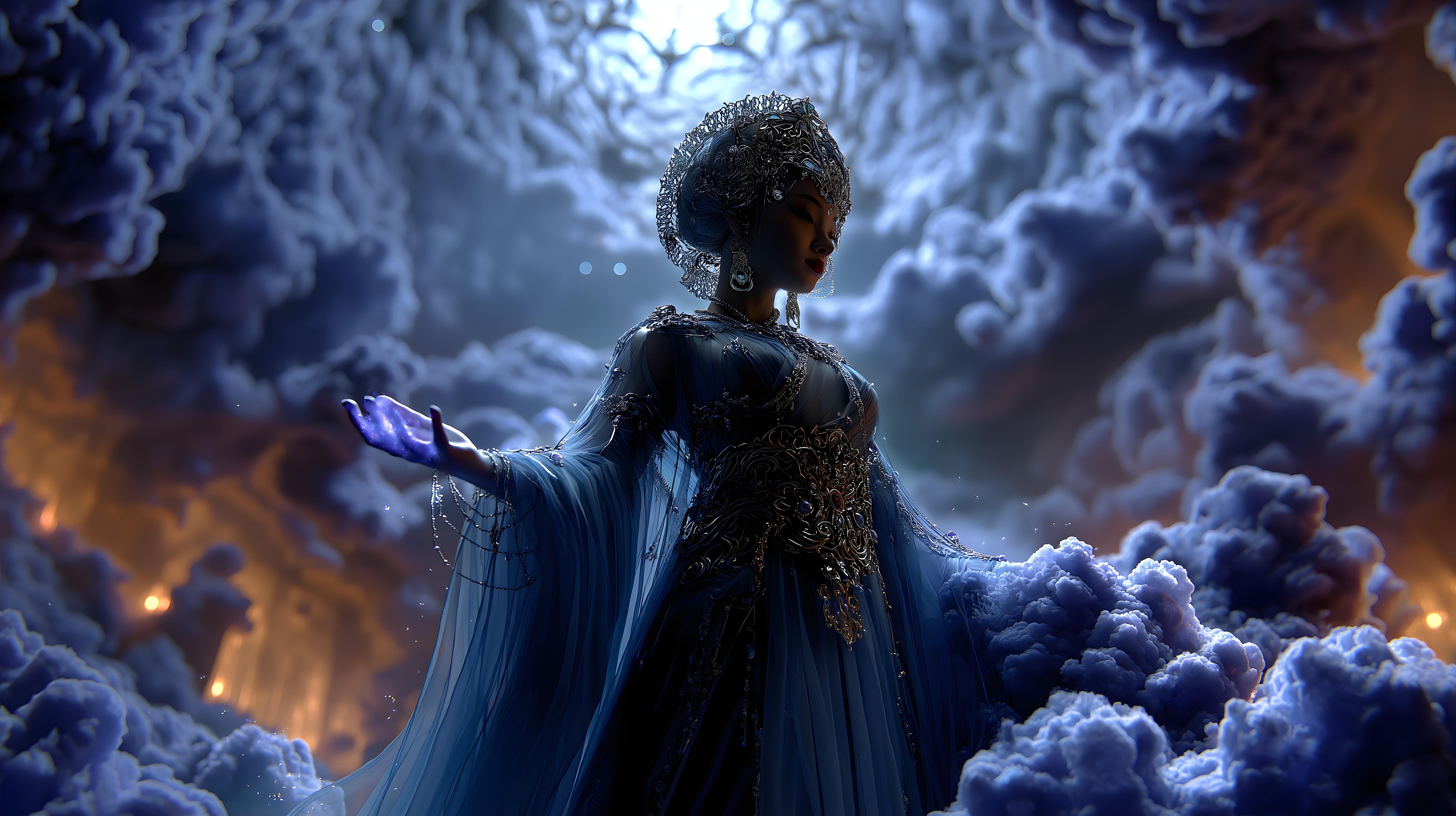 画面描述:以侗族萨天巴神话为核心,展现侗族创世女神萨天巴的神圣形象,身着传统靛蓝长裙、头戴精美银饰,双手散发星芒星云丝线,将宇宙混沌编织成序。女神身后悬浮巨型灵韵蛛网(象征其力量),手中托举发光宇宙蛋,深紫靛蓝金配色彰显神圣母性,承载侗族先民对创世女神的信仰与宇宙起源的解读。