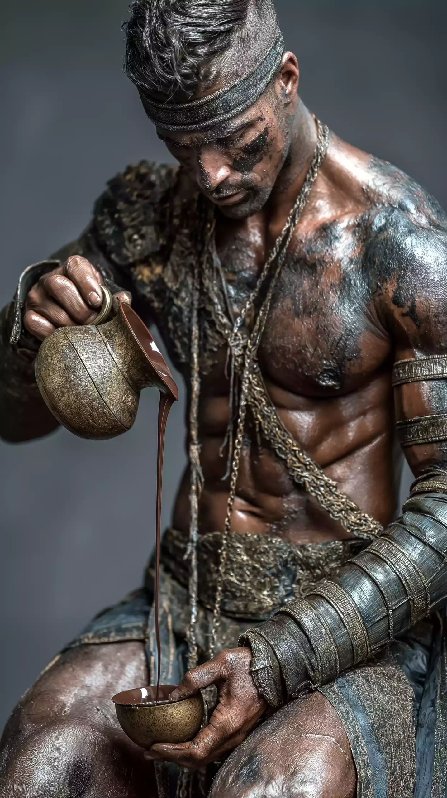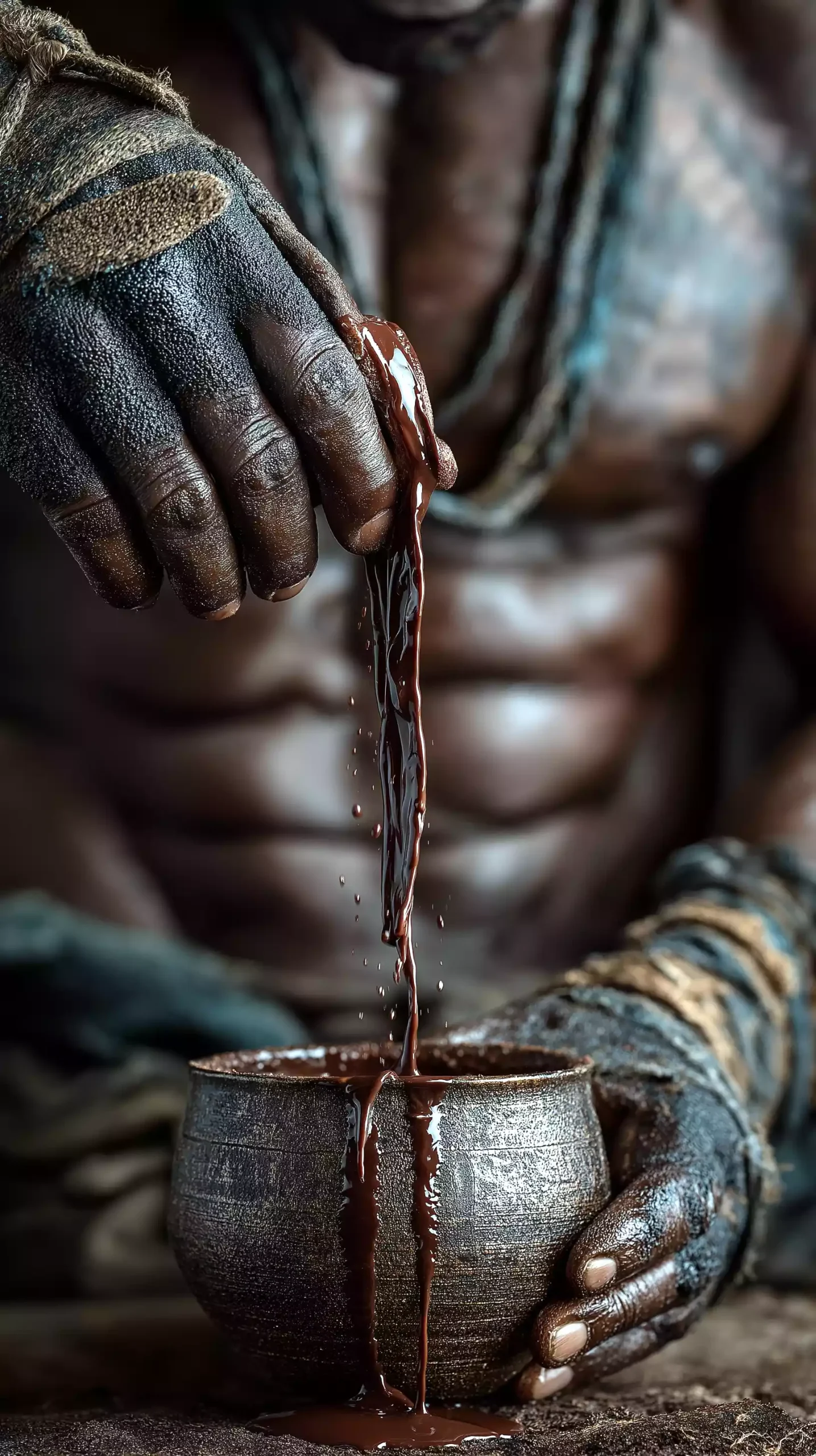 描述:《苦汁复兴:纯粹主义》,阿兹特克青铜祭杯倾倒 100% 无糖黑巧,浓黑液浇灌健身青年脊背形成肌肉浮雕;地面蔓延可可脂裂纹,高对比光影显 “苦水配方与健康运动” 结合。