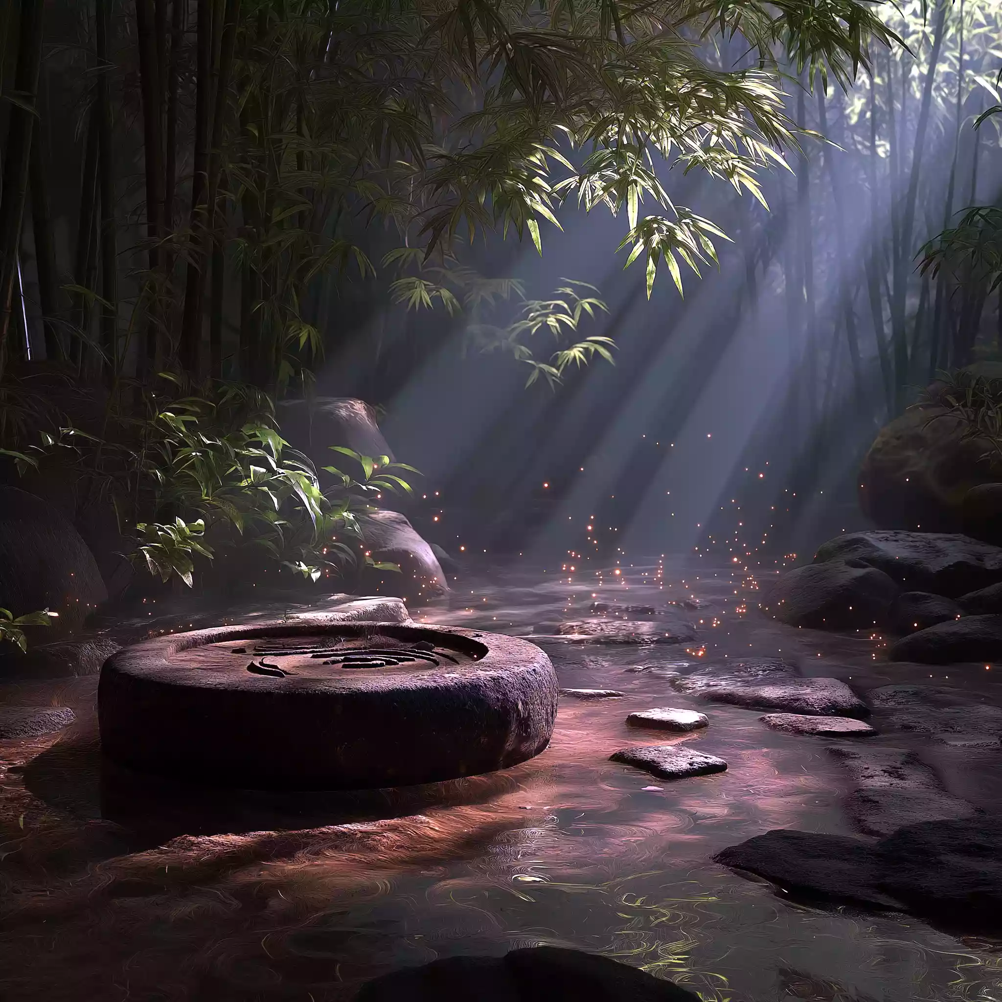 画面:乡间夯土地上散落带墨迹的竹简与陶砚,砚中墨汁有光泽。中央淡金光束穿透绿竹林剪影打下,光束中浮动 “仁义礼智信” 符号粒子,竹林间白雾流动,逆光形成丁达尔效应,营造教化如光的崇高氛围。