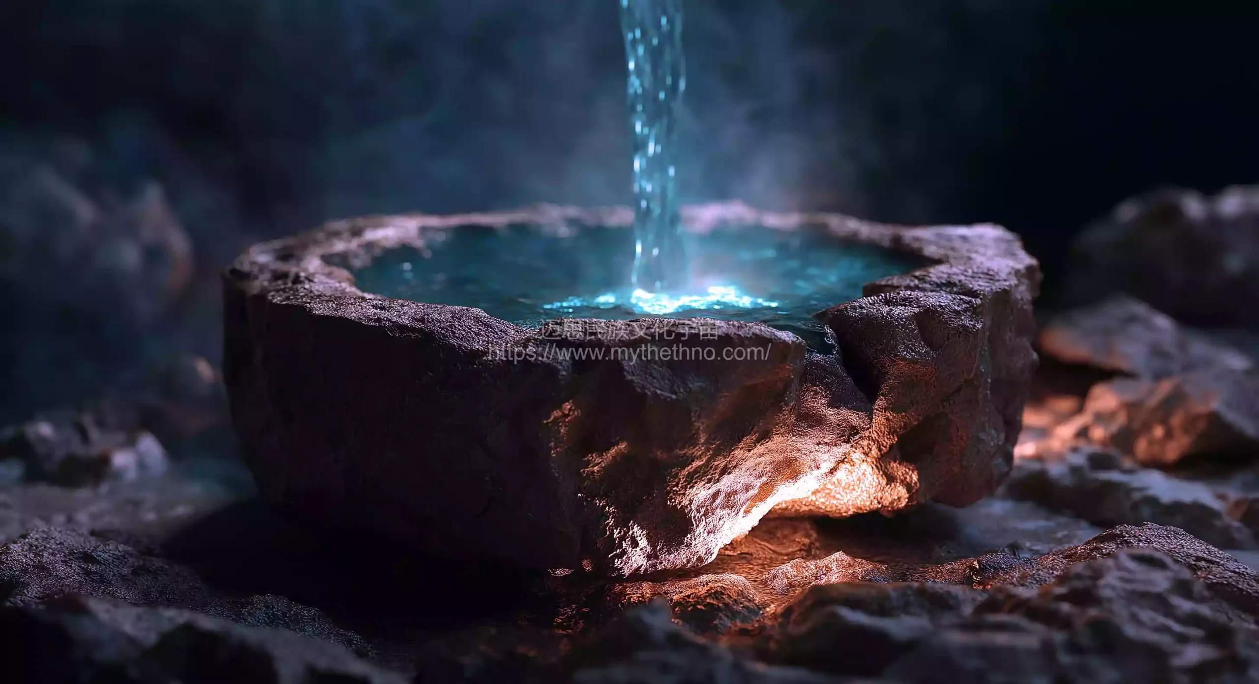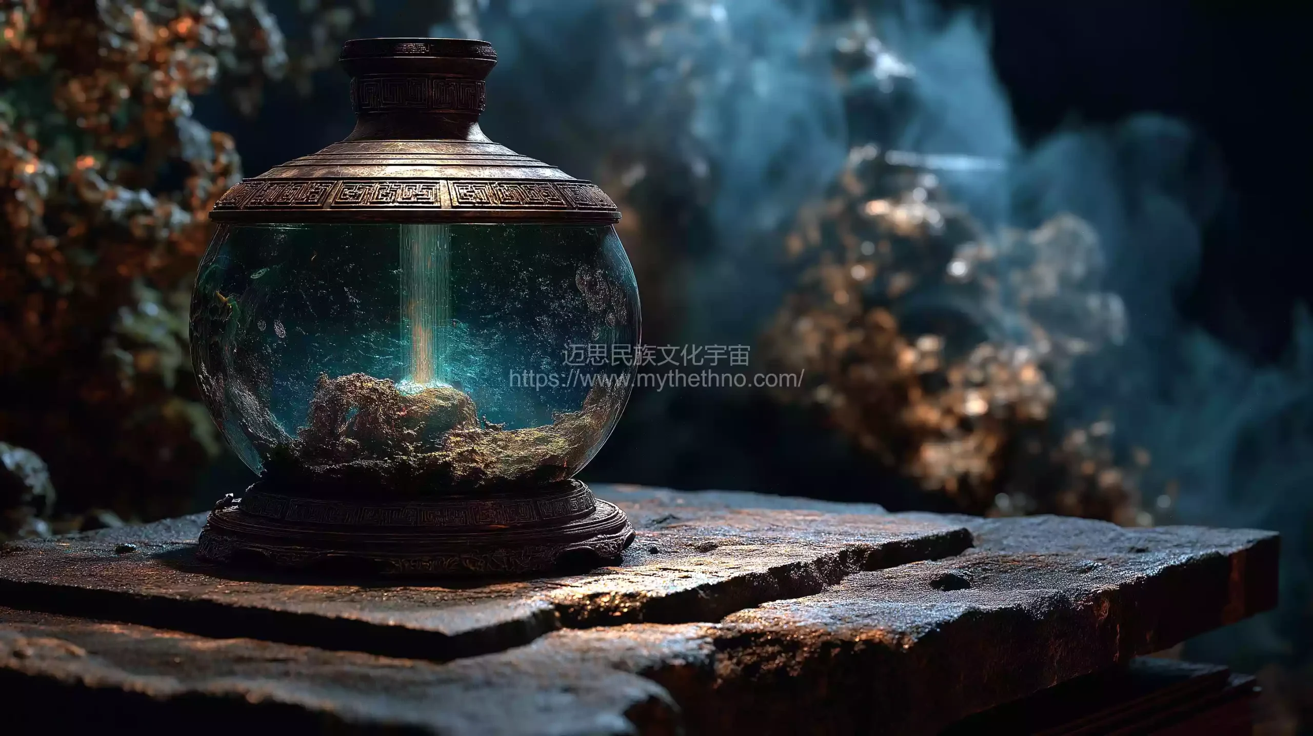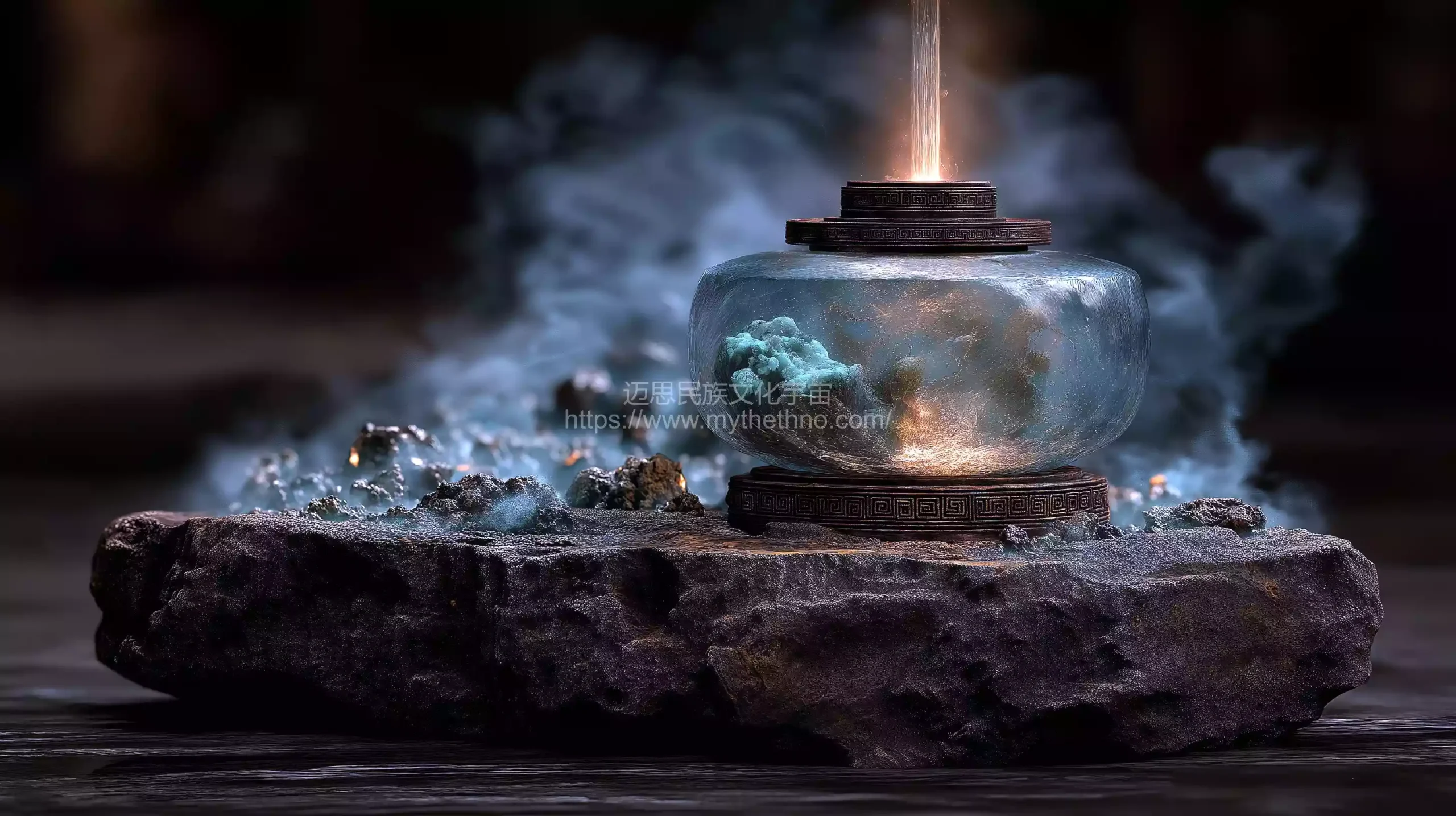 描述:先秦时期,彼时天体崇拜盛行,中秋节神性起源由此发端。画面以宏观视角呈现,荒野中矗立巨大原始玄武岩祭坛,坛身布满粗犷凿痕与古老符文。上空超自然满月被脉动的半透明生物发光薄膜包裹,象征月神。一道液态光柱般的月光垂直注入祭坛上的抽象三足青铜爵,爵内盛满幽光玉琮,背景深邃宇宙中星云如泼墨缓慢旋转,整体氛围庄严神秘,尽显先秦对月神的崇敬与祭祀文化。