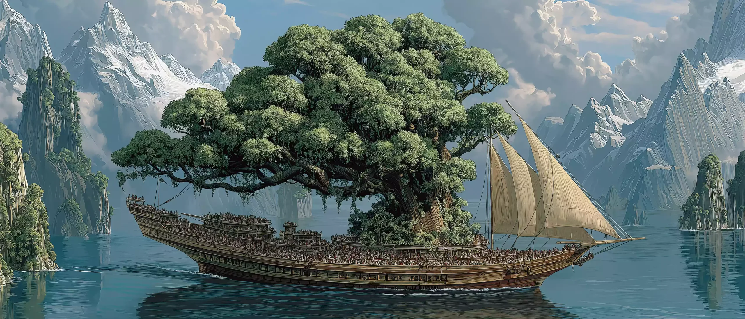 描述:《巧克力方舟:物种基因库》,诺亚方舟载濒危可可树种驶过冰川,船体由全球巧克力品牌 Logo 拼成;青年科学家在云端数据库备份基因链,蓝红光影显 “商业力量守护可可多样性”。