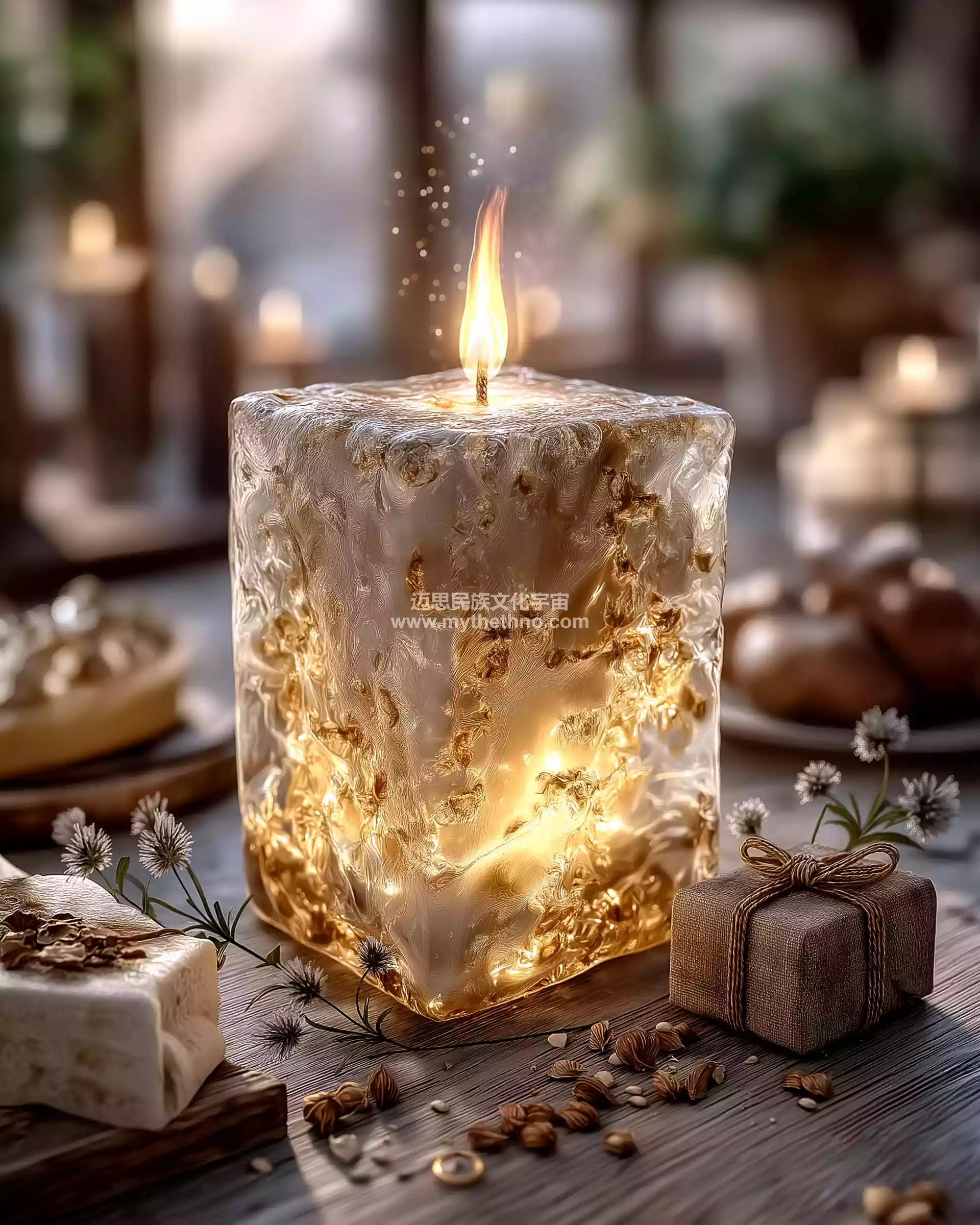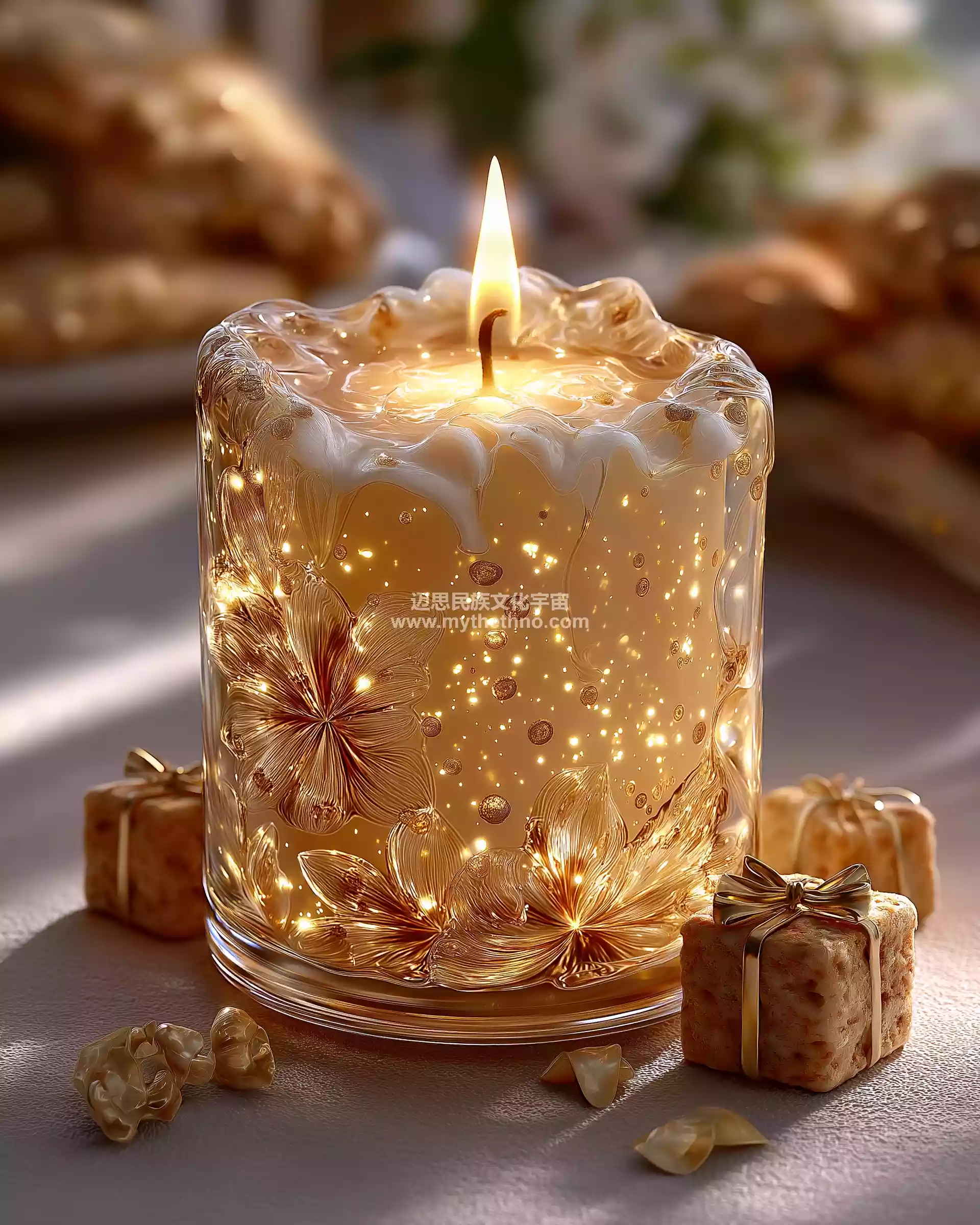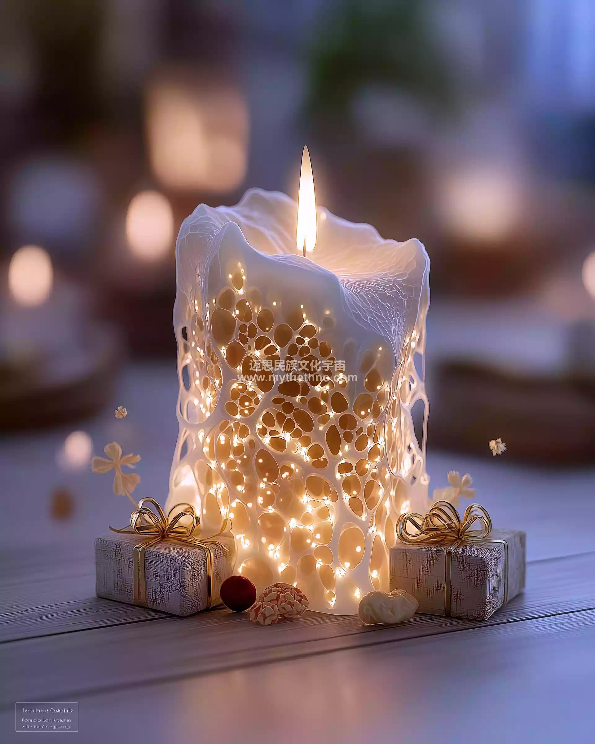 描述:农神节(萨图恩节)狂欢后的温馨遗存,燃烧殆尽的蜡烛虚影留暖光纹,旁置吃剩食物与礼物盒虚影,绕淡金光纹。古罗马民居室内背景灯光柔和,传递 “欢乐过后的宁静满足”,是农神节温馨感向圣诞延续的文化脉络,习俗传承中藏共享内核。