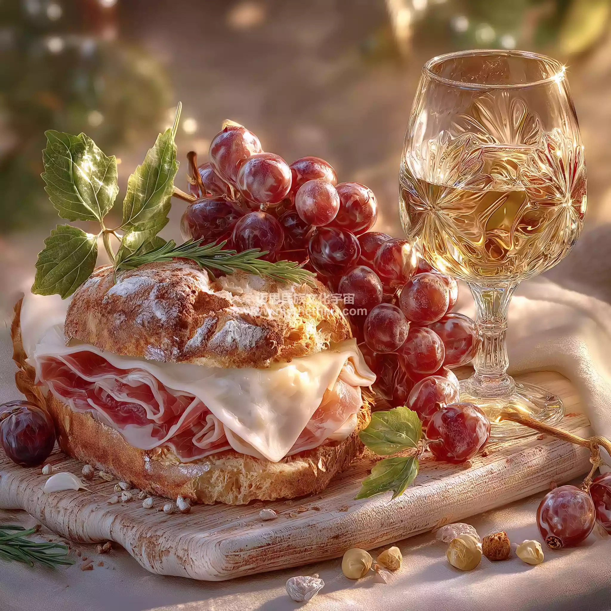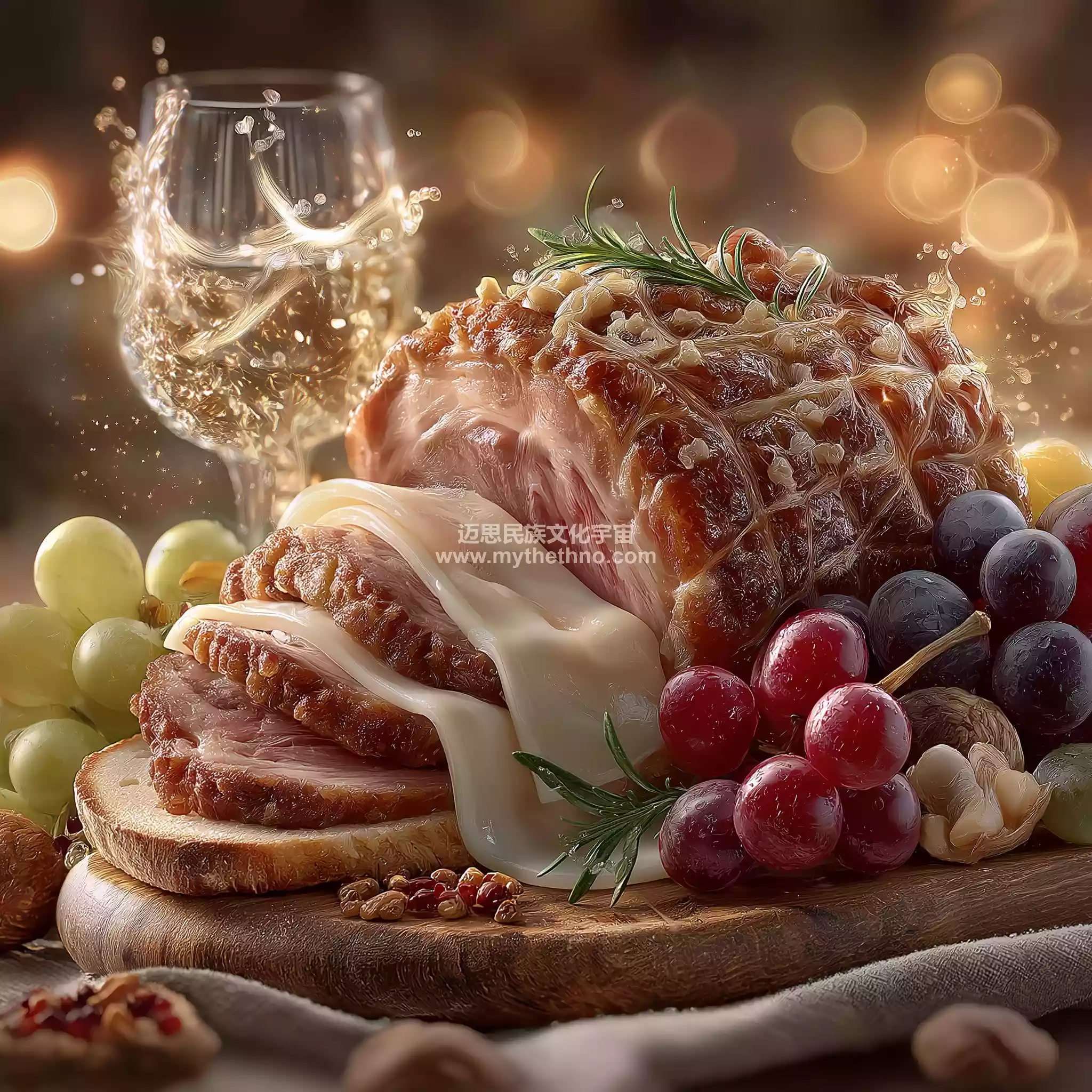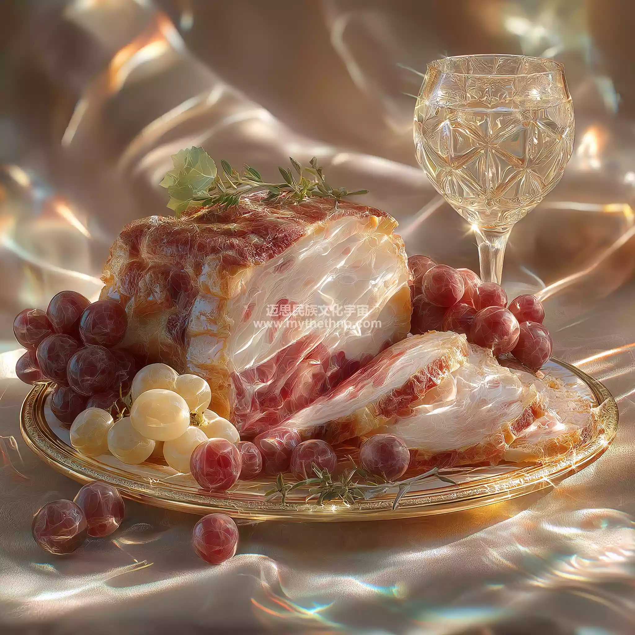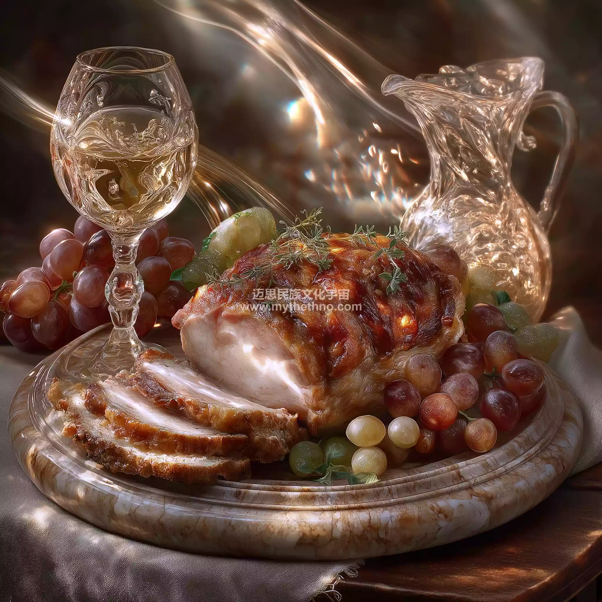 描述:石质的餐盘虚影上,摆放着一块烤肉、几颗葡萄与一片面包,餐盘周围环绕着淡金色的光纹,旁边有一个倾斜的葡萄酒杯虚影(光纹构成的酒液)。背景是古罗马餐桌的木质纹理,灯光柔和,食物的纹理诱人,光纹流动温暖,营造出 “盛宴的精致与满足”。