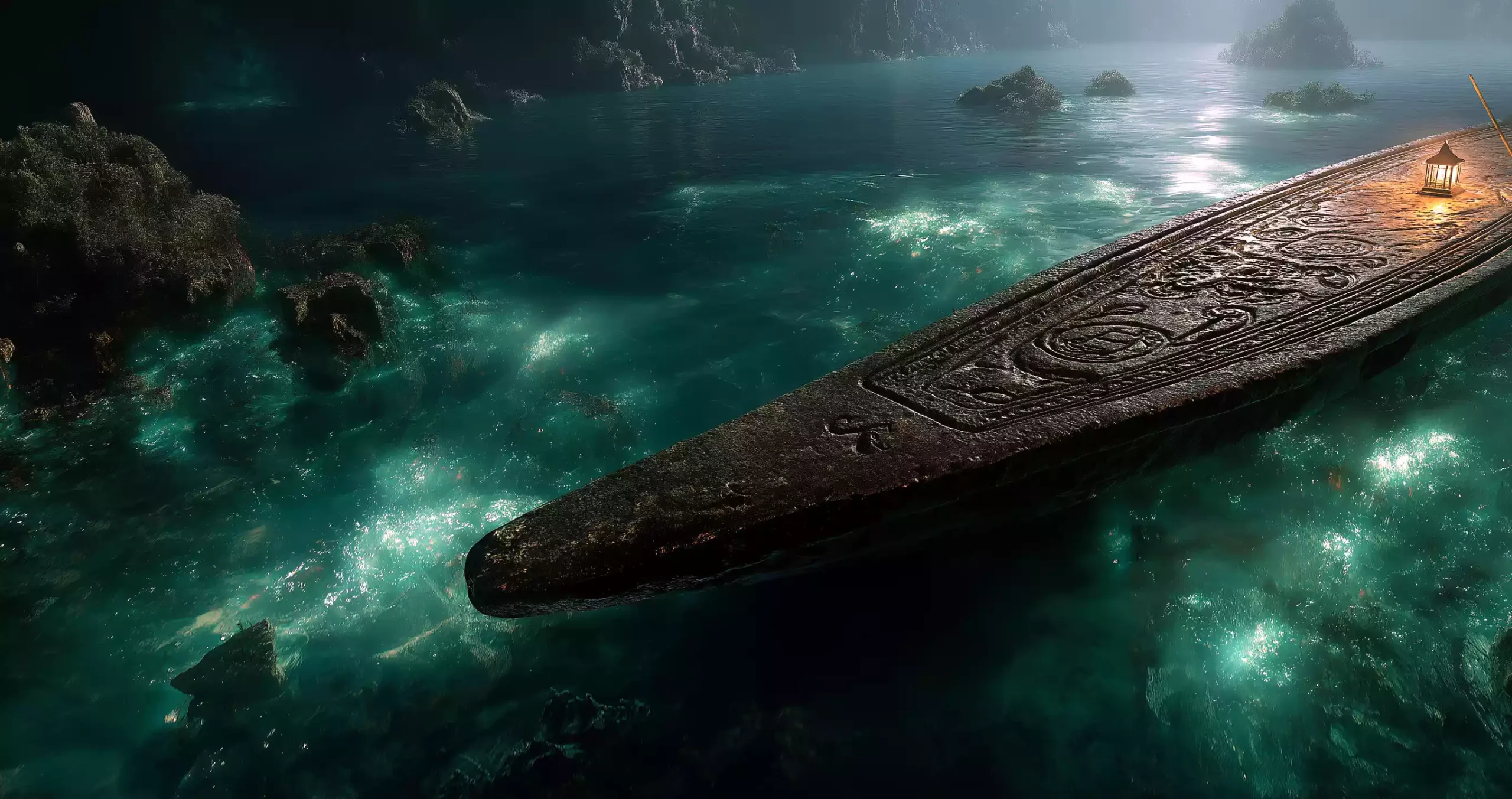 描述:《冥河摆渡者的契约灯》,基于公元前 3500 年 – 公元前 539 年两河流域冥界神话,黑曜石船头悬挂骨制灯笼,灯内囚禁发绿光的灵魂契约楔形文。灯光投射出虚影船夫撑篙,篙尖搅动量子泡沫漩涡,将冥界场景、摆渡者与契约符号结合,展现该时期冥界 “灵魂契约” 的神秘设定。
