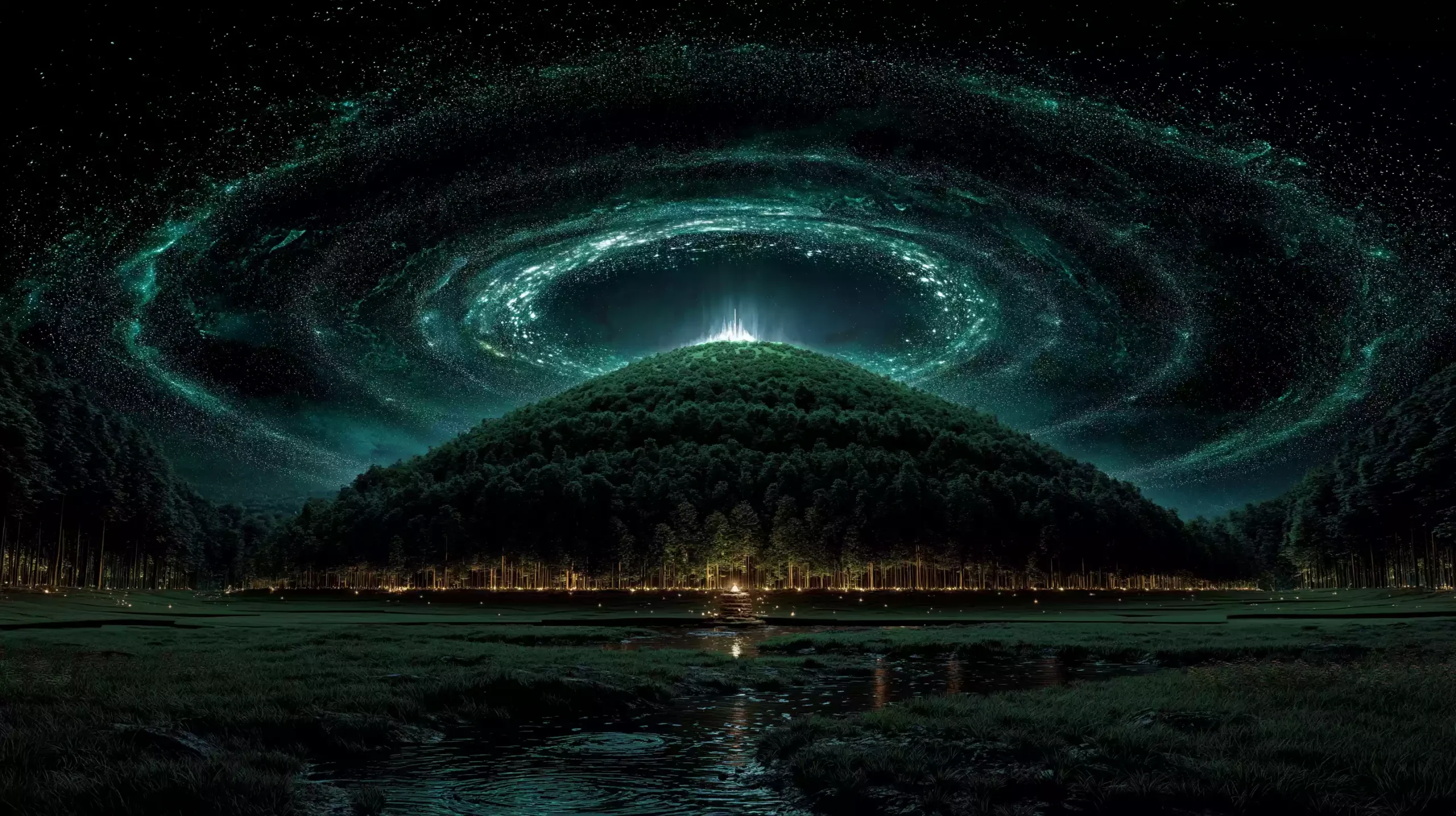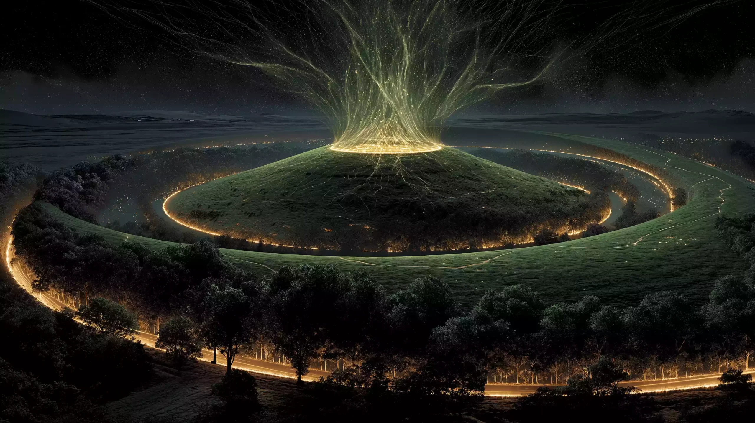 描述:《塔拉山》,凯尔特新石器时代至铁器时代的诸王加冕圣山,绿色山丘光影顶部矗立石环阵,中央燃烧的王冠光影散发放射状光线,分别连接天空星辰与地下根系,以超写实光影诠释 “天地人三界合一” 的神圣主权寓意,氛围庄严而富有神话叙事感。