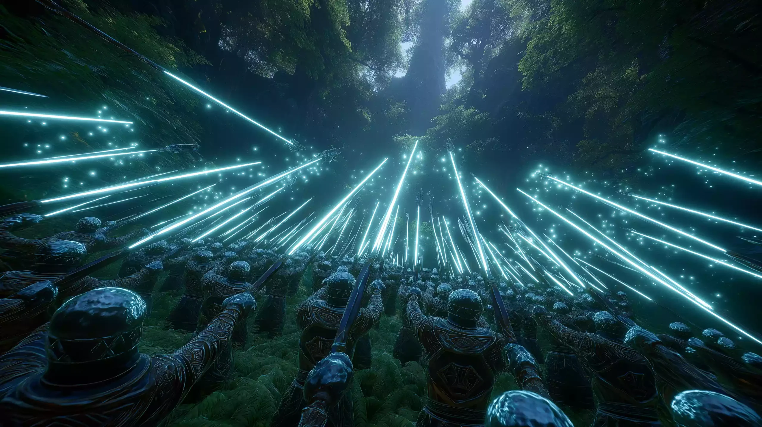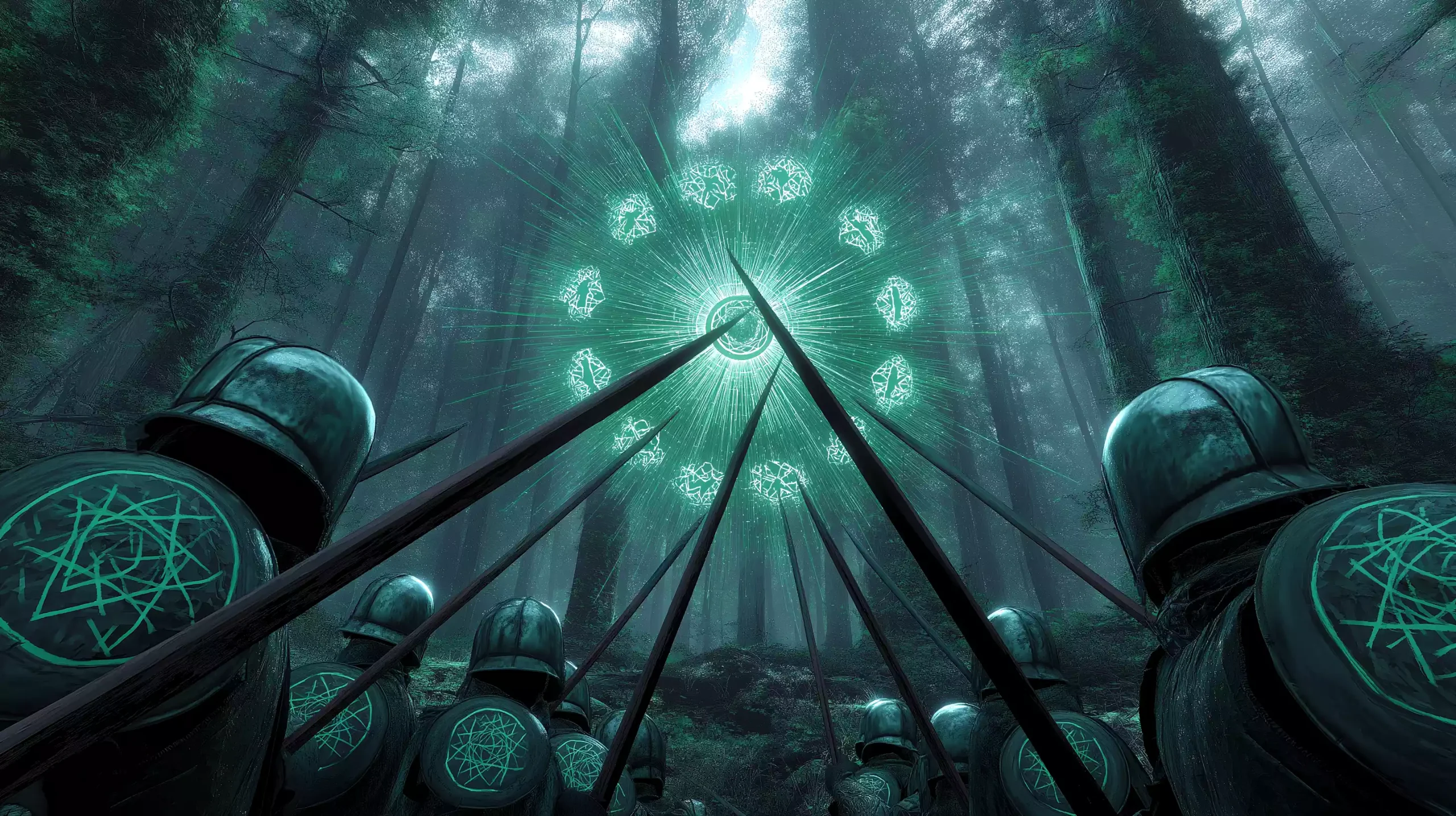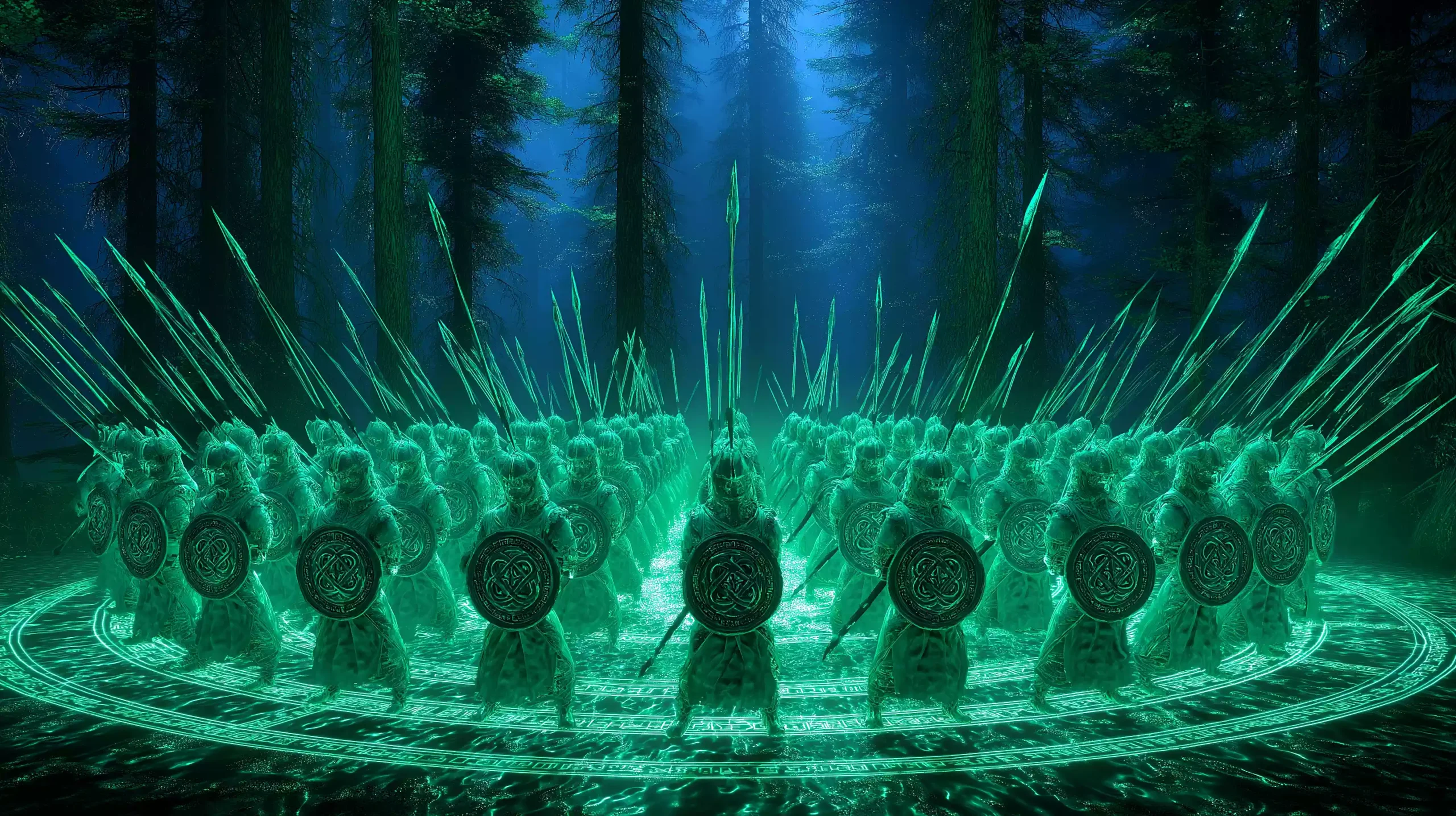 描述:《费奥纳骑士团》,凯尔特铁器时代骑士团在翡翠绿森林与银月光中,战士光影呈紧密环形阵型(长矛 45° 高举,尖端汇聚中央金色竖琴),盔甲饰有狼与鹿交织的凯尔特狩猎纹样,月光透过橡树洒下几何暗影,竖琴散发暖光晕,诠释 “勇气与诗意平衡” 的骑士精神。