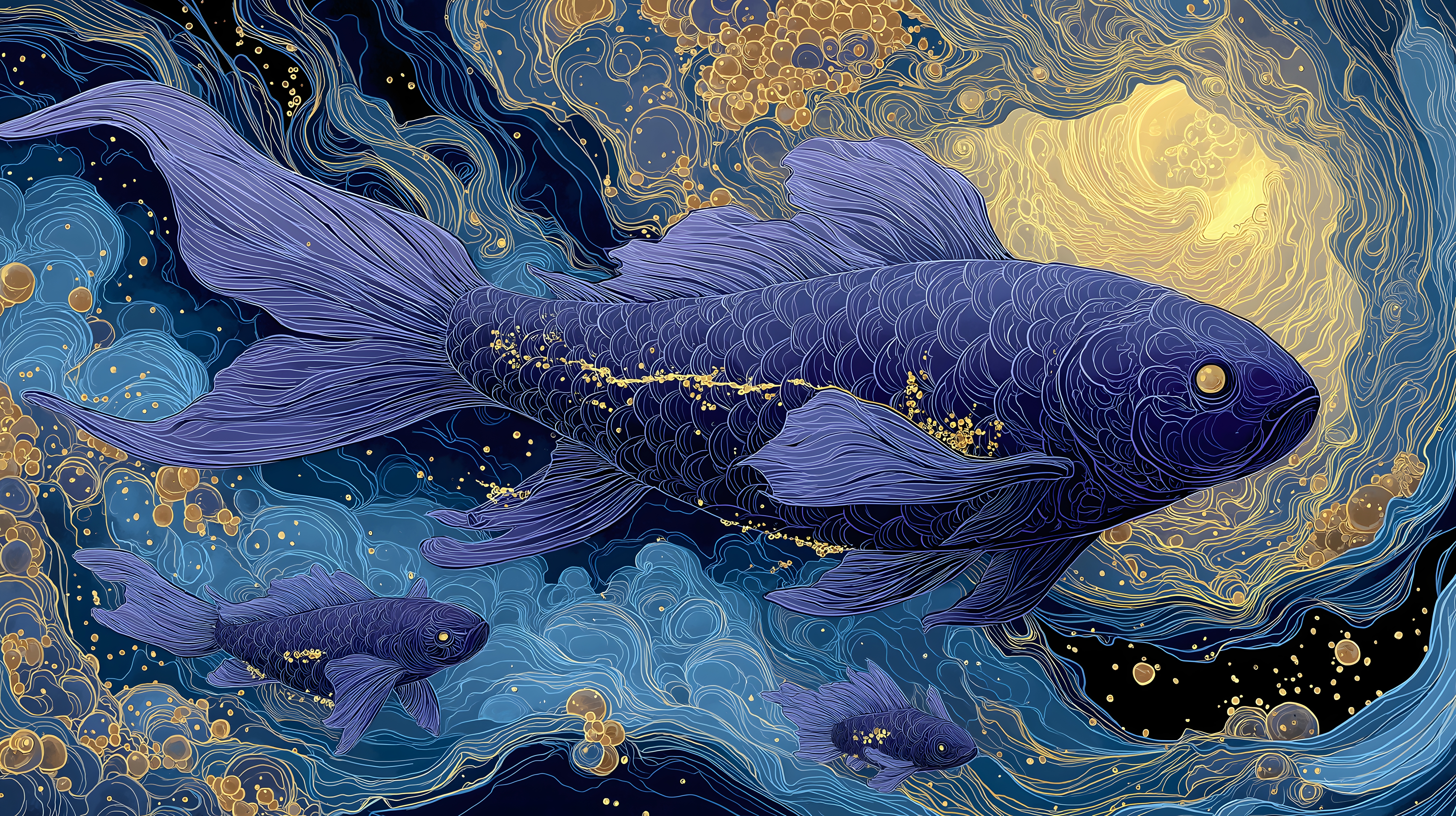 画面描述:深靛蓝混沌之洋内,巨大鱼形虚影缓缓游动,墨色半透明鳞片渗出银色能量丝。气泡包裹微型宇宙轮廓,暗紫色眼瞳偶闪金光,呈现创世之前原始混沌之神努恩的沉睡状态,蕴藏宇宙诞生的全部潜能。