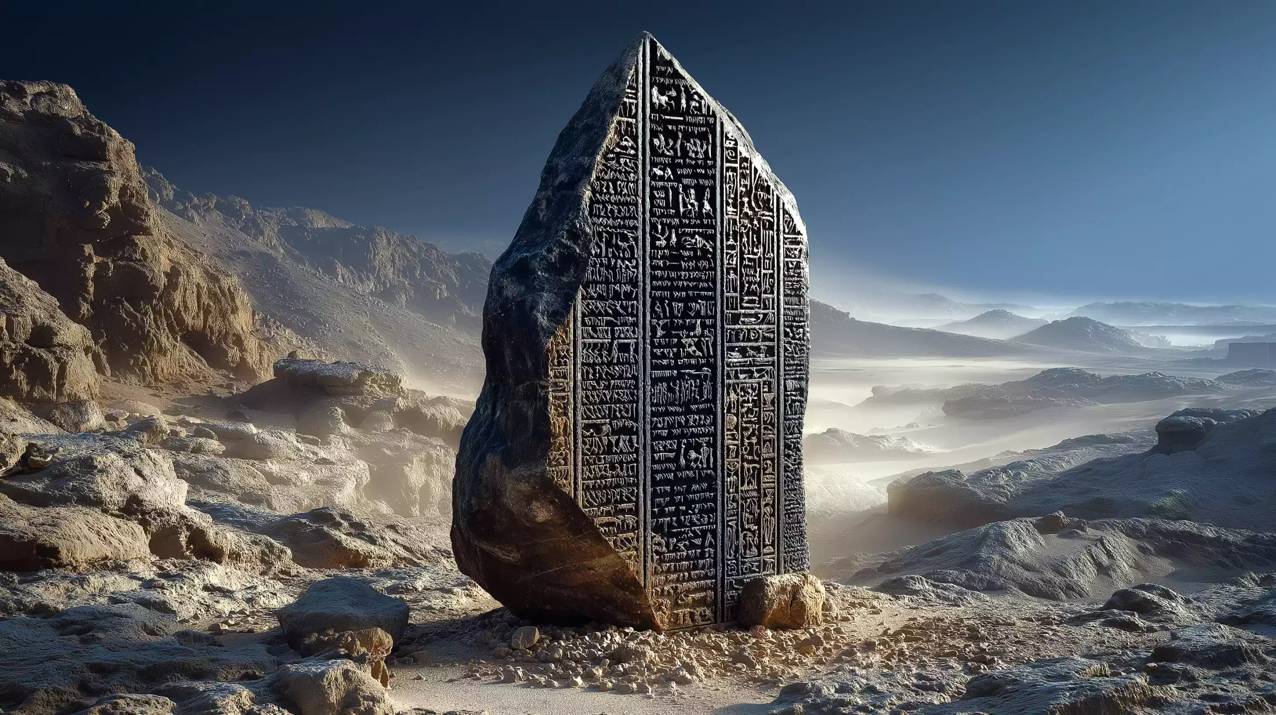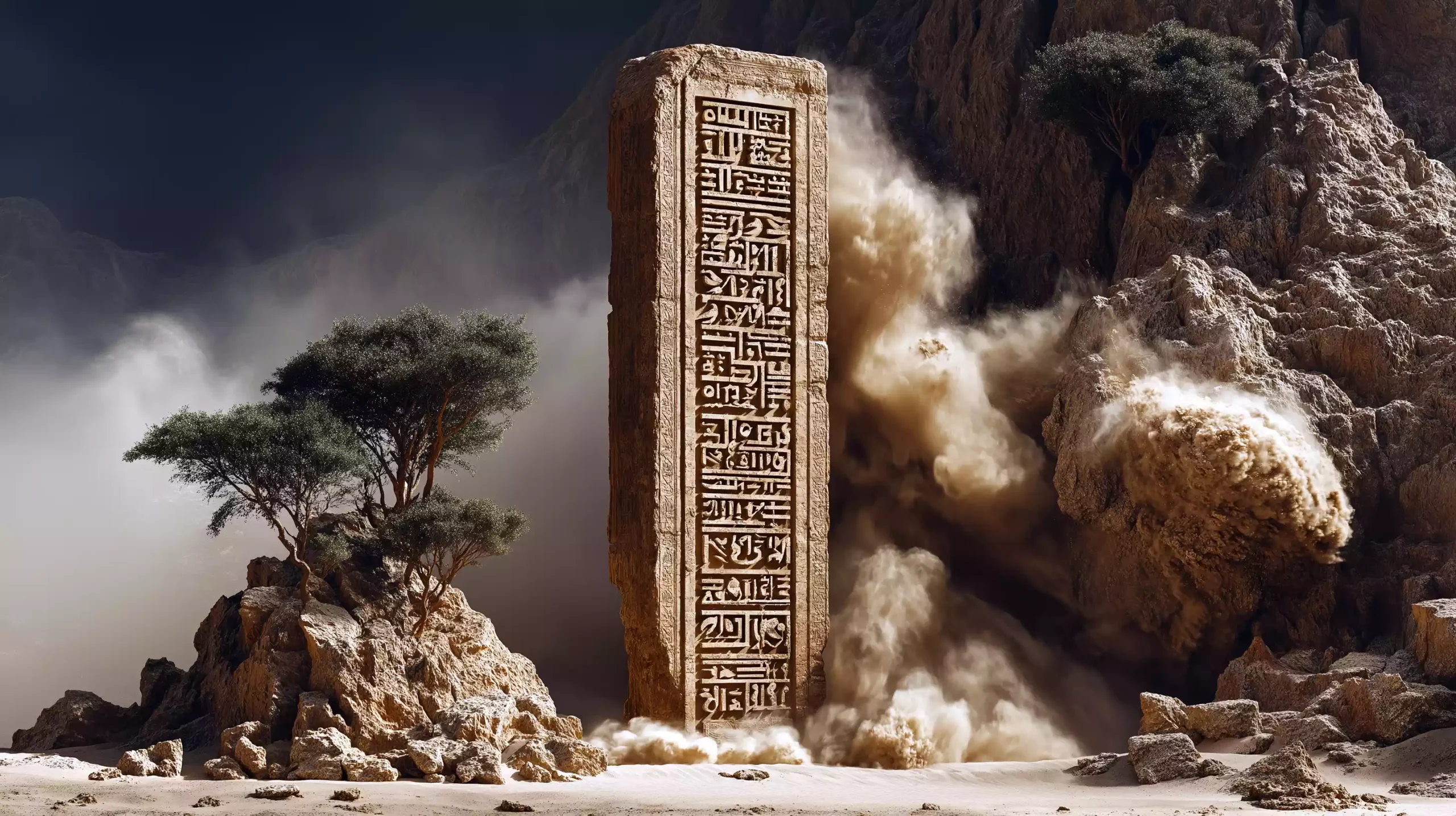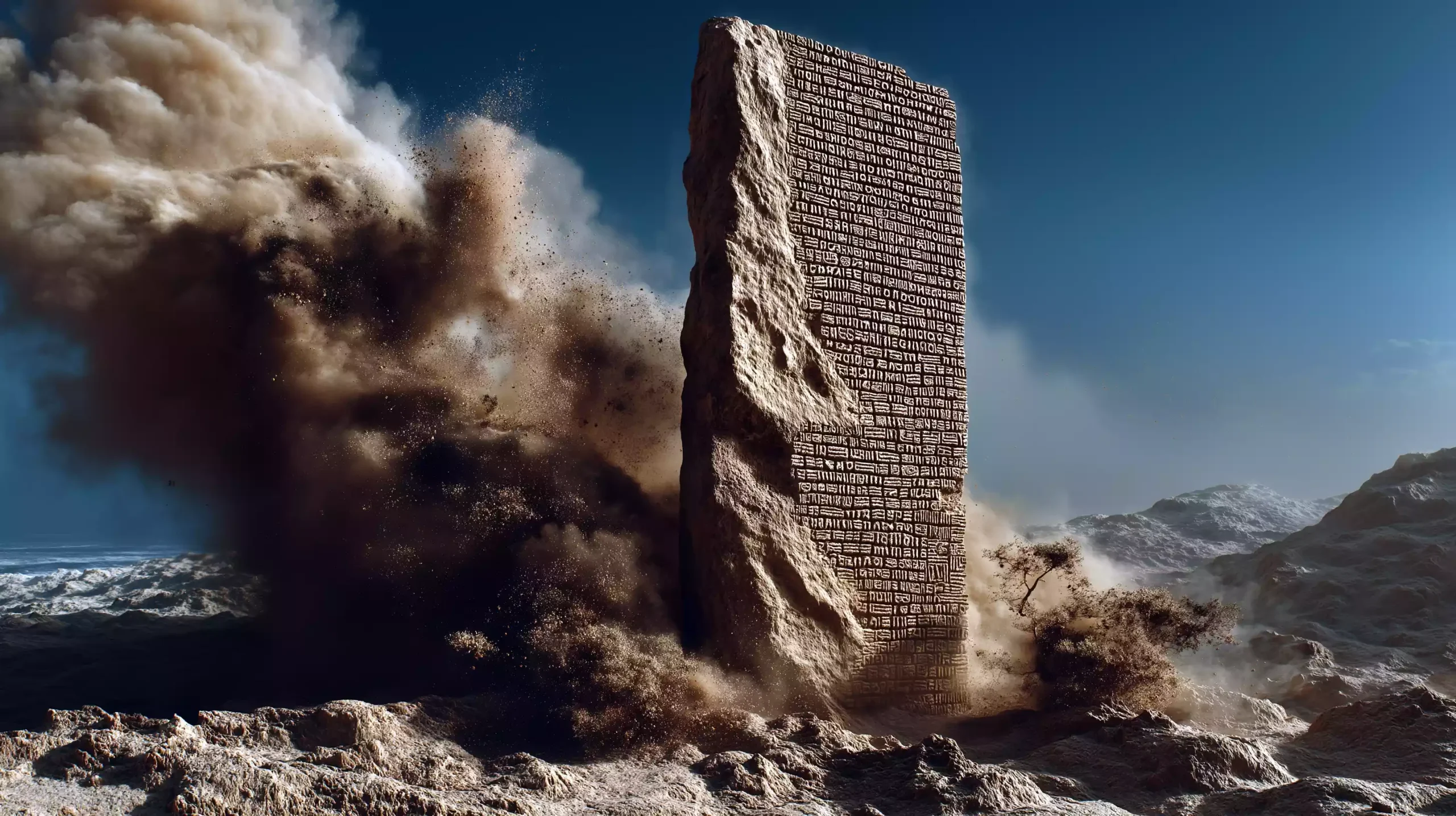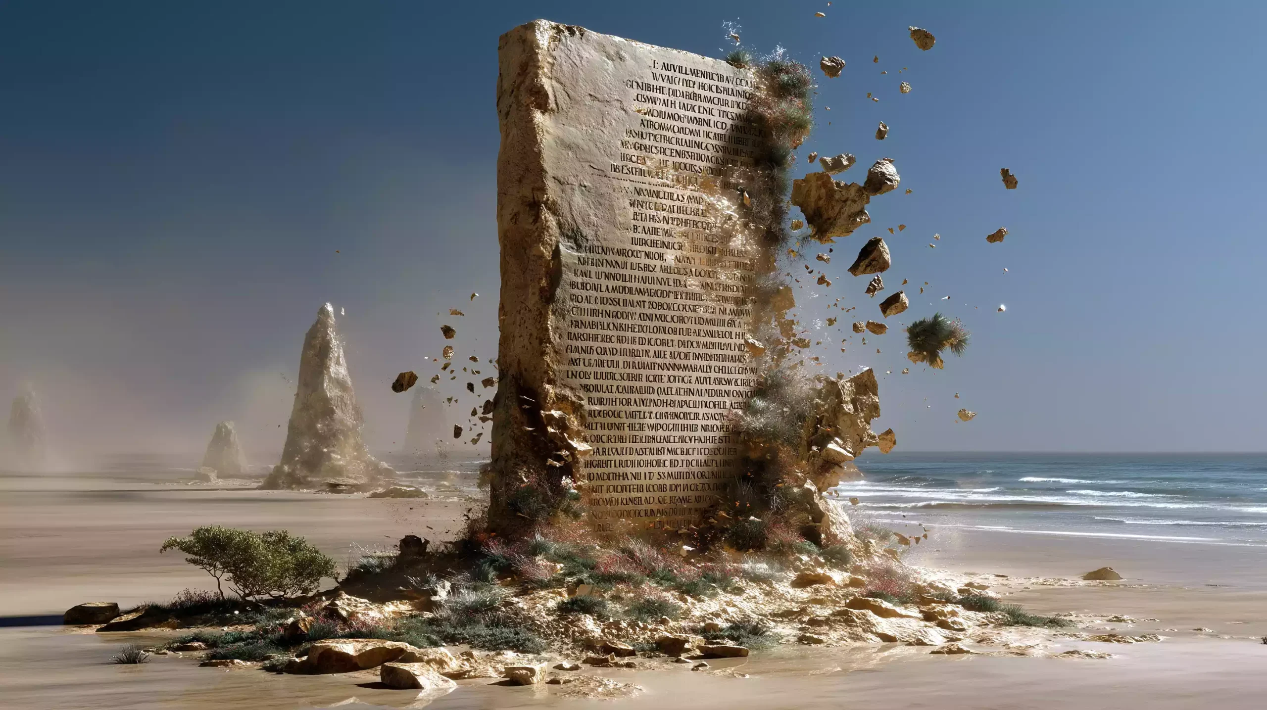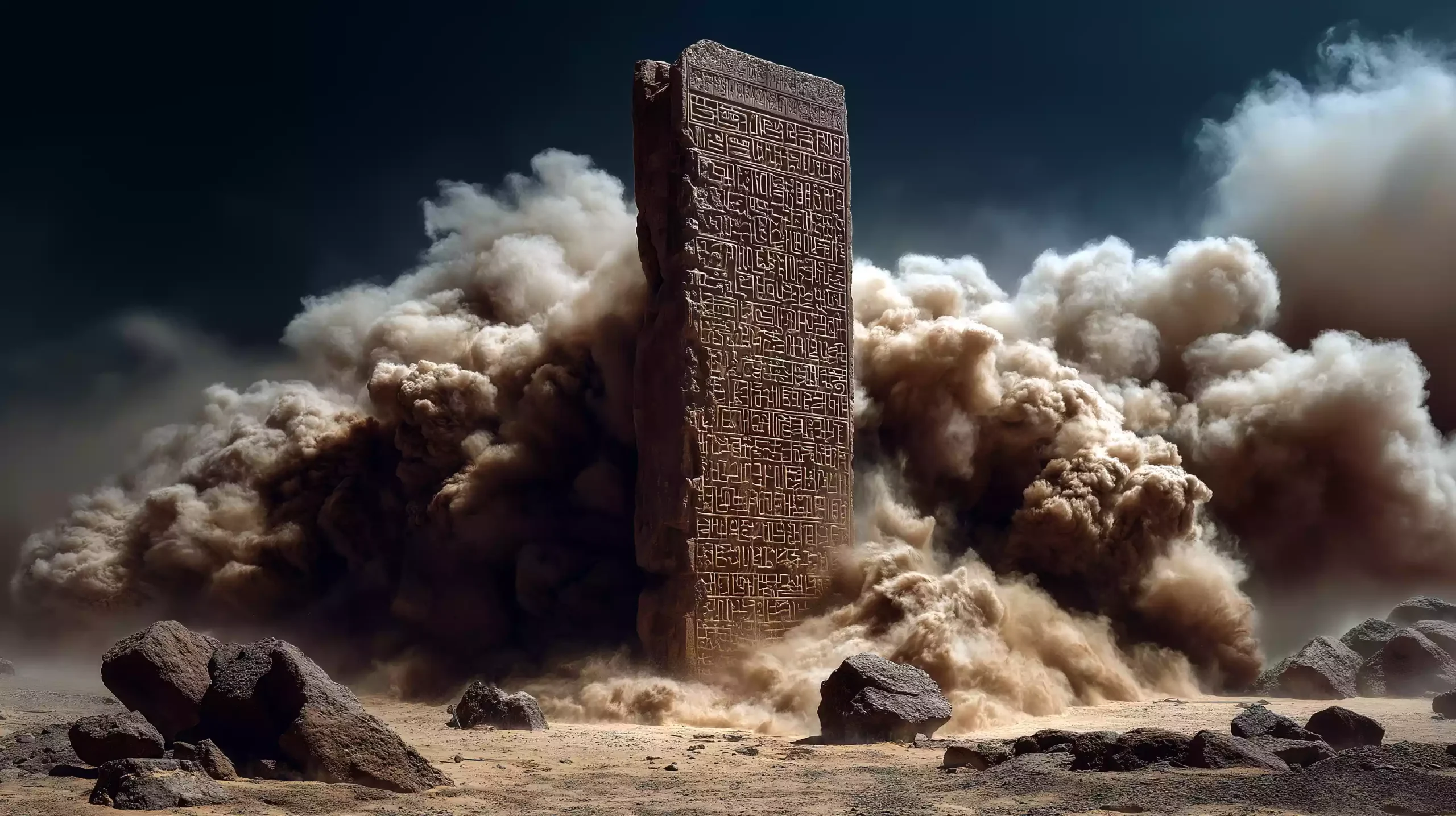 描述:《吉尔伽美什朽碑》,以公元前 3500 年 – 公元前 539 年两河流域《吉尔伽美什史诗》为背景,刻有不朽誓言的泥板在沙暴中崩解 —— 呼应英雄追寻永生终失败的宿命。裂缝渗出永生草灰烬,碑文重组为乌鲁克陷落影像(诠释 “不朽” 的幻灭),残块底部萌发楔形文幼苗(象征文明记忆的延续)。画面以 “朽碑” 为核心,演绎 “个体消亡与文明存续” 的主题。