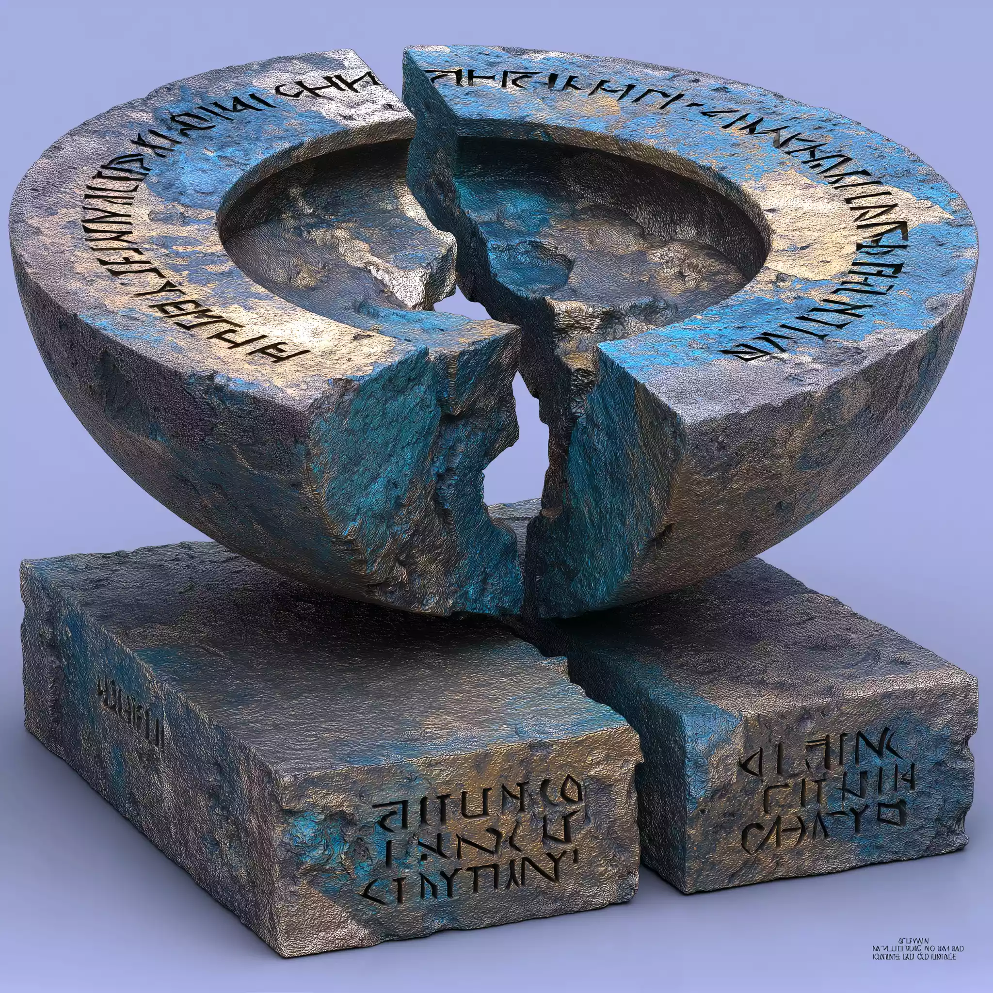 描述:命运纺车的混沌线程》,以公元前 3500 年 – 公元前 539 年两河流域命运信仰与制陶工艺为核心,陶纺轮旋转牵引暗物质丝线,线体缠绕着未完成的命运楔形符。断线处滋生锈蚀裂纹,裂纹内窥见初代神灵骸骨,将纺车、丝线与命运、神祇符号结合,诠释该时期对命运起源与神性关联的认知。
