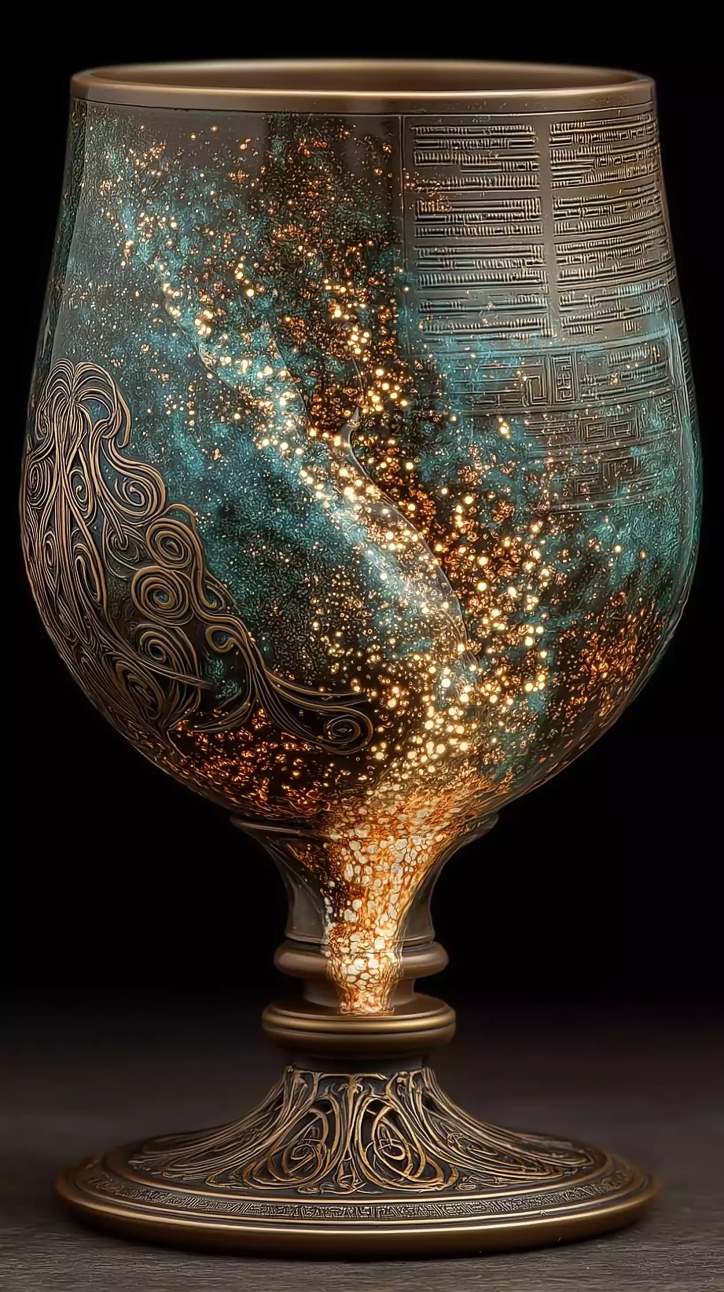 描述:《啤酒神谕的麦芽宇宙》,基于公元前 3500 年 – 公元前 539 年两河流域啤酒女神赛鲁瑞信仰,青铜酒杯内麦芽金雾旋舞,气泡炸裂成欢乐楔形符。杯壁浮现全息宴饮场景,杯底渗出大麦 DNA 光链,将啤酒、麦芽、宴饮与生命基因符号结合,诠释该时期啤酒神谕中 “欢庆与生命本源” 的内涵。