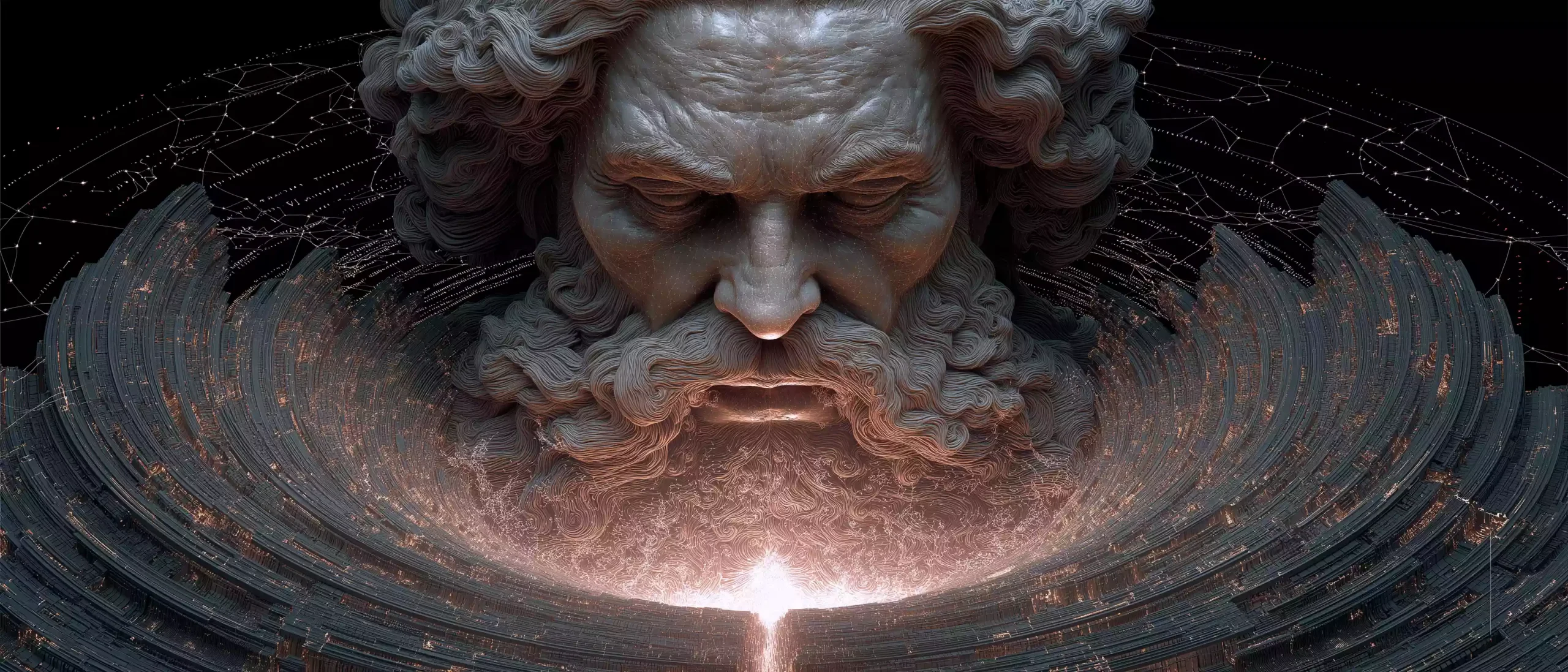 画面:塞拉皮斯神胸口的黑洞漩涡吸收宇宙信息流,喷发成柱状全息图书馆;书页由发光象形文构成,背景星座连线交织成神经网络,展现知识的量子聚合。