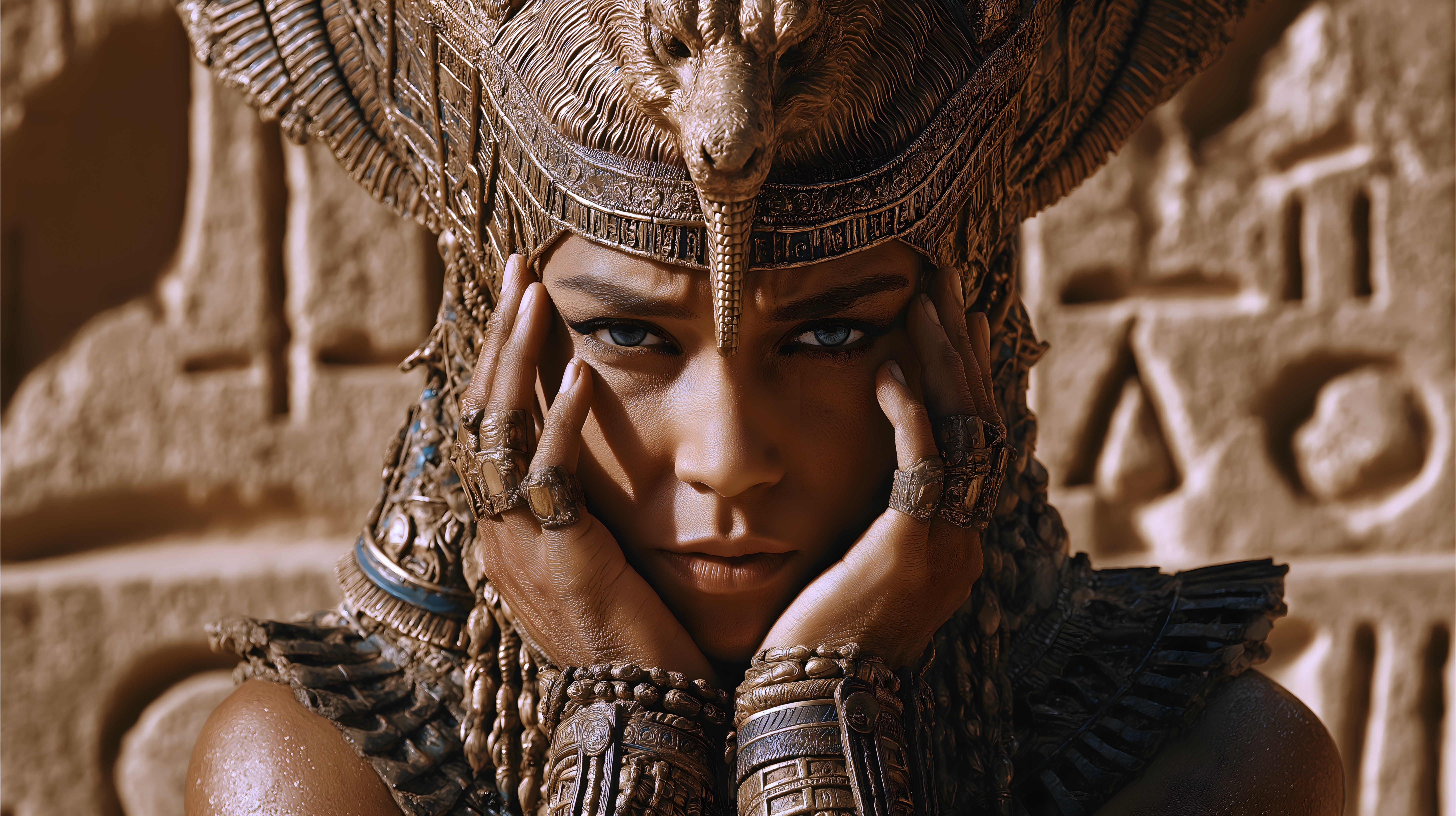 画面描述:立足埃及古神话,金棕色沙漠为背景,金字塔隐隐浮现,主体为狮身人面形态,人面庄严神秘,眼神深邃莫测,头戴埃及法老头饰,额间饰圣蛇浮雕,狮身盘踞岩石之上,身姿矫健沉稳,双手交叉胸前,紧握发光谜语卷轴,卷上符文隐现,沙地刻巨型谜语符文,尽显狮身人面像镇守秘境、执掌谜题的神秘威严,还原埃及古神话的神圣与厚重。