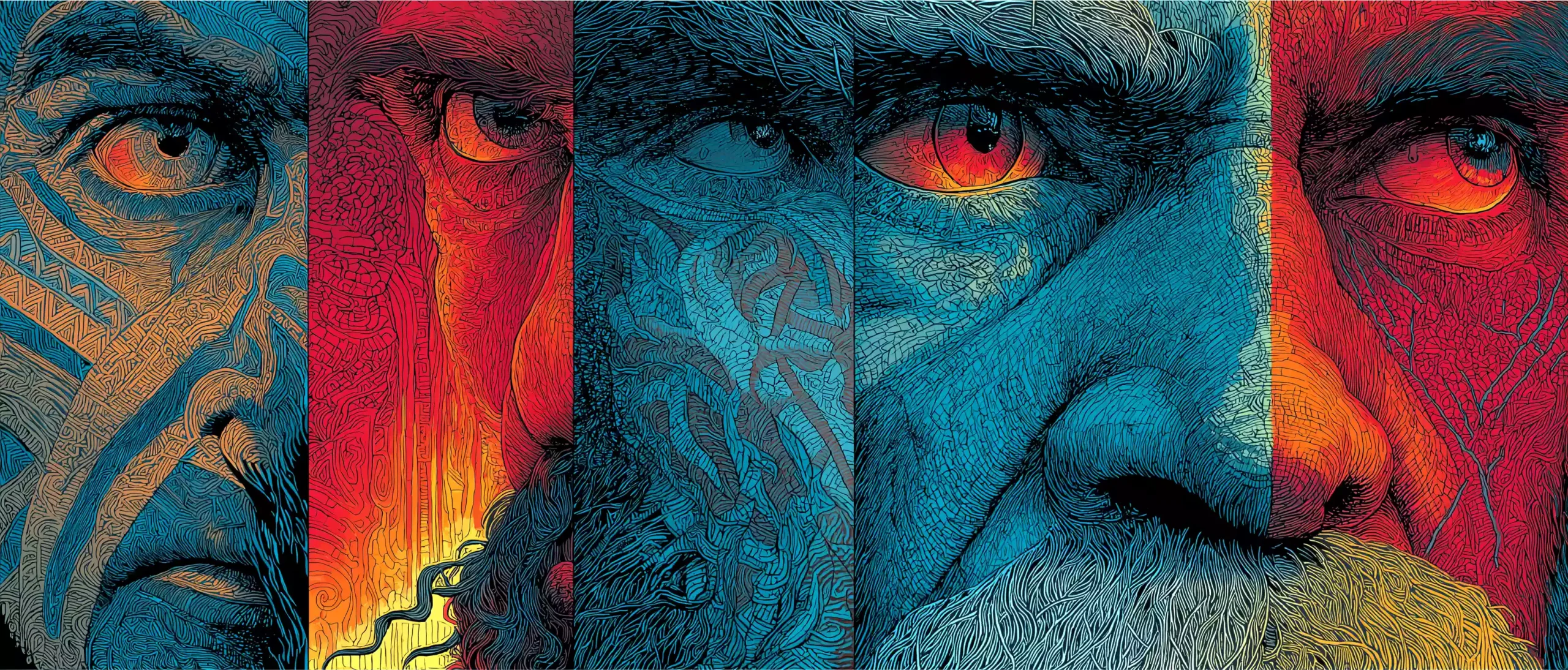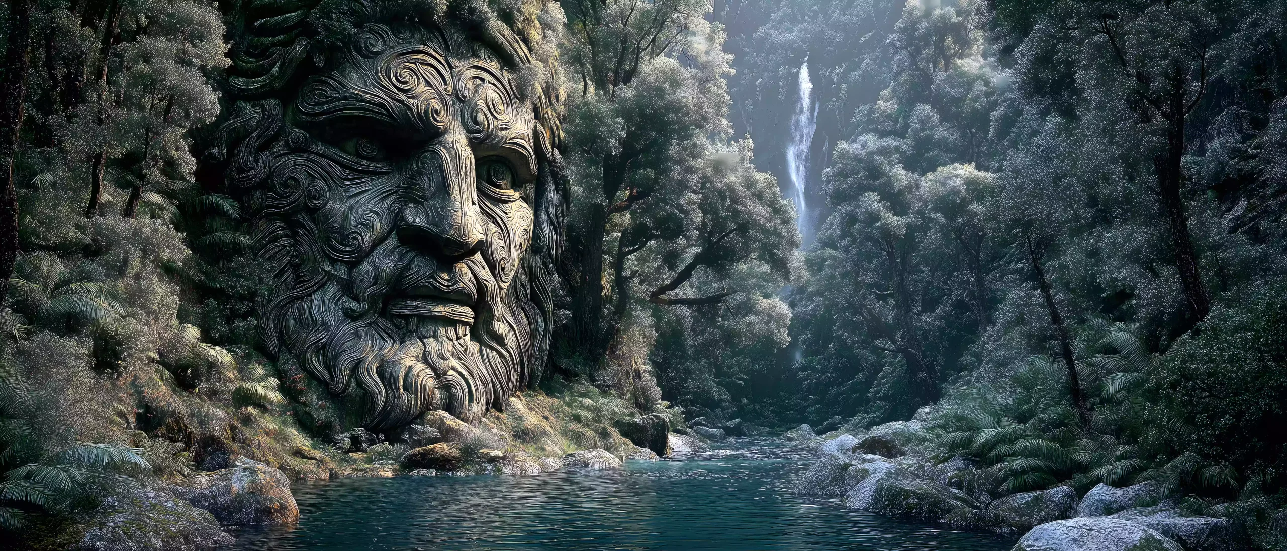 描述:《塔惠利火山泪》,关联毛利神话中山神塔惠利 —— 他掌控火山活动,火山既是毁灭力量,也是大地馈赠的源头。画面中,熔岩从山神面部沟壑流下(熔岩象征山神的情绪与力量,面部轮廓赋予神性人格化),泪痕蜿蜒形成怀卡托河(怀卡托河是新西兰最长河流,将山神力量与真实地理结合),胡须化作巨型红杉林(红杉是长寿且神圣的树种,体现 “毁灭后孕育生机”),泪滴结晶处浮现塔莫科纹面图案(塔莫科是毛利传统刺青,承载身份与历史,将神性与人文符号融合),展现 “山神联结地质、自然与文化” 的深层内涵。