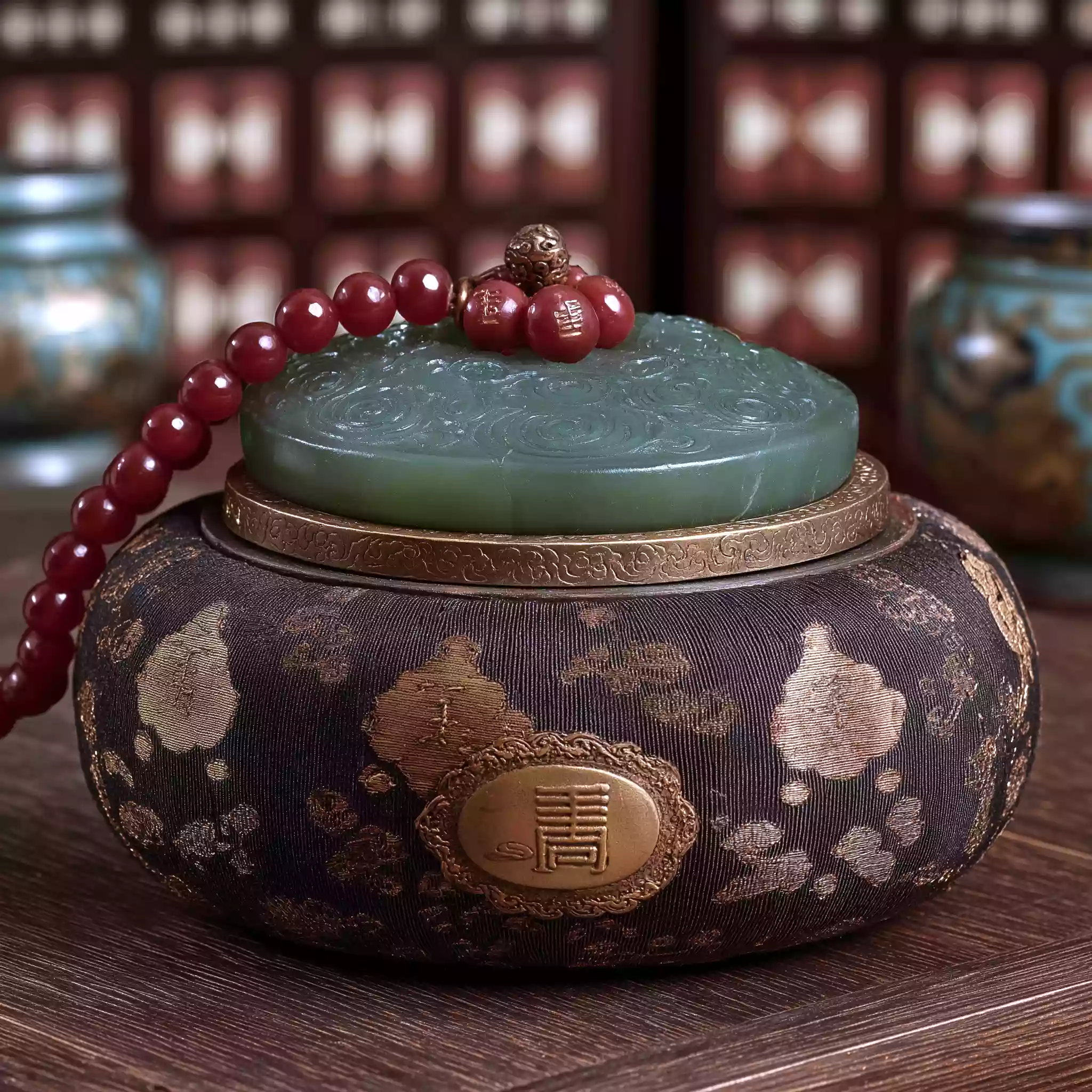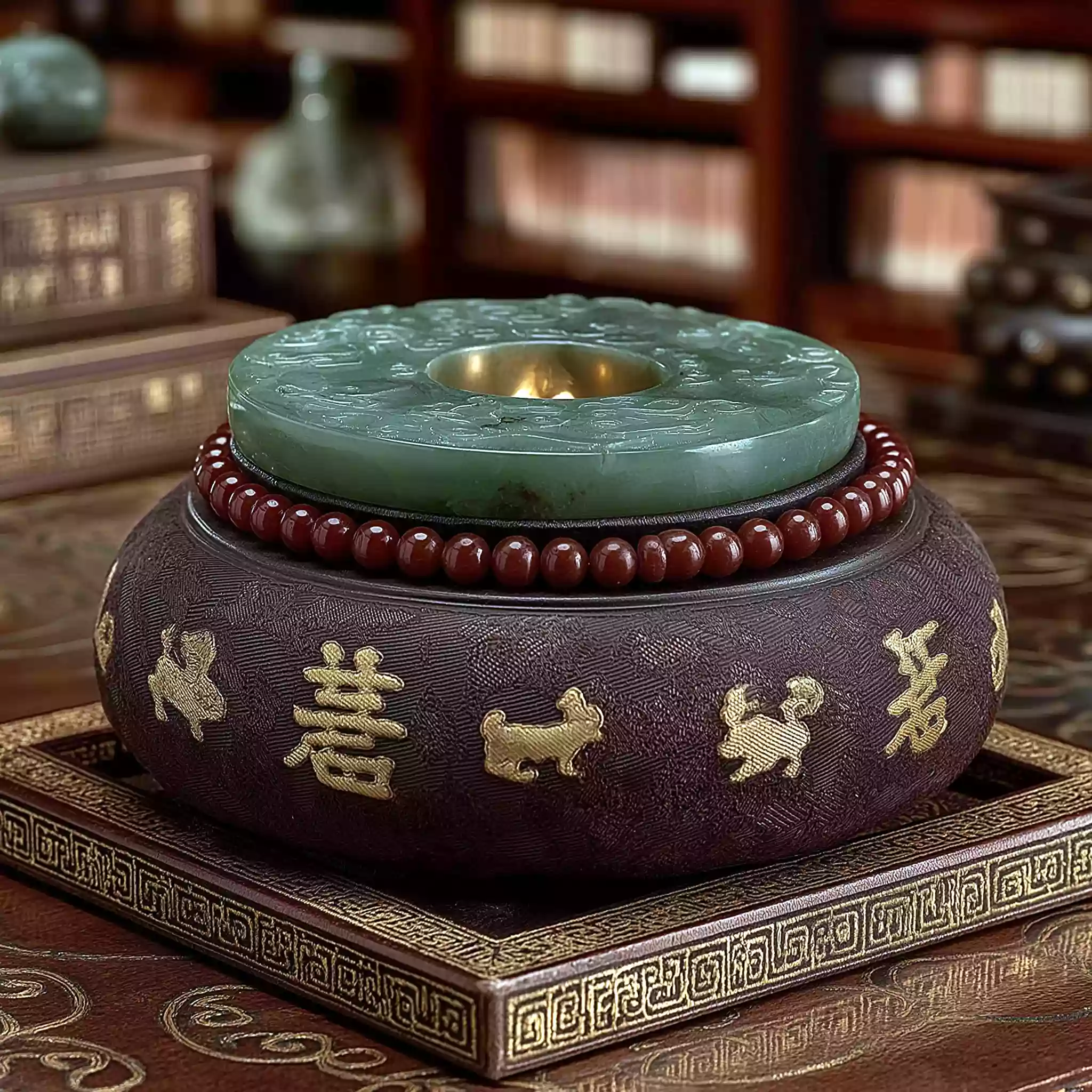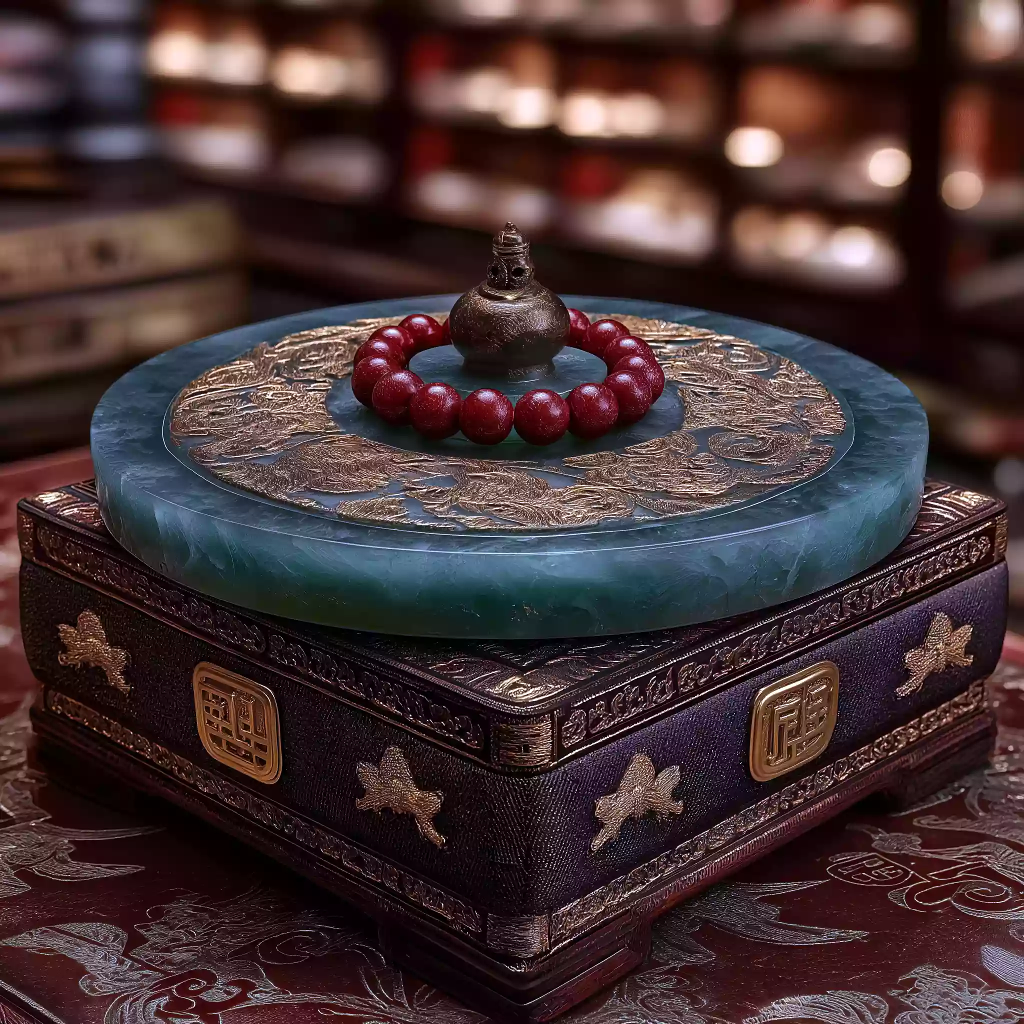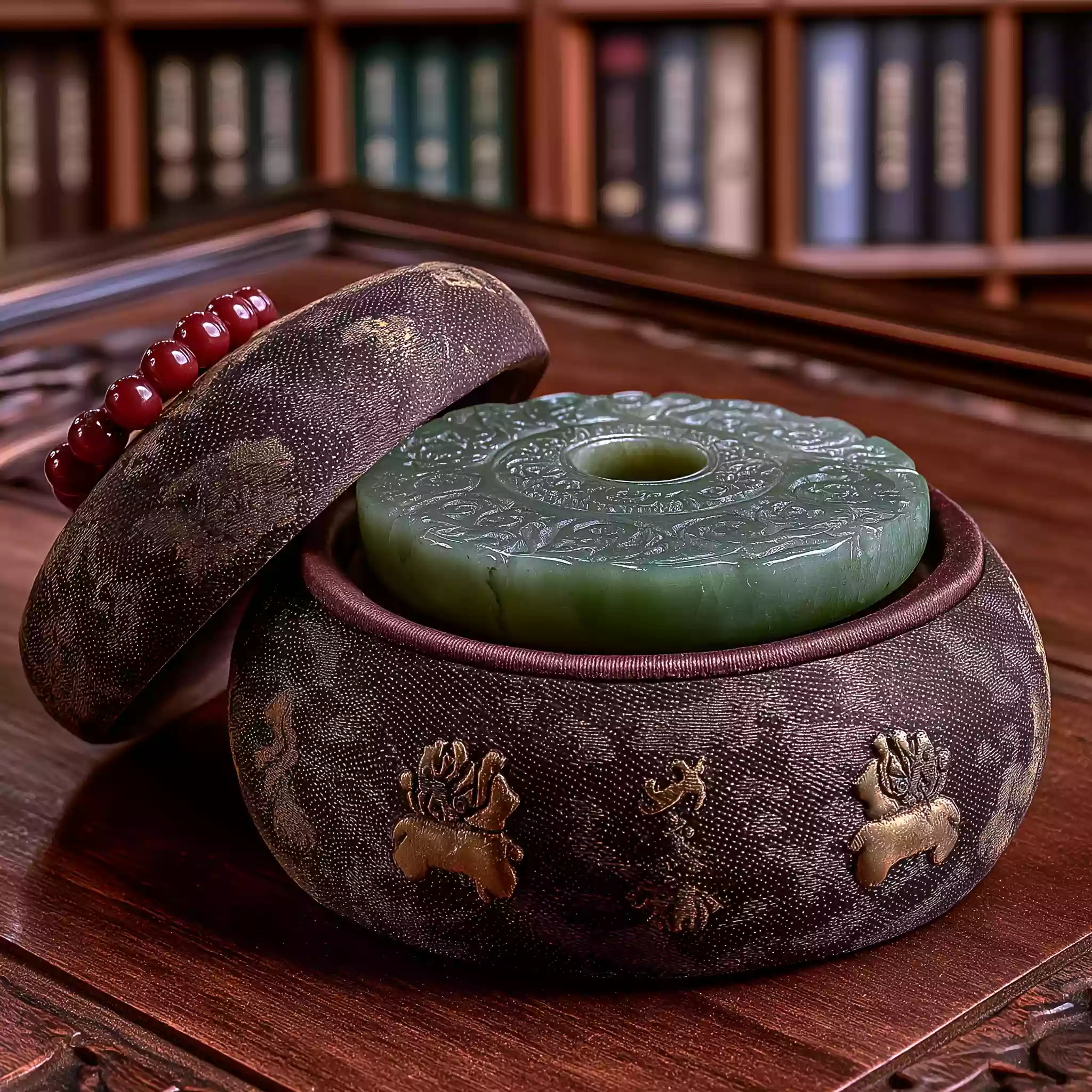 描述:《士族传家・玉璧载礼》,体现魏晋南北朝士族 “传礼守家” 的文化核心(士族以礼器彰显身份与家风)。画面以深棕锦盒为底(丝绸衬里绣金线云纹),中心淡绿玉璧(显通透质感与凸起谷纹),周围放 3 枚青铜爵(仅显简化轮廓与三足纹理),盒角散 2-3 颗红玛瑙珠(带细微裂纹)。玉璧圆孔透淡金微光,背景隐现黑书架剪影(架上有白书卷轮廓),顶光突出玉璧温润与传礼的厚重感。