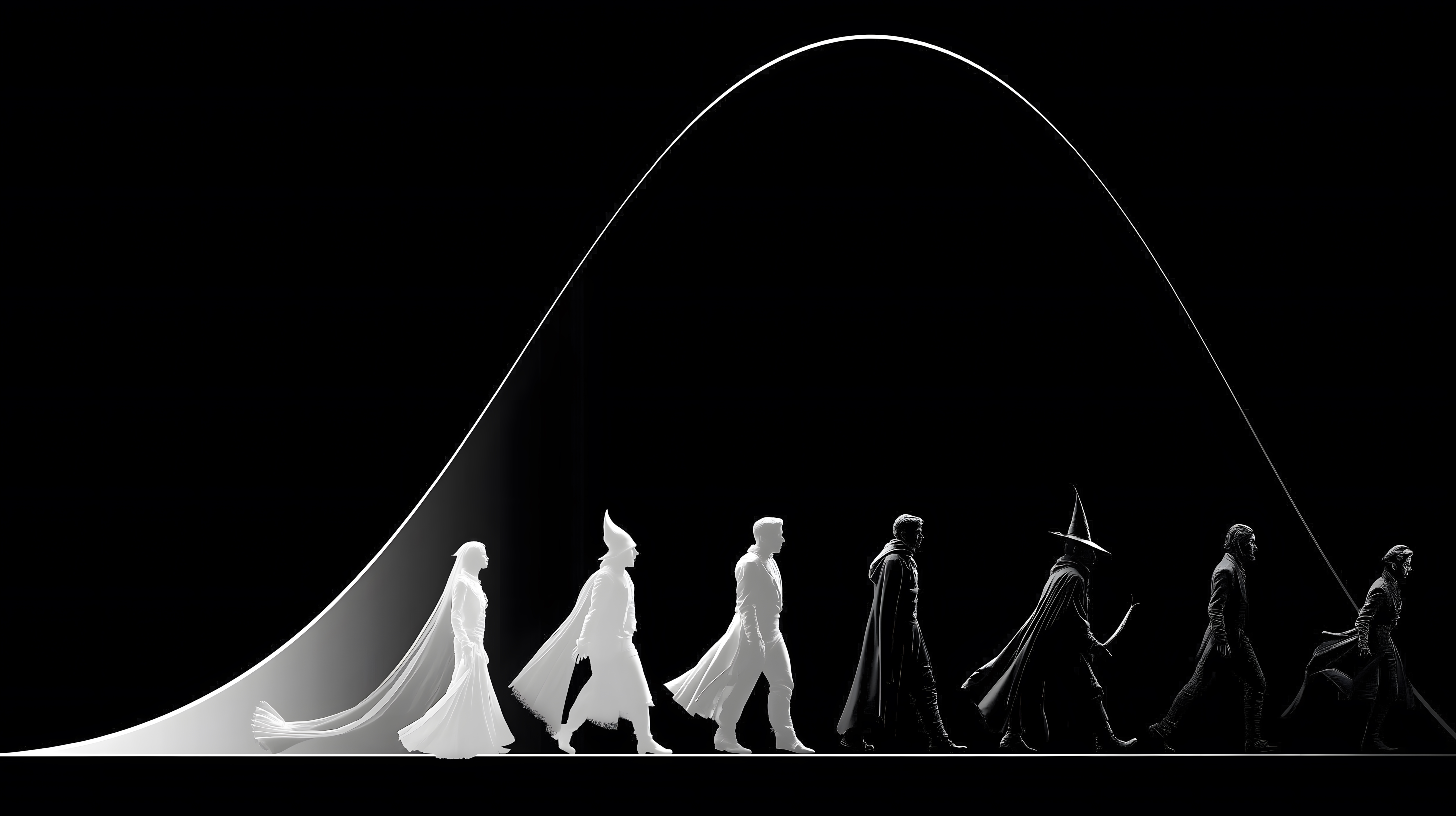 画面描述:解读坎贝尔“英雄之旅”的核心,将其提炼为通用叙事函数,简洁函数图中Y轴为英雄成长,X轴为旅程阶段,S型曲线呈现完整旅程,背景中不同文化英雄剪影完美贴合曲线,诠释所有神话英雄叙事的共同底层逻辑。