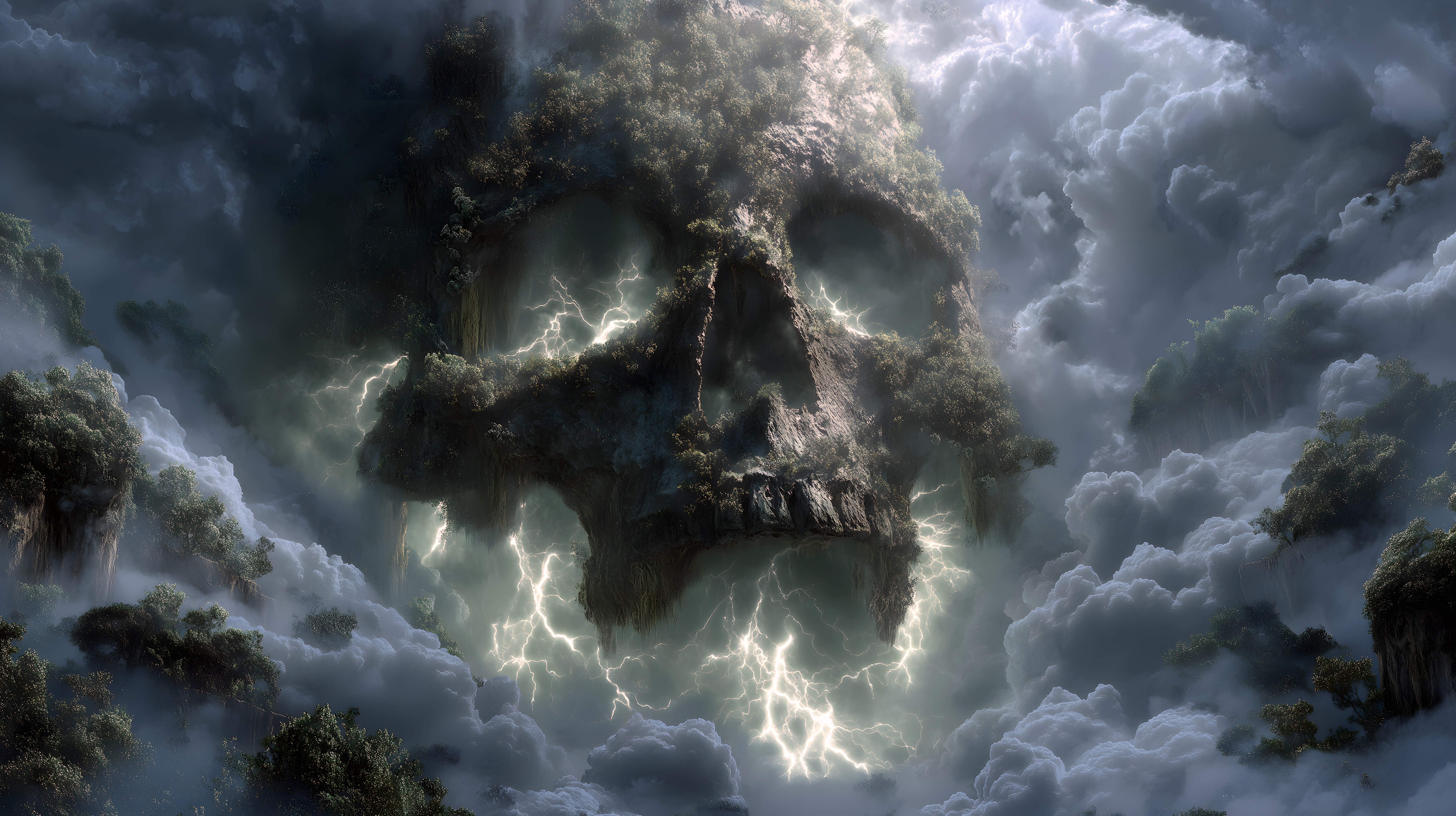 画面描述:闪电构成的巨人头骨悬浮雾海,眼窝喷射翡翠雷暴,下颚骨坠落的铁雨萌发橡树林,云层褶皱浮现三重螺旋图腾,象征凯尔特神话中巨人多南族与自然力量的融合。