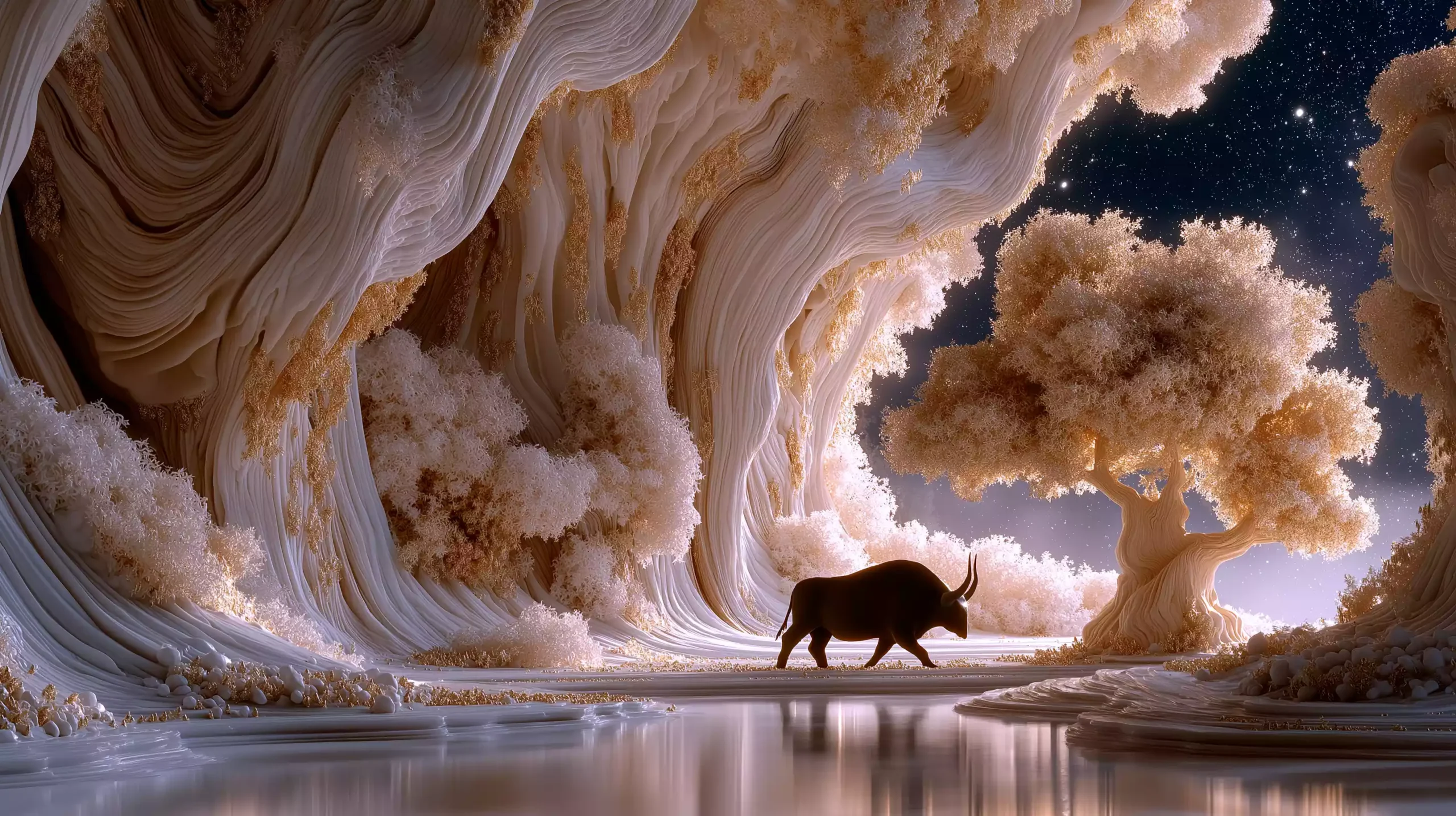 描述:《奥杜姆拉盐乳泉》,以 14-18 世纪对北欧创世神话的再诠释为背景,核心是宇宙母牛奥杜姆拉。母牛乳房状的冰川滴落乳白色溶液,接触盐岩后生长出黄金树根系(北欧世界树象征),乳汁蒸汽中漂浮着阿斯加德城廓的光影(神界居所)。画面将创世母牛的神话意象与黄金树、神界符号结合,让北欧创世传说成为承载 “生命起源” 的文化符号。