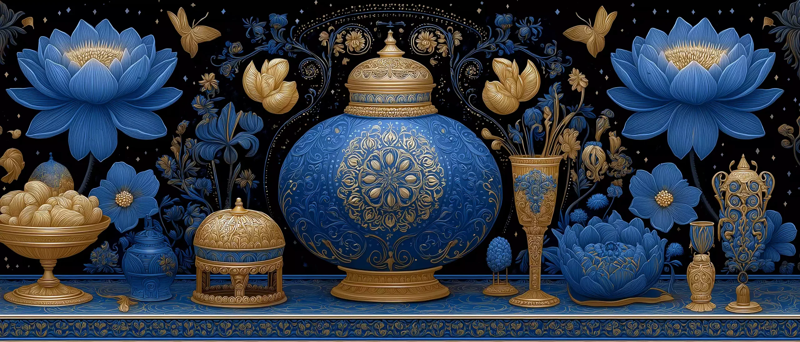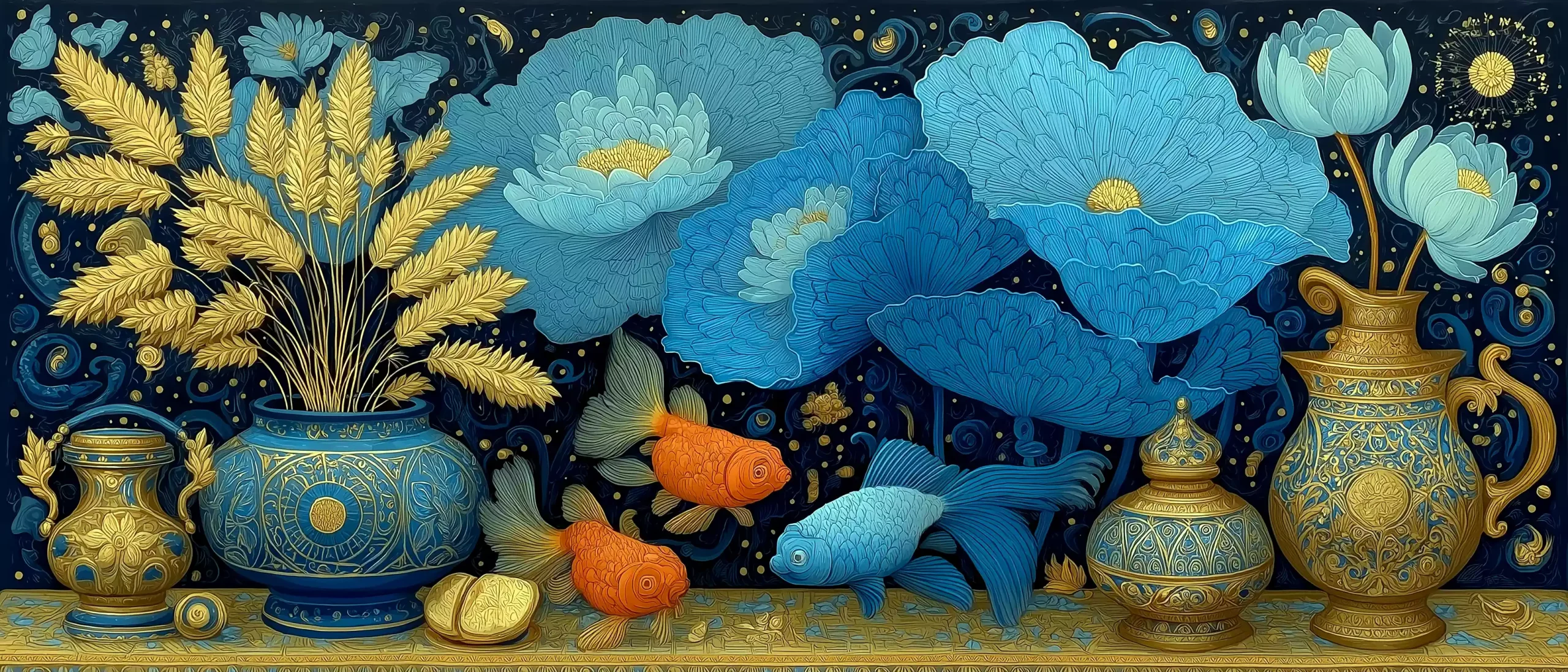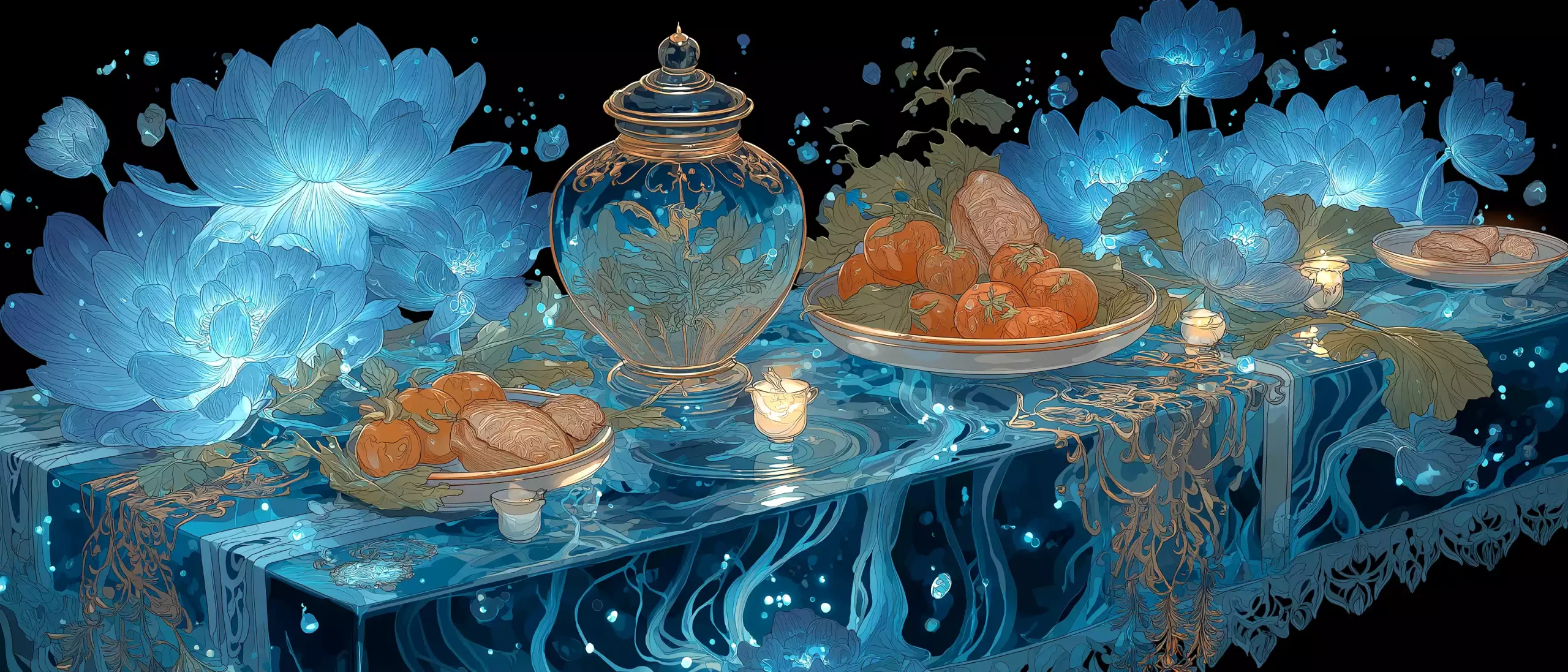 描述:《奥西里斯的冥界盛宴》,依托公元前 3100 年 – 公元前 332 年古埃及冥界信仰,暗蓝色冥界空间中,长桌虚影上摆放刻 “丰饶” 象形文字的金色食物符号(面包、水果、酒罐)。桌两端对称分布权杖与连枷虚影(奥西里斯象征),半透明亚麻桌布印麦田纹,上方漂浮沾银光粒的莲花虚影。画面以盛宴意象展现冥界的富足,呼应奥西里斯掌管来世丰饶的神性。
