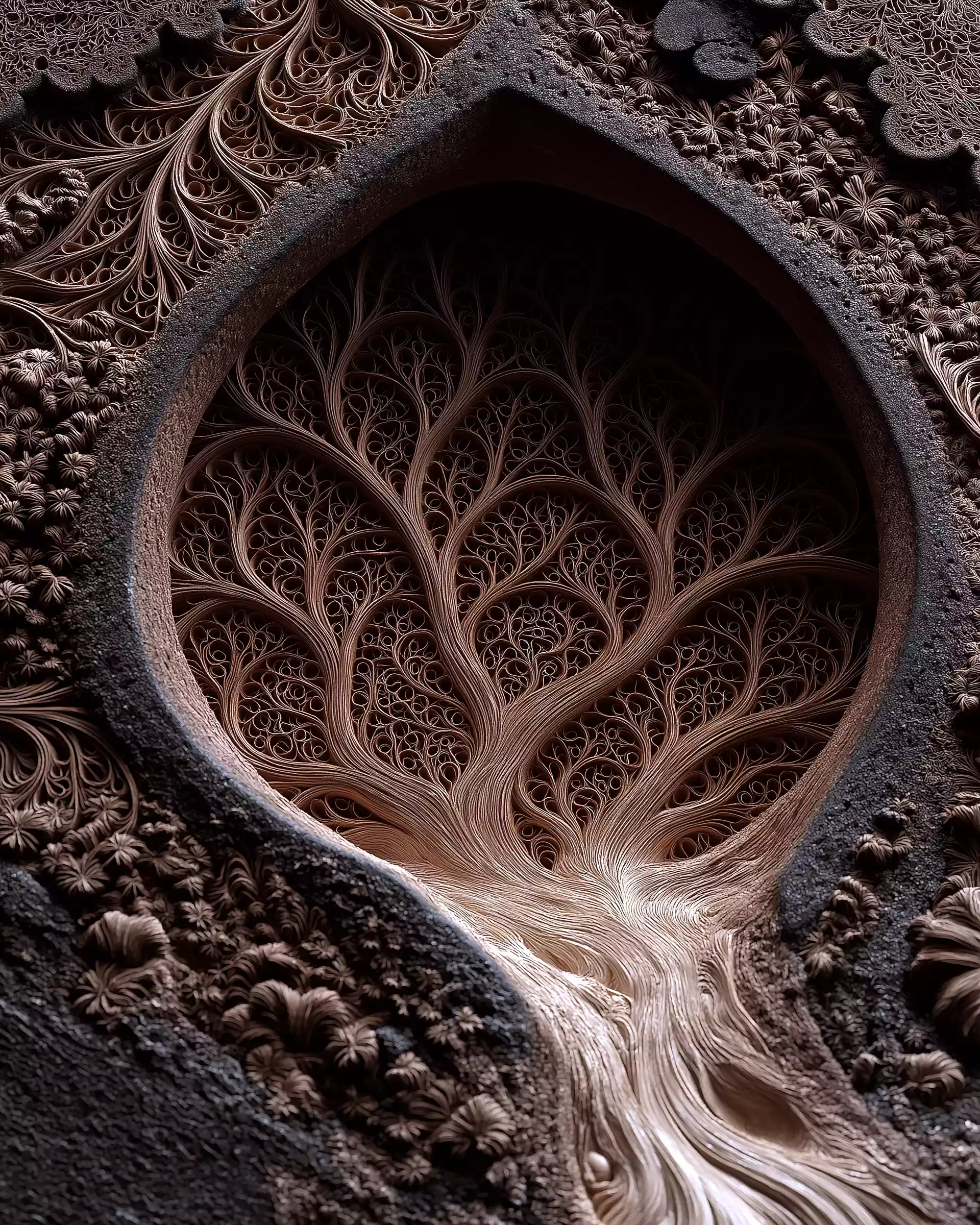 描述:《宁胡尔萨格的生育图腾》,以两河流域生育女神神话为背景,巨型陶制子宫结构内壁刻满胚胎楔形符,脐带状藤蔓连接外部发光麦穗群。地面渗出的乳白液体形成新生河系,将子宫、胚胎、麦穗与河系等意象结合,展现宁胡尔萨格掌管生育、滋养生命与农耕的神性,呼应文明孕育的内涵。