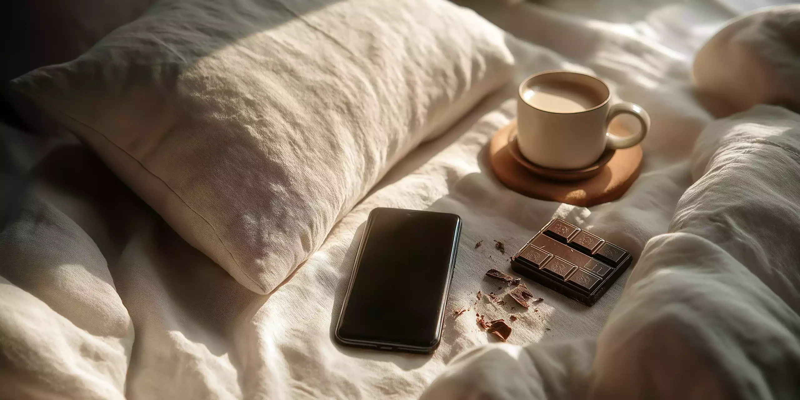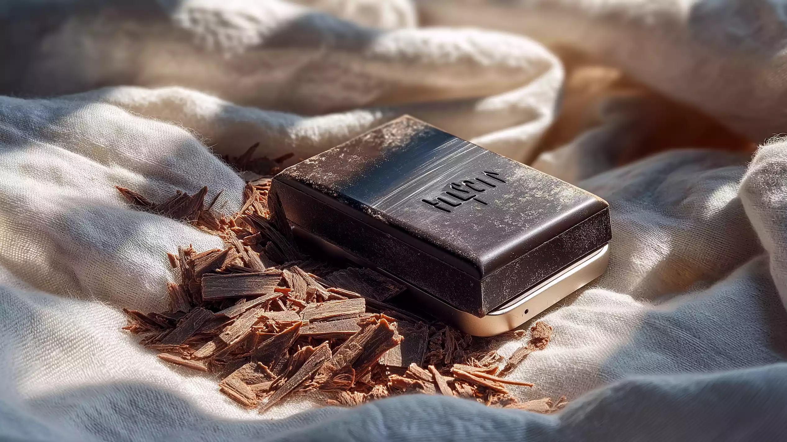 描述:柔和晨光洒落在浅米色织物上,纹理轻柔的织物托着一枚深色方形物件,物件表面沾有细微粉末且刻有字符,周围环绕巧克力碎屑,光影交错间,整体氛围精致且充满清晨仪式感的温暖质感。