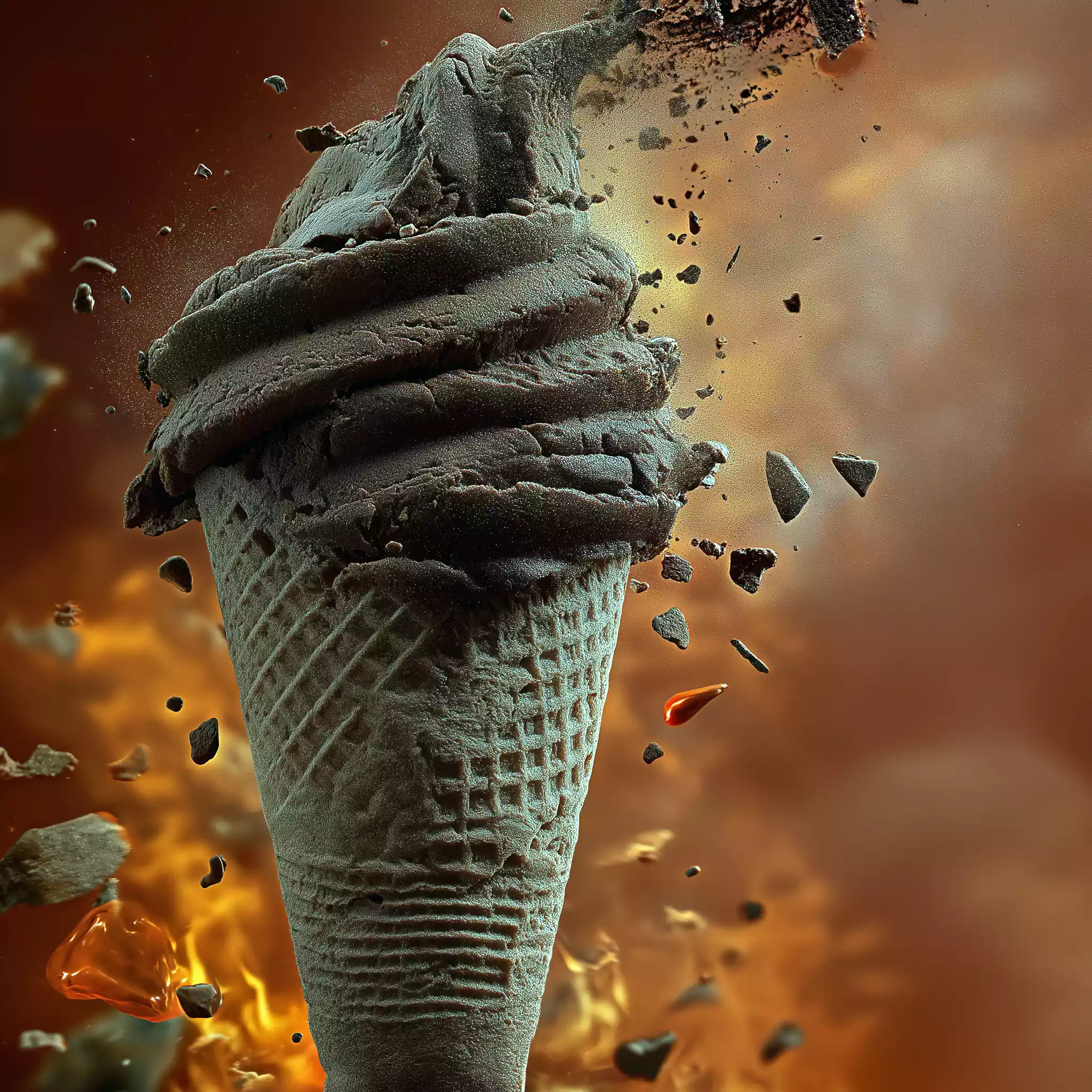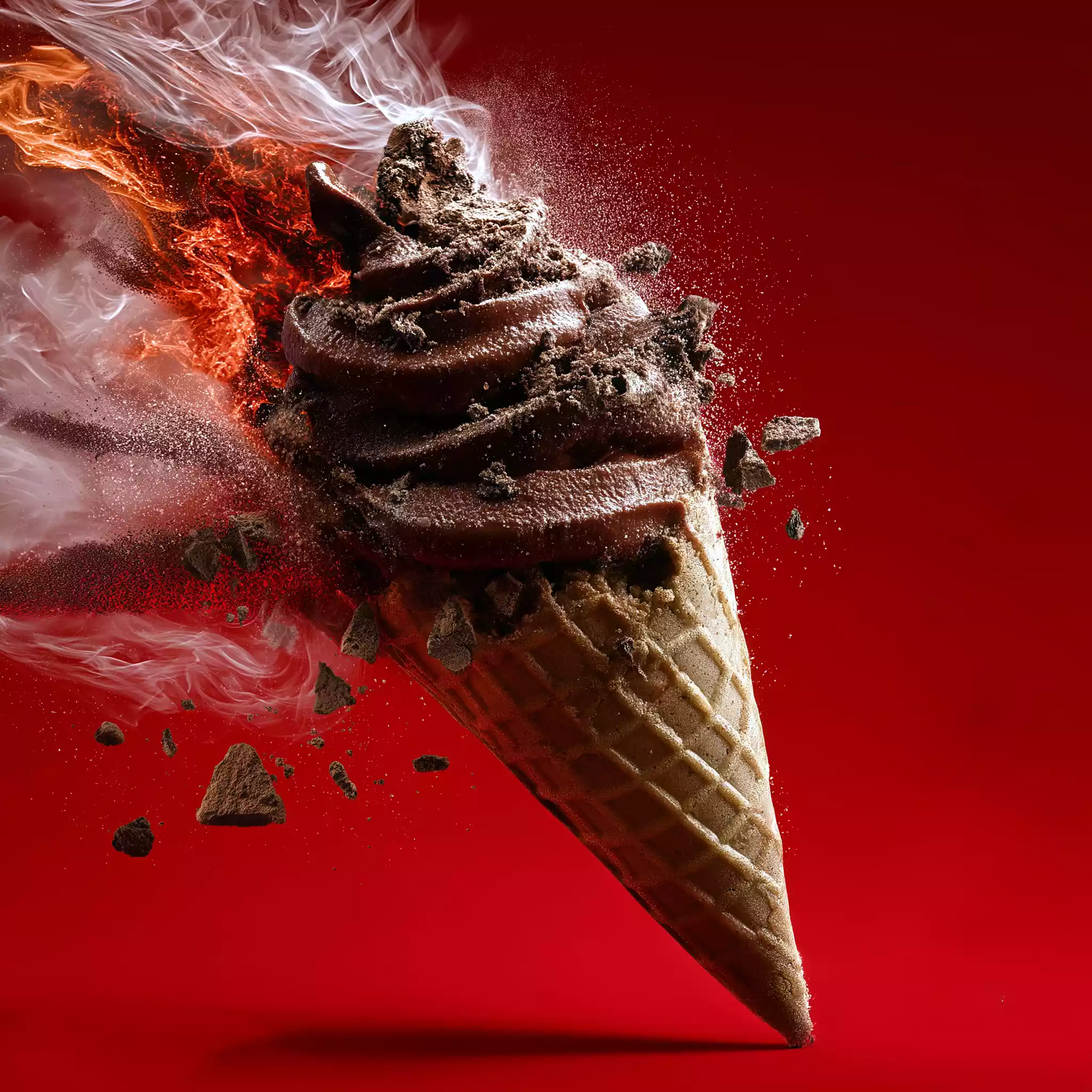 描述:《辣味可可:玛雅火焰重生》,辣椒粉在玛雅象形文 “ik-al kakaw” 中迸发火焰,点燃现代辣椒巧克力冰淇淋杯;杯壁裂纹显西安古城墙纹样,火红与墨黑光影显 “古老配方激活当代味觉”。