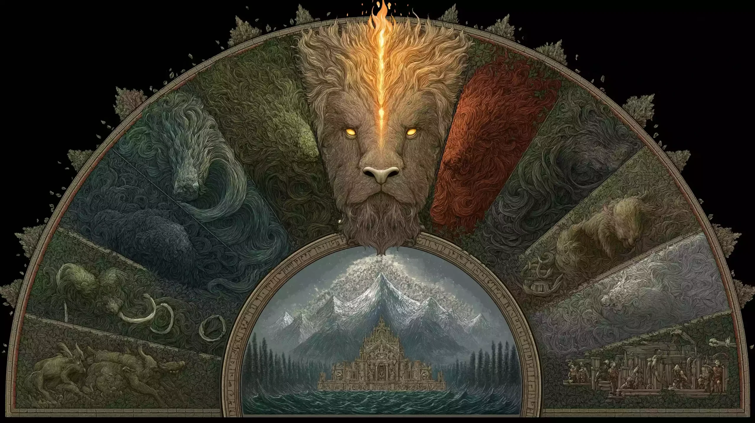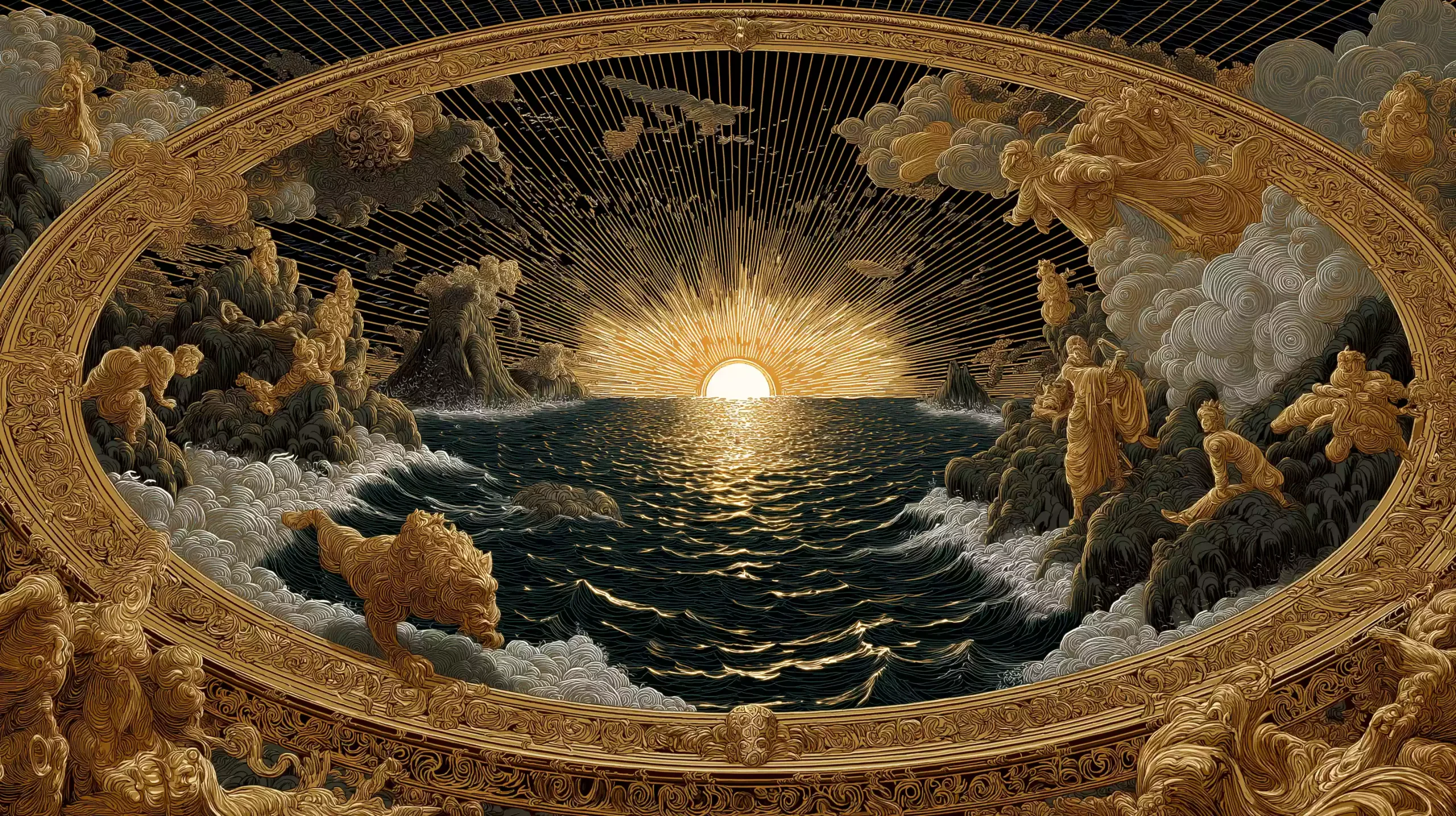描述:《赫拉克勒斯的十二项功绩》,画面以圆形布局呈现十二个小型抽象场景,分别刻画尼米亚雄狮、九头蛇海德拉等标志性壮举,场景间由闪烁的金色能量线相连,整体笼罩在象征荣誉与成就的璀璨金光中,叙事性与视觉感兼具。