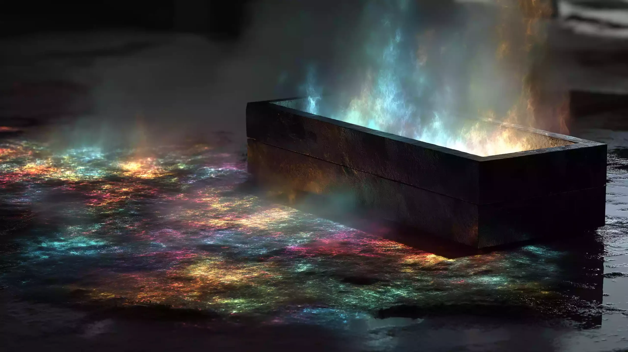 描述:《潘多拉的盒子》,神秘的黑色盒子光影居于画面中心,盒盖打开处喷射出五彩斑斓的希望与灾难混合光影,周围环绕闪烁的神秘符文,潘多拉魔盒的未知感与宿命感通过光影诠释。