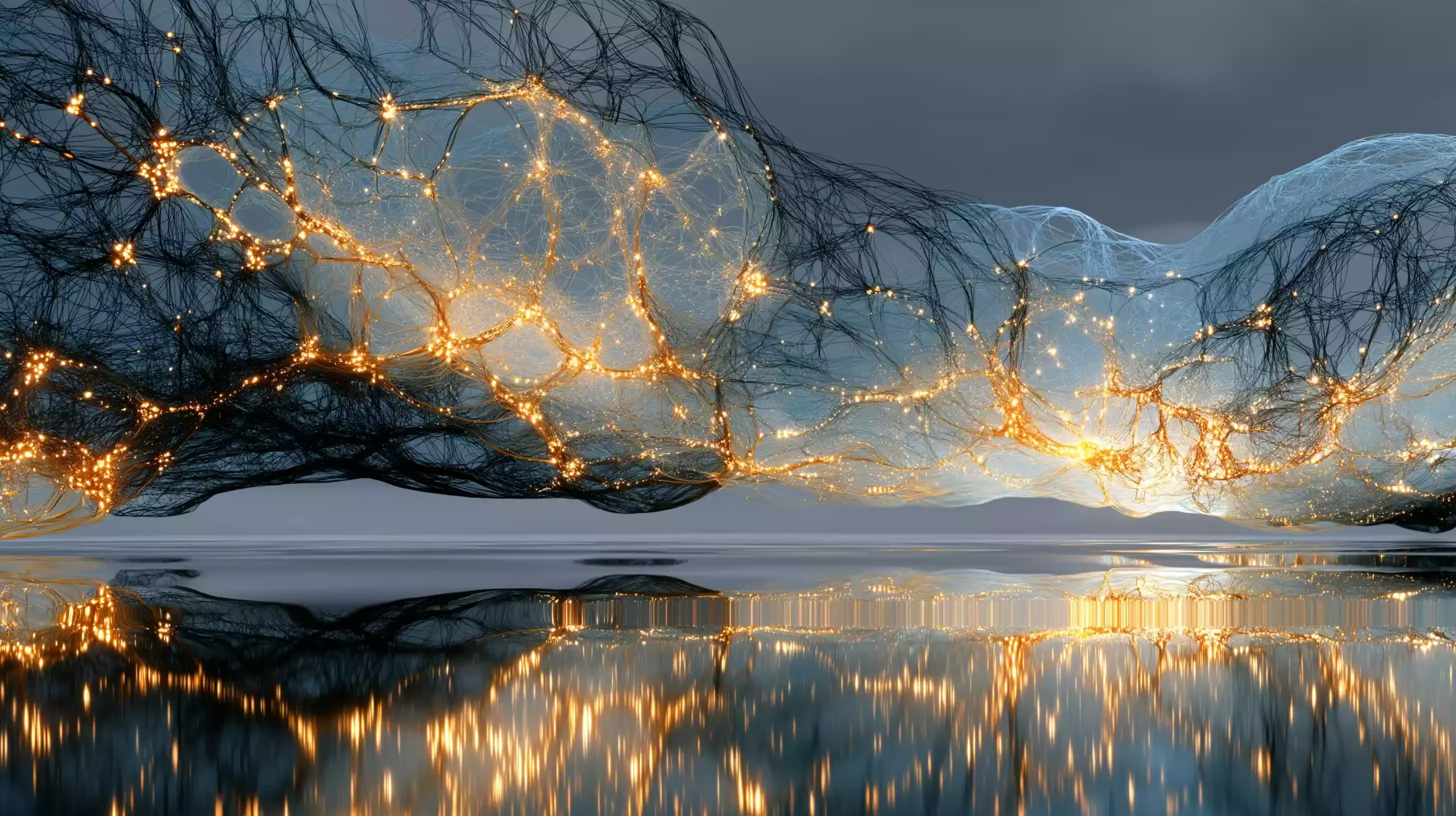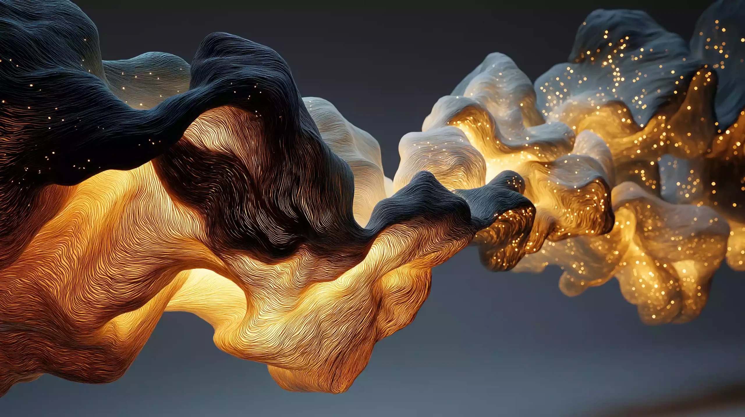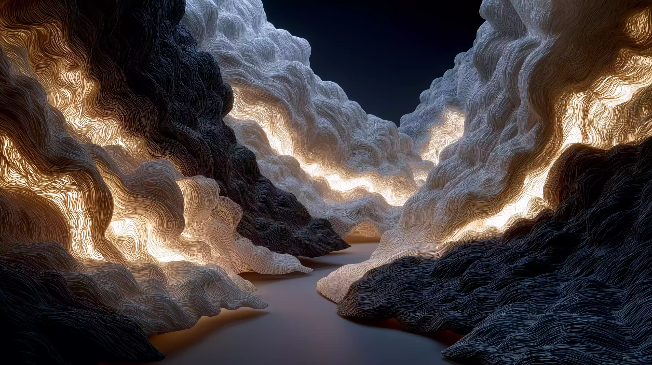 描述:《命运三女神的丝线》,银色、金色与黑色的丝线状光影在空中交织缠绕,编织成复杂的命运图案,光影流转间凸显丝线的灵动与坚韧,以抽象形态诠释命运交织的深刻寓意。