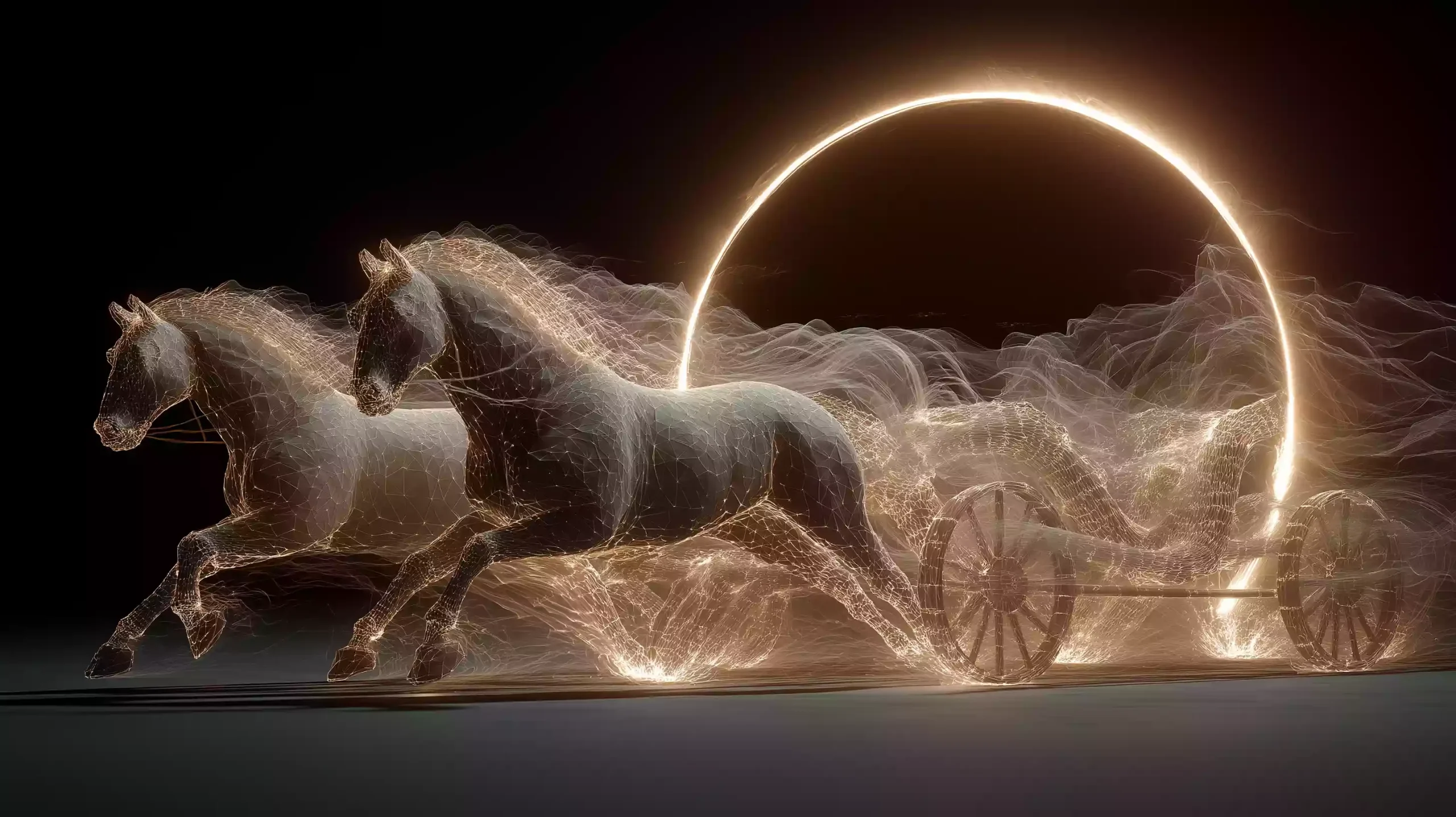描述:《阿波罗的太阳战车》,金黄色光芒勾勒出战车轮廓,几匹奔腾的马状光影牵引前行,周围环绕火焰般光晕与旋转的太阳粒子,太阳耀斑光影效果强化光明感,以动态光影传递阿波罗驾驭太阳的神圣与活力。