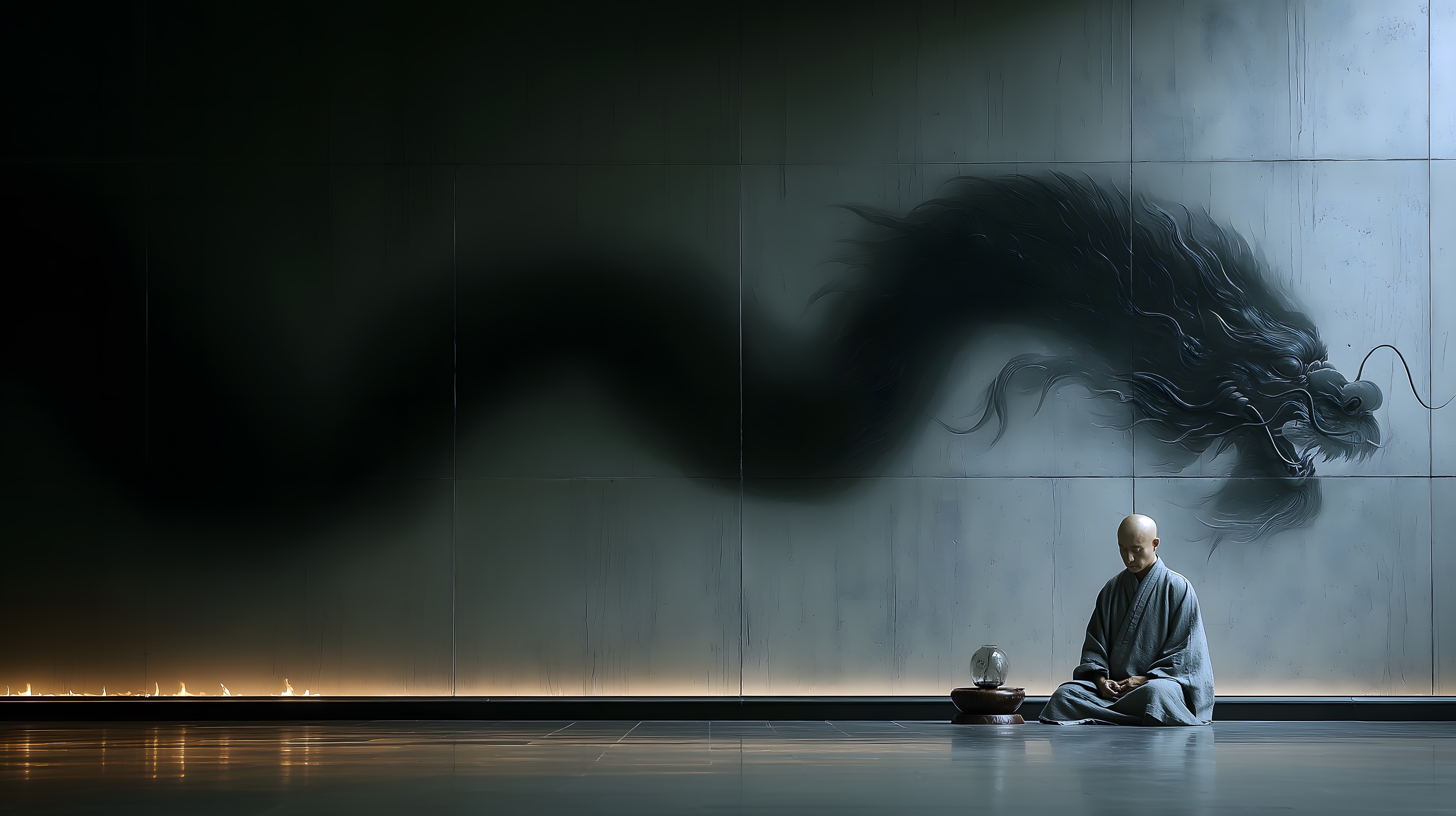 画面描述:极简当代禅意空间,70岁老僧身着灰色棉麻僧袍盘腿静坐,手持线条流畅的现代金属锡杖。空间一角,半透明黑烟勾勒的龙形意象匍匐驯服,极简混凝土墙面搭配天光洒落,画面干净空灵。以现代美学诠释佛教度化向善的内核,融合传统信仰与当代设计,兼具禅意与文化底蕴。