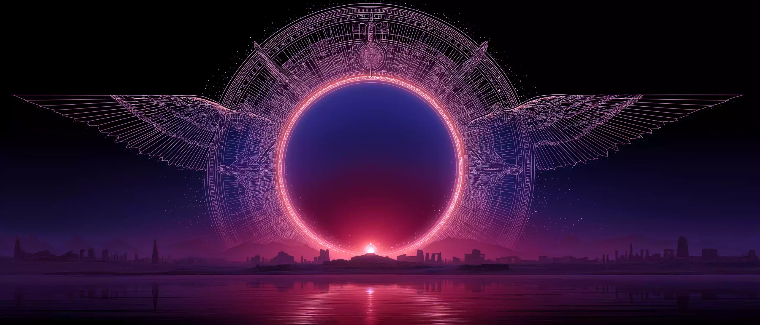 描述:《拉的重生》,基于公元前 3100 年 – 公元前 332 年古埃及太阳神信仰与 “永恒轮回” 核心,金色太阳圆盘从暗紫色冥界地平线升起,边缘泛橙红光晕,内藏甲虫虚影(凯布利,拉的重生化身)。圆盘下方黑色蛇形能量(阿佩普尸体)被光芒灼烧出缺口,地平线处青绿色尼罗河虚影反射光芒成 “重生之镜”。画面诠释拉击败混沌、每日复活的循环叙事。