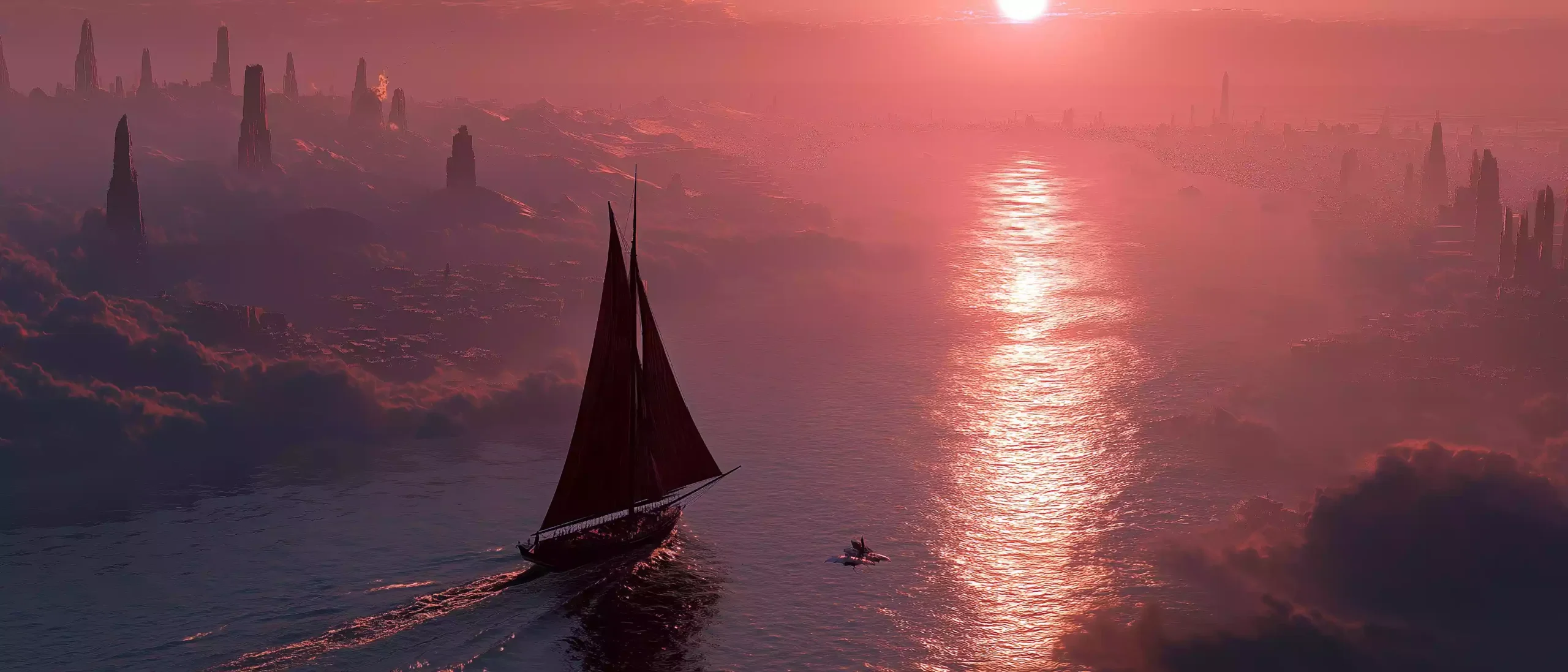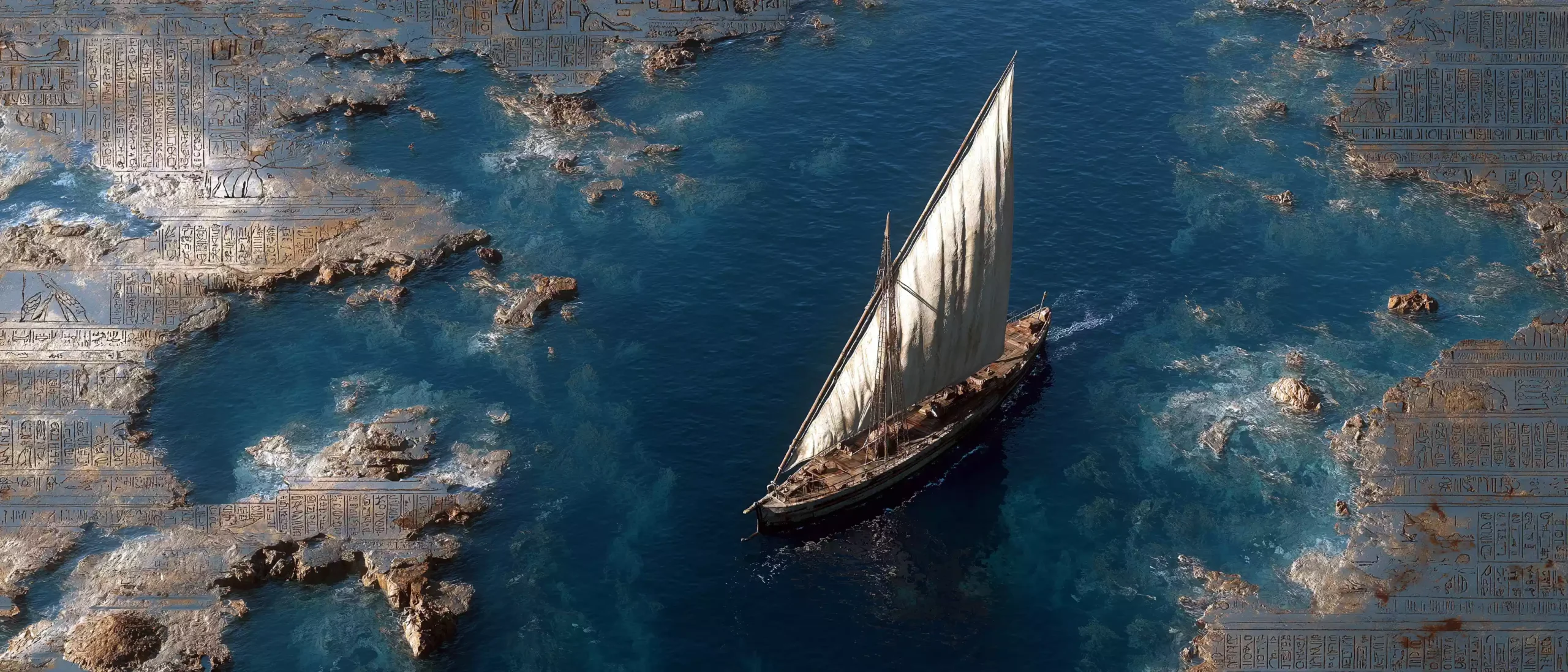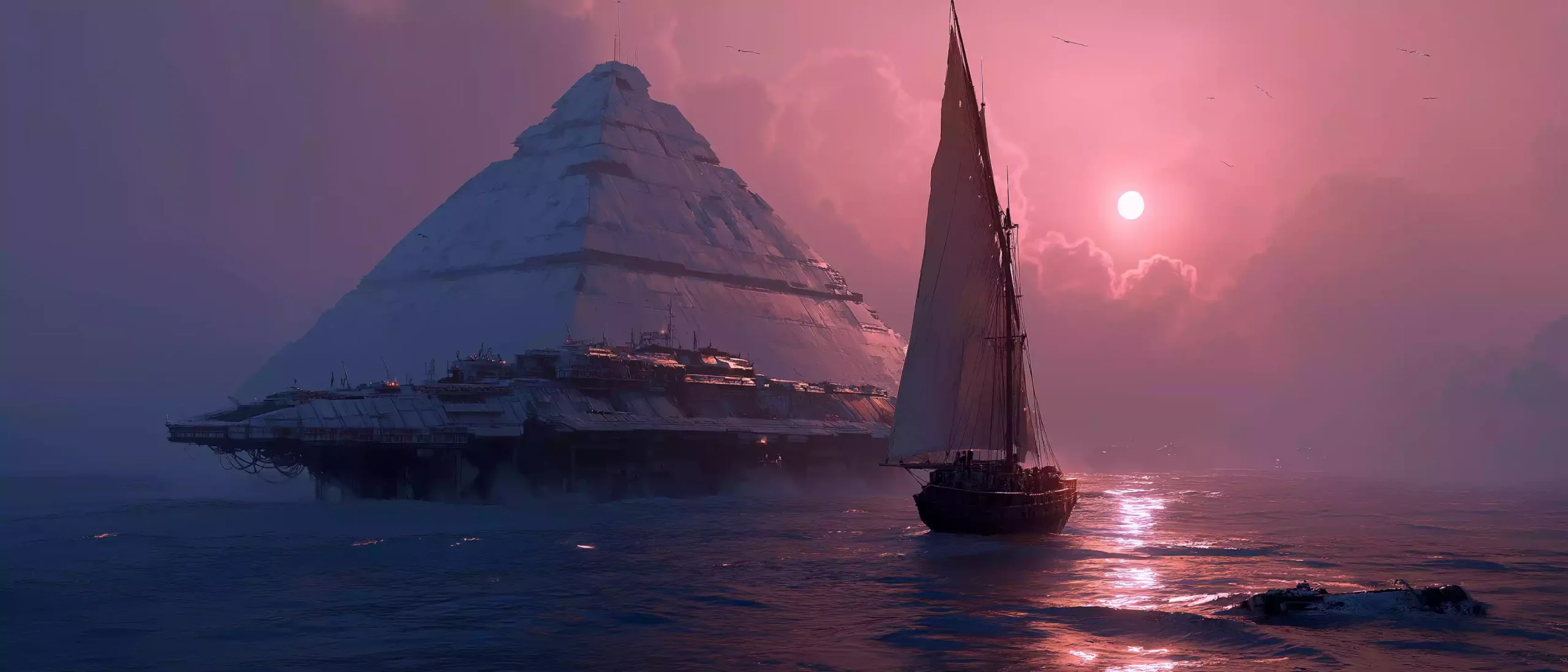 描述:《拉神夜舟沉没》,以公元前 3500 年 – 公元前 539 年古埃及拉神夜航神话为背景,太阳舟在混沌海(努恩)中倾斜,甲板圣书体剥落(象征秩序暂失),船首像被混沌巨蛇阿波菲斯缠绕下拽(还原拉神与混沌的永恒对抗)。船尾透出微弱的黎明探测器光束(呼应拉神次日重生的循环)。画面捕捉 “黑夜危机” 瞬间,诠释古埃及 “秩序对抗混沌” 的宇宙观。
