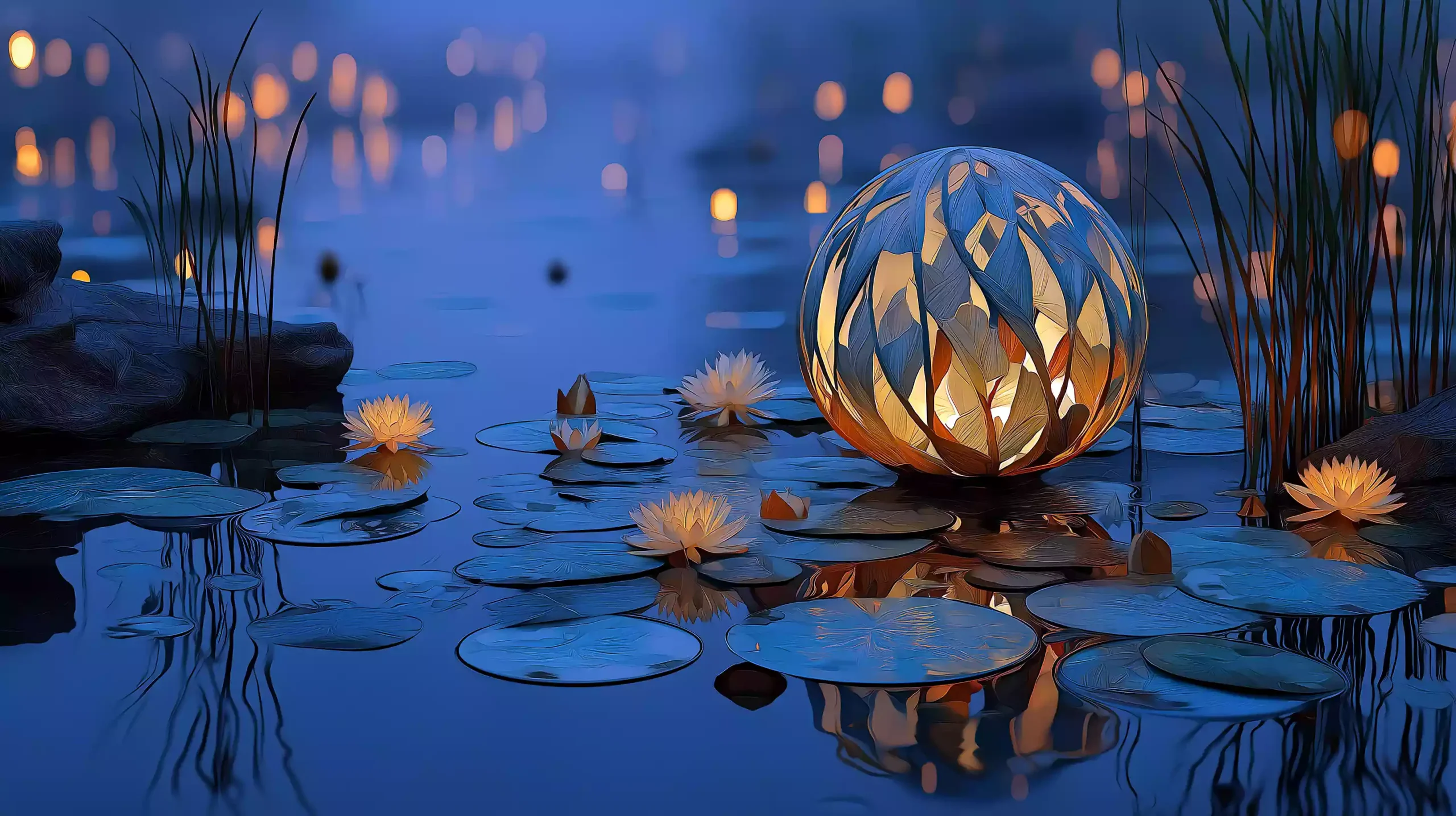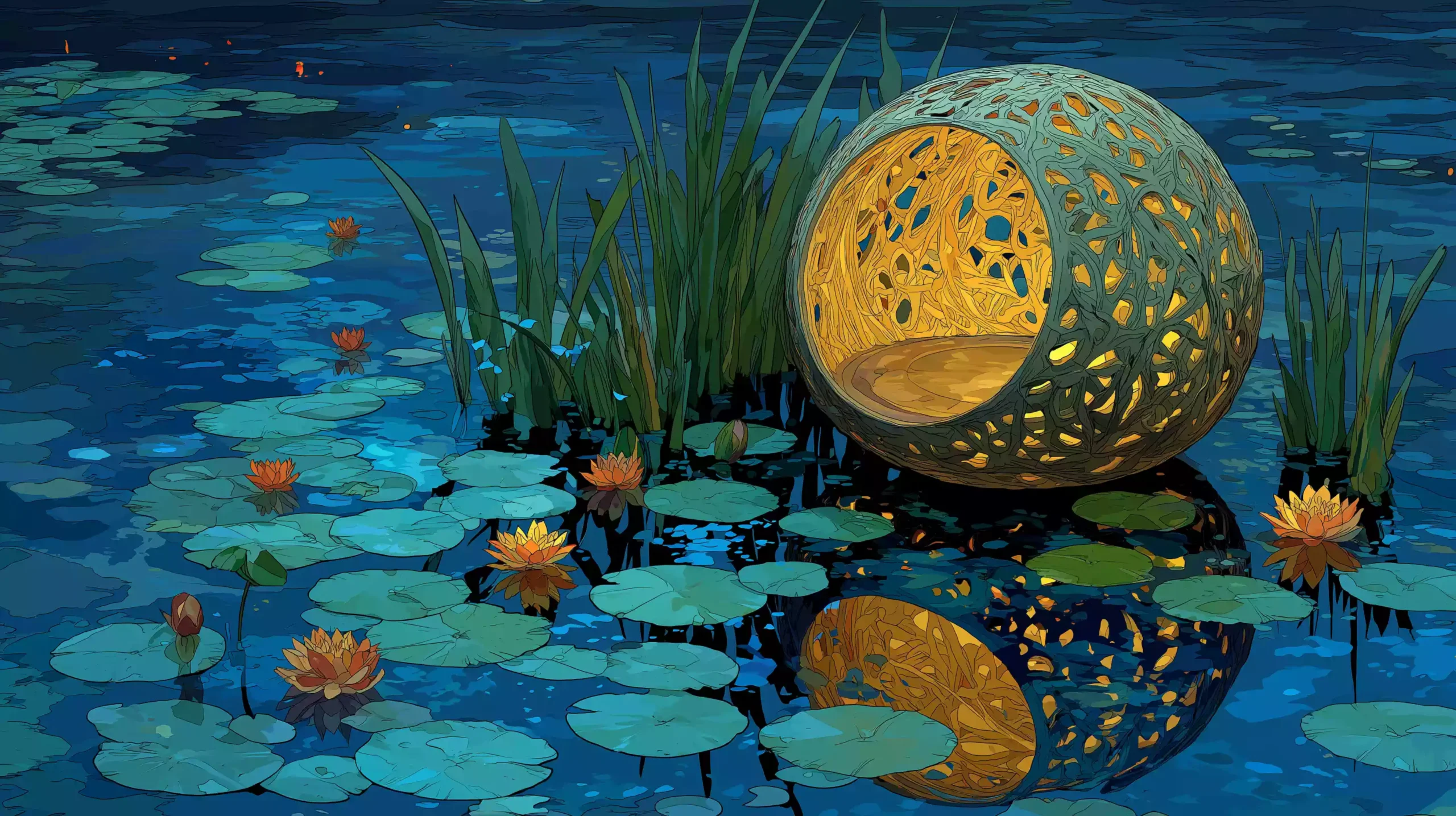 描述:《方舟微光》,公元前 3000 年 – 公元前 8 世纪两河流域洪水神话语境下,暴雨中藤编纹理球体悬浮洪水中,细密编织纹路的缝隙透出暖黄微光,象征幸存者的生命火种。球体缠绕芦苇、睡莲等苏美尔湿地典型水生植物,如自然的庇护屏障。水面反射微光成破碎光斑,水天交界处泛黎明鱼肚白。画面在阴沉洪水中藏希望,诠释该时期《吉尔伽美什史诗》洪水母题中生存与庇护的核心意象。